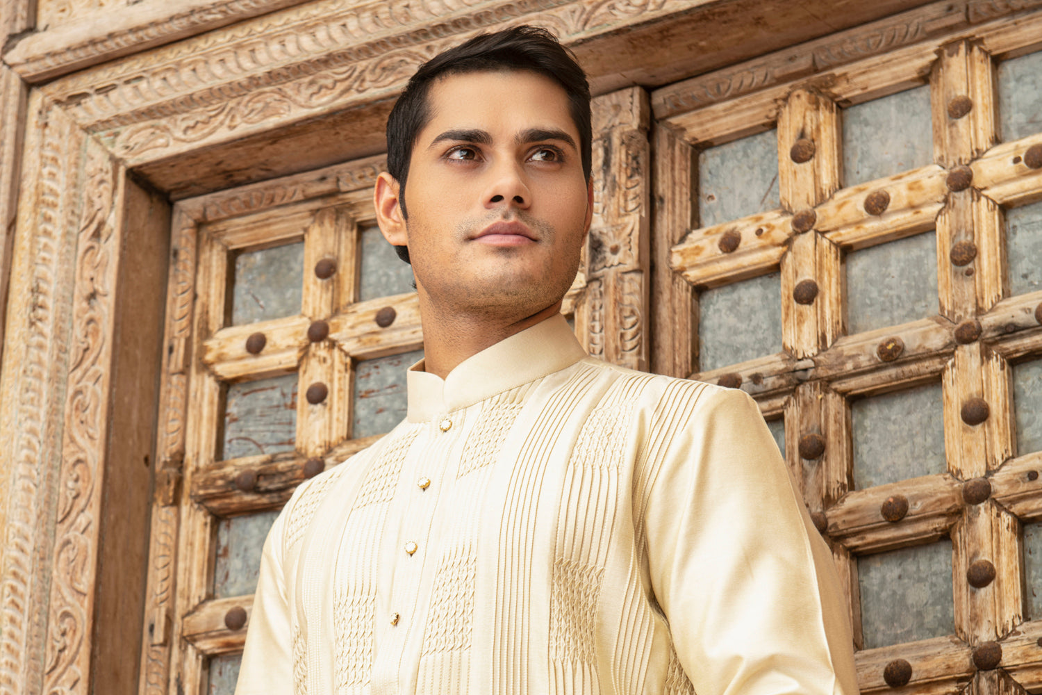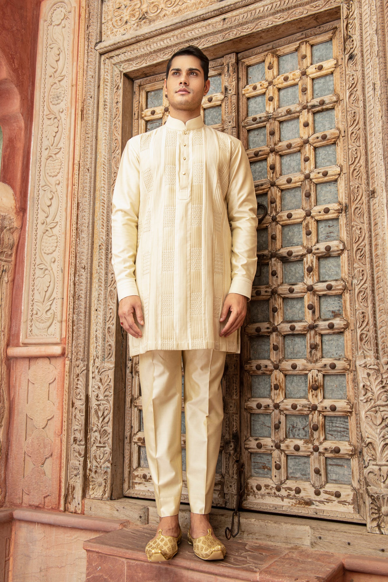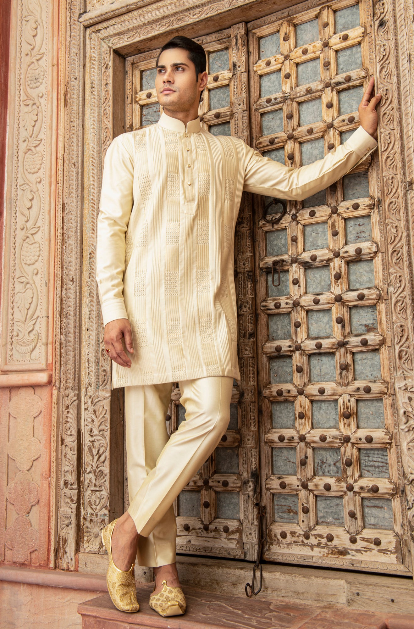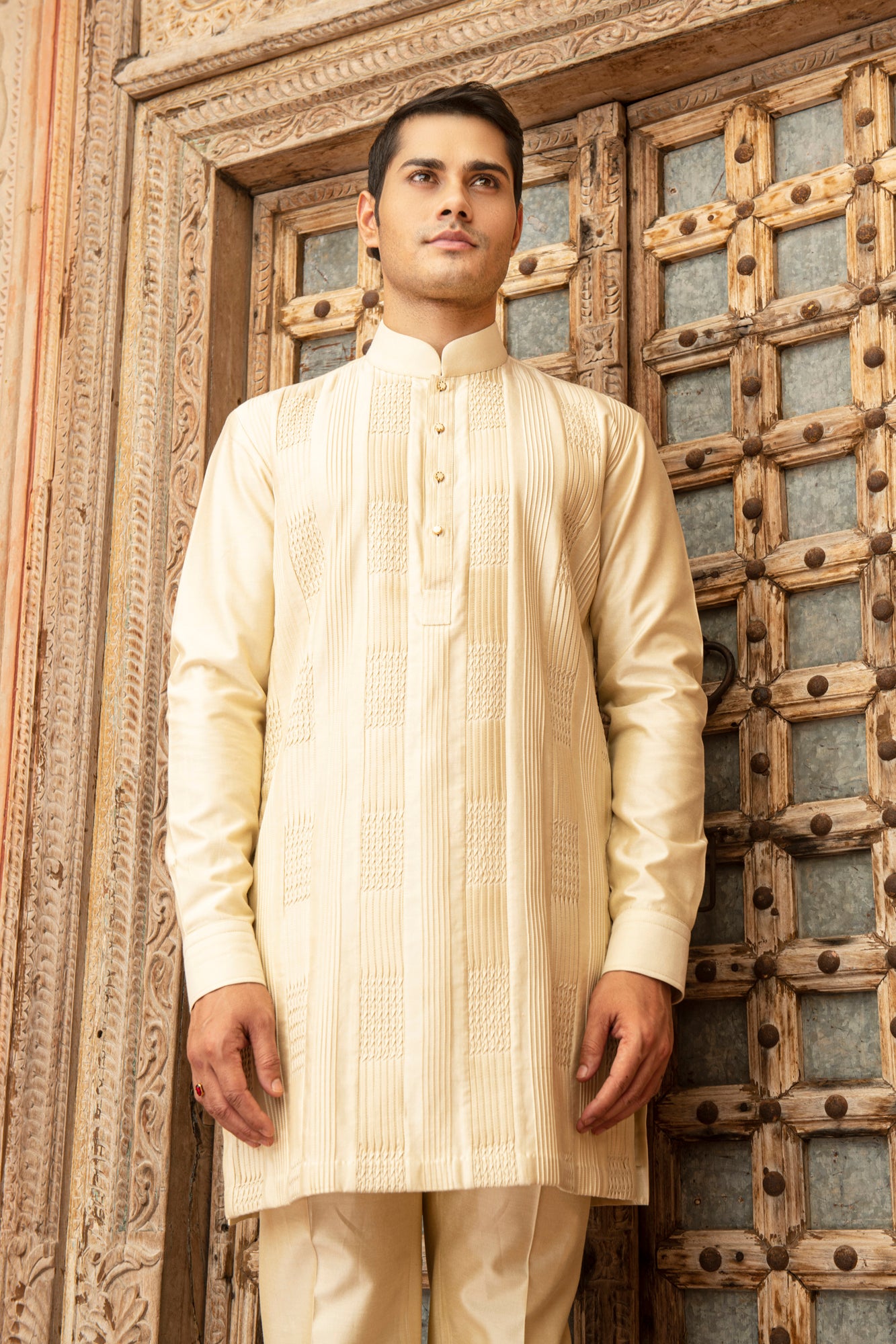 Featuring a beige kurta in katan silk base with pintucks. It is paired with pants. Accessorize this set with a pair of loafers for festive occasions.