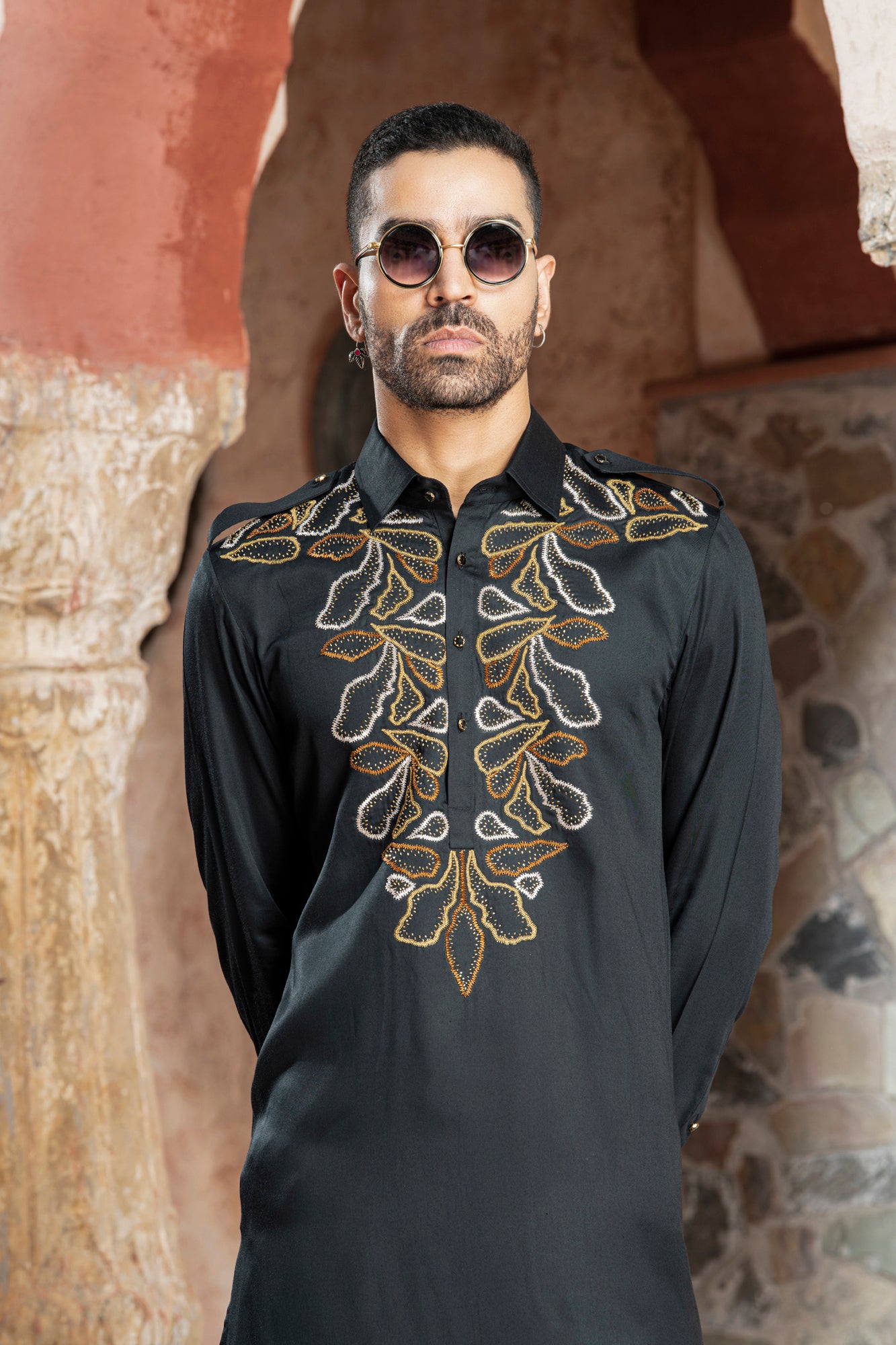 Featuring a black afghani kurta in modal satin base with zardosi and aari embroidery. It is paired with cowl salwar pants. Accessorize this set with a pair of loafers for festive occasions or sangeet ceremonies.