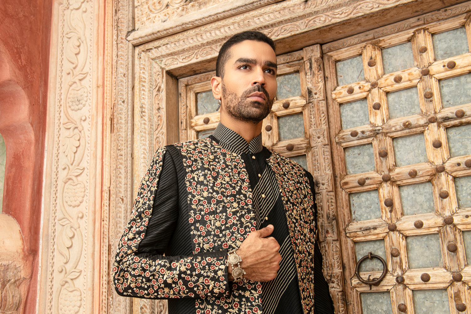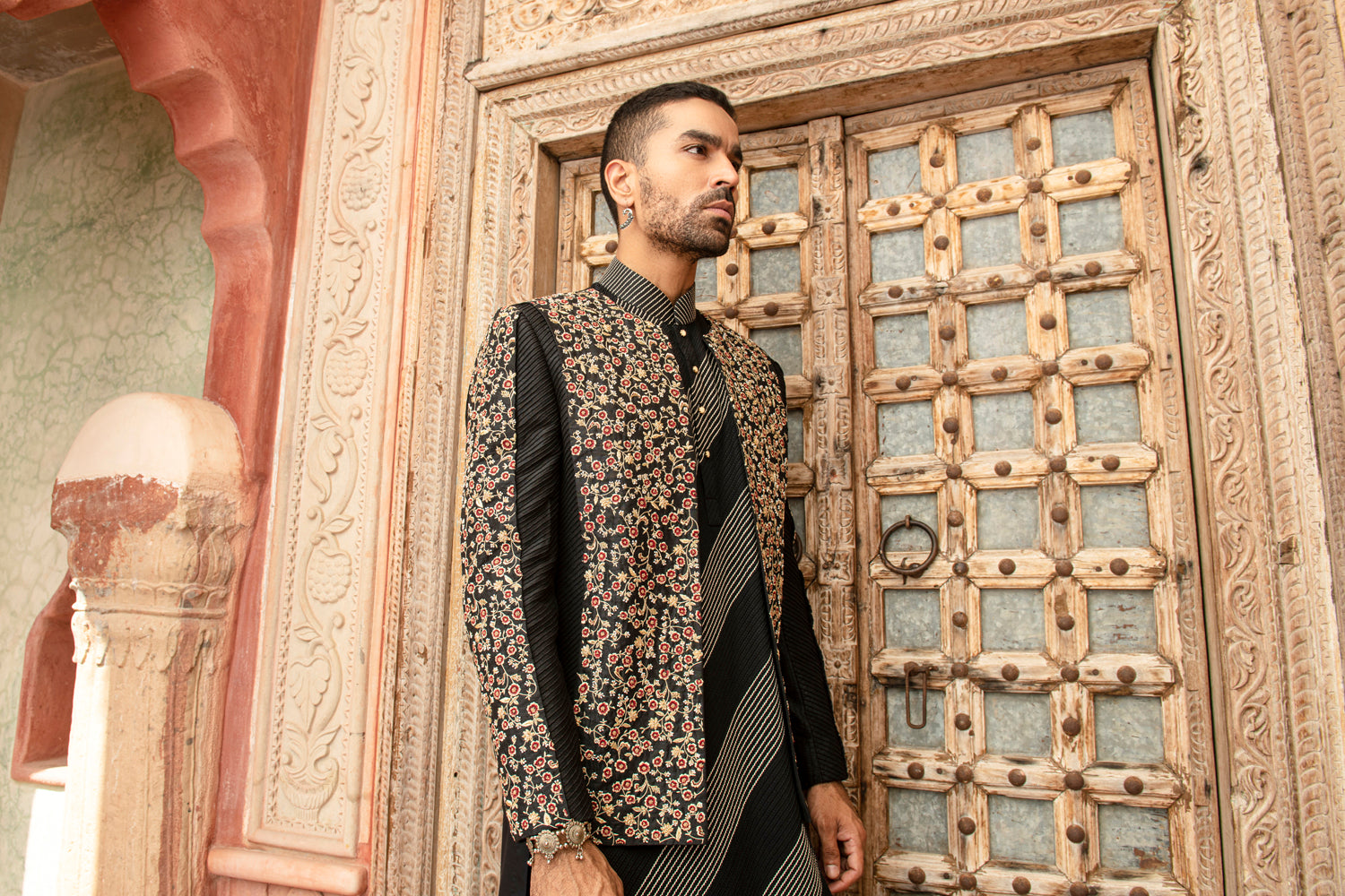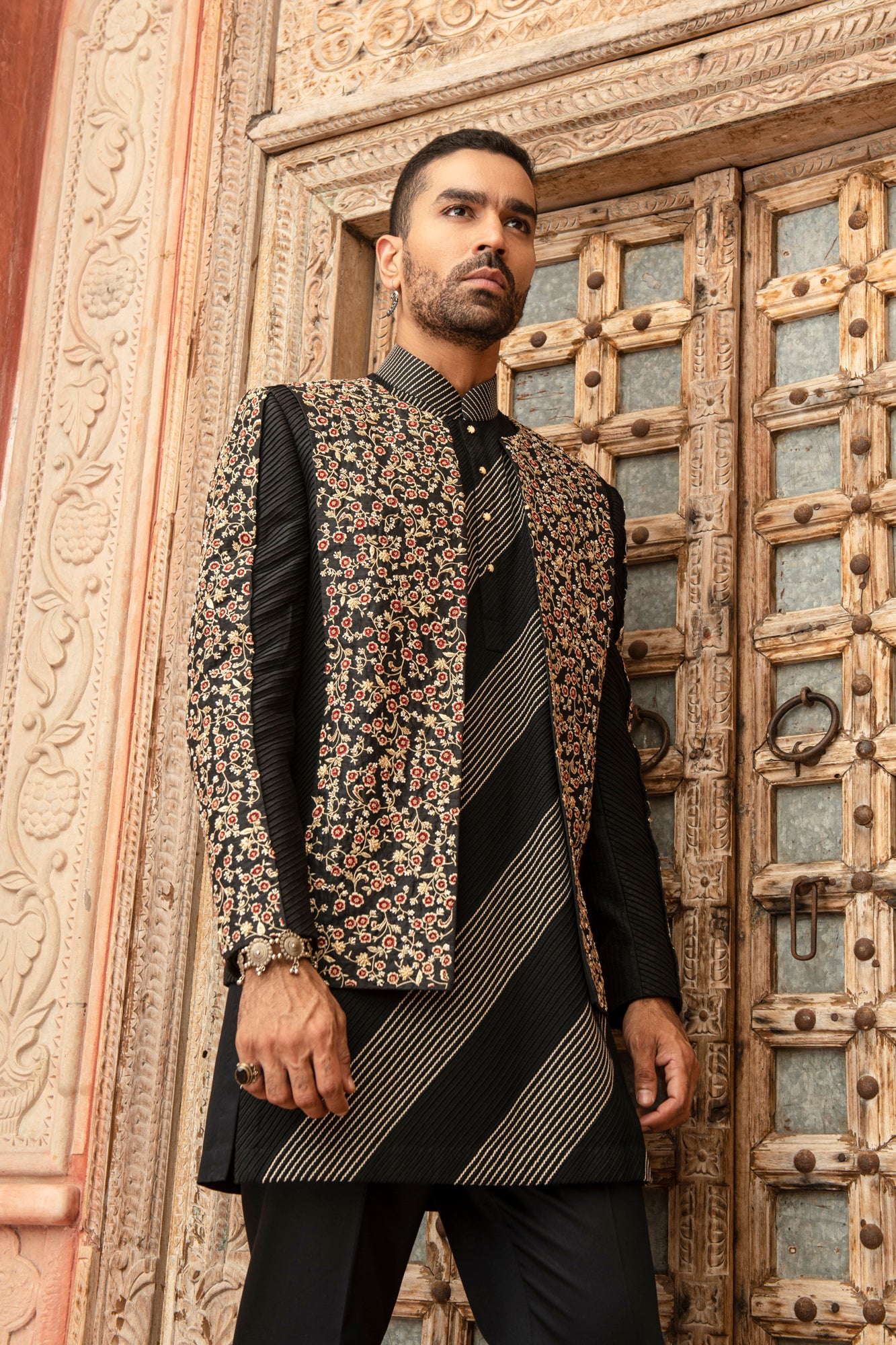 Featuring a black indowestern in silk dupion blend base with floral jaal embroidery. It is paired with a kurta and trousers. Accessorize this set with a pair of loafers for festive occasions.