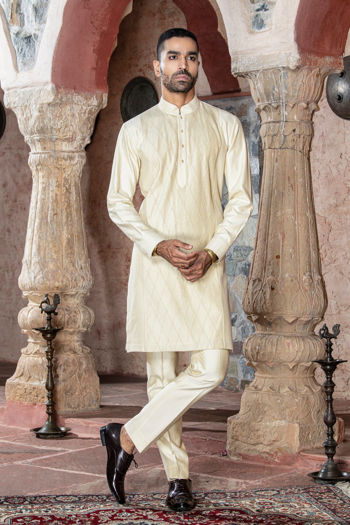 Featuring a cream kurta in kaftan silk base with pintucks and texturing embroidery. It is paired with pants. Perfect wear for festive or pooja ceremony