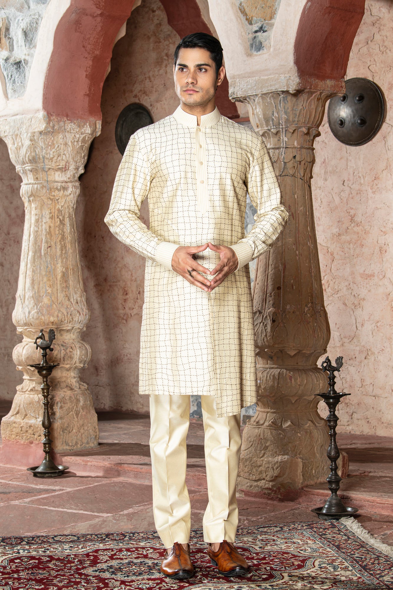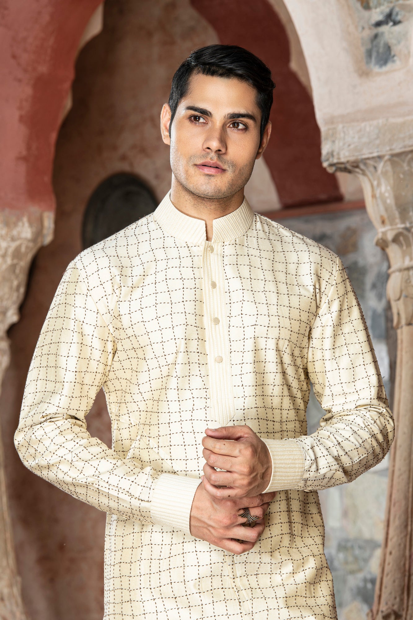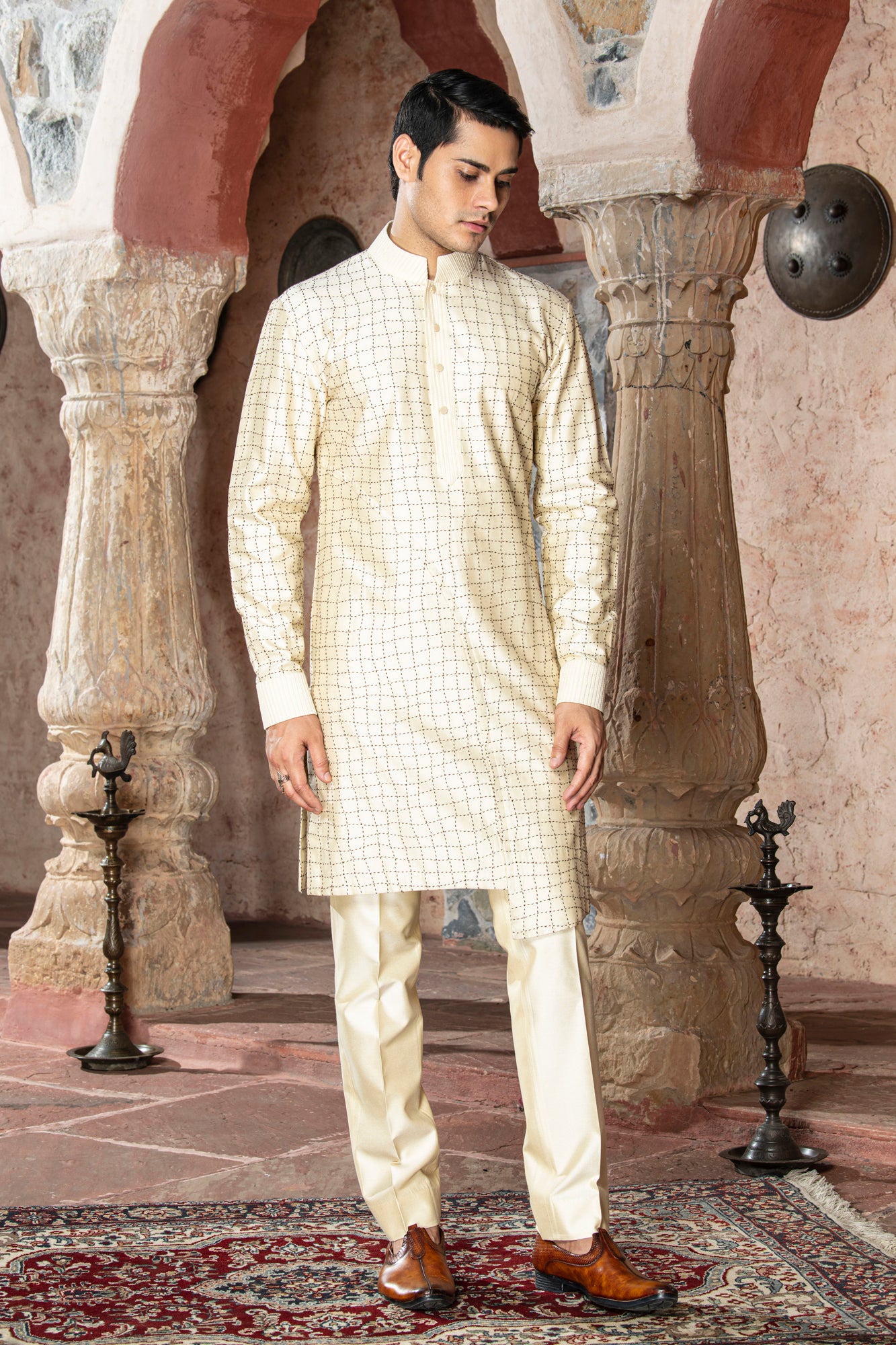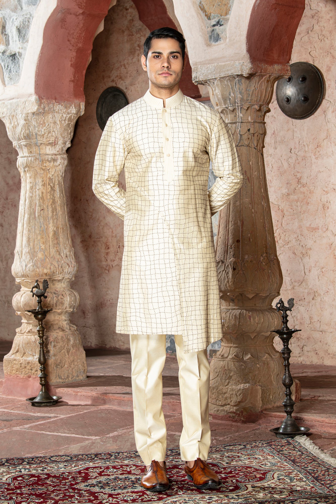 Featuring a cream kurta in katan silk base with thread embroidery. It is paired with pants. Perfect wear for festive or pooja ceremon