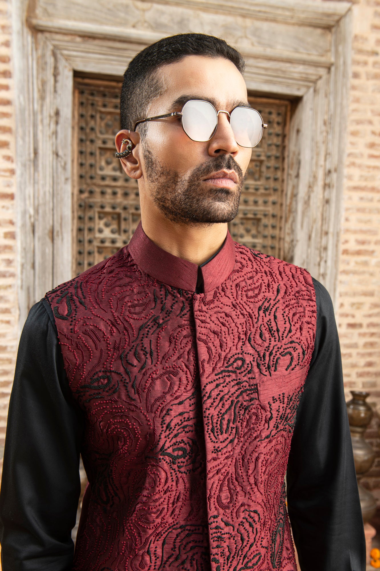 Featuring a maroon nehru jacket in Indian dupion base with beads embroidery. Perfect wear for a festive or wedding ceremony.NOTE: The kurta and pants in the image are for styling purposes only