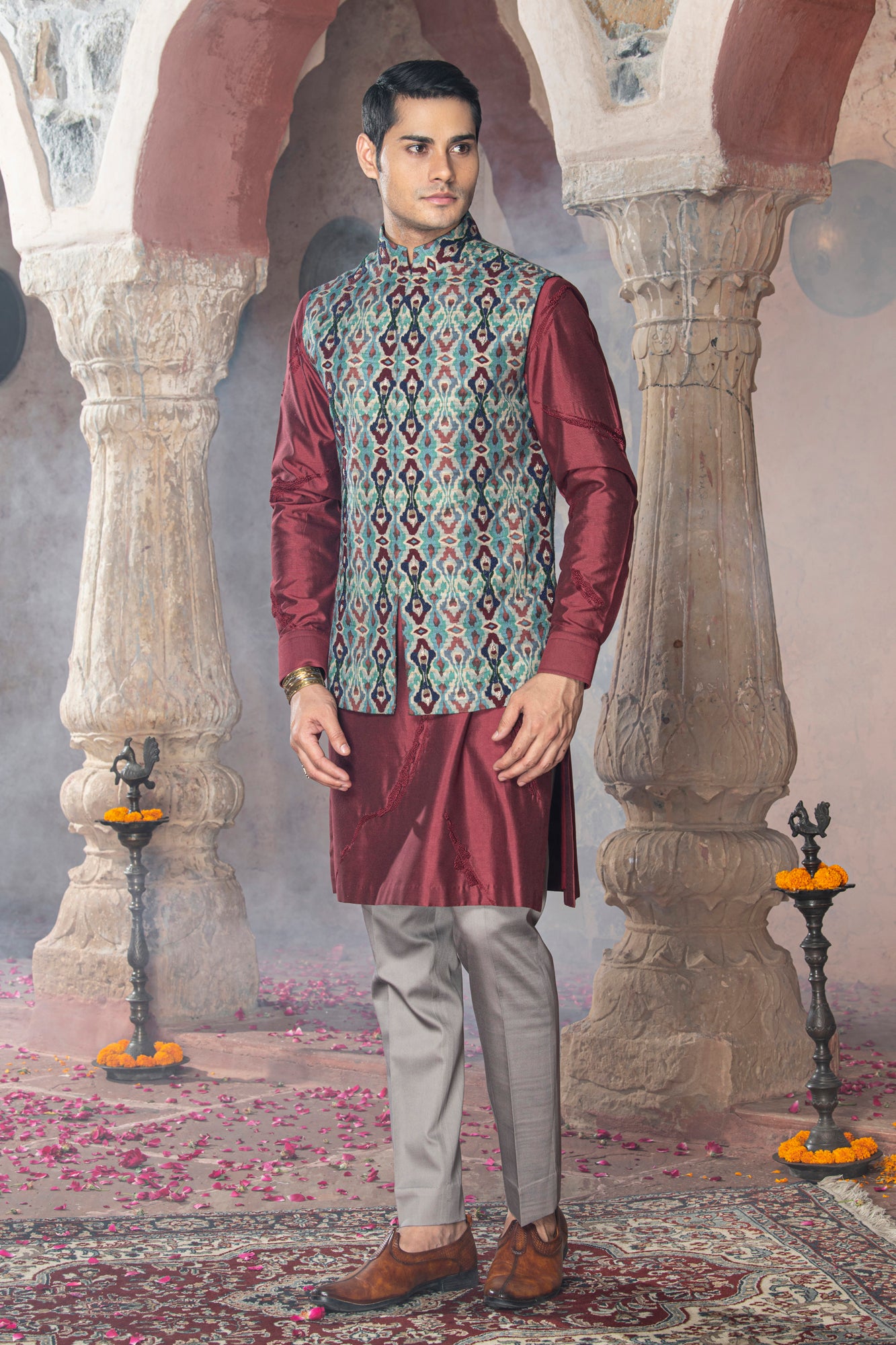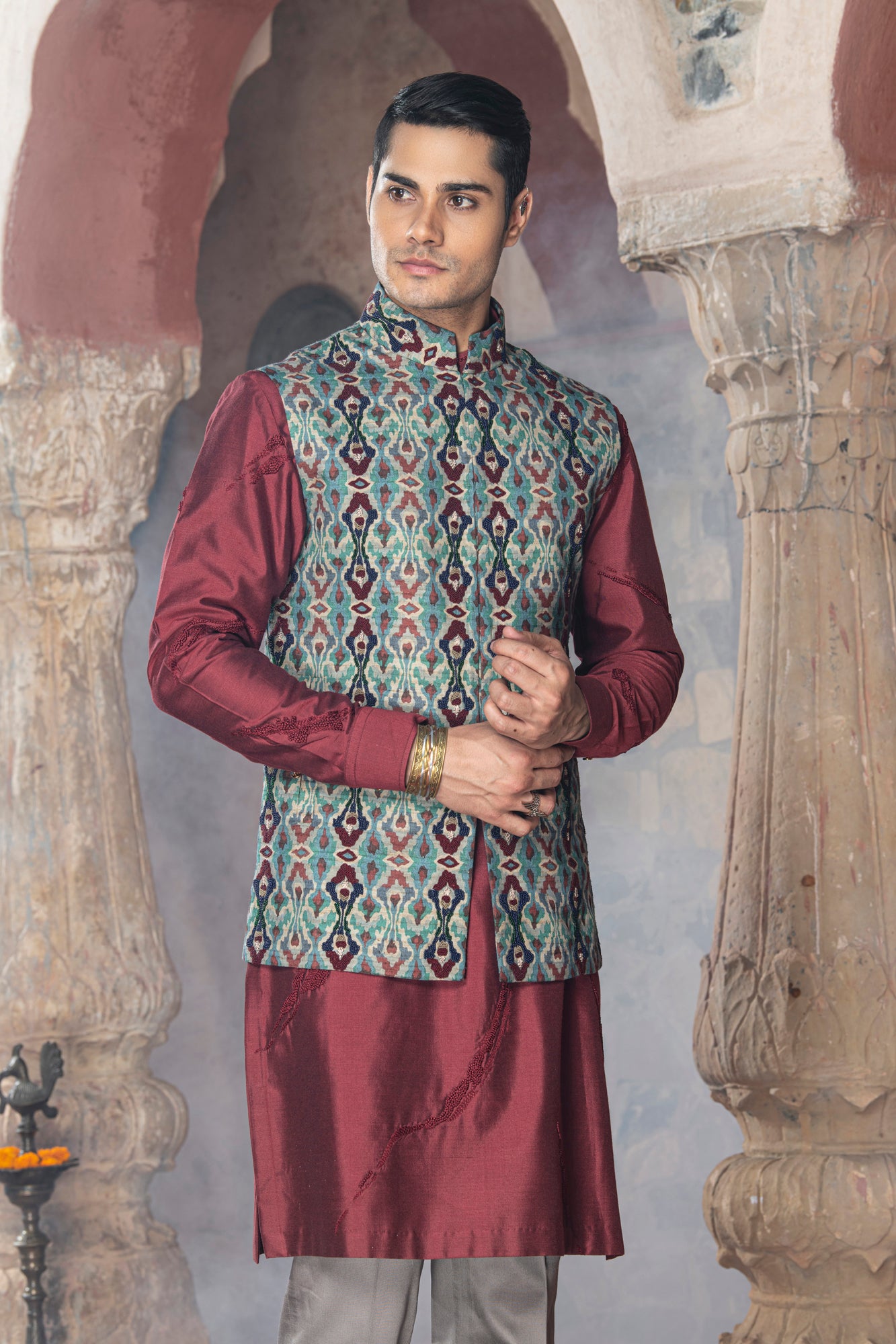 Featuring a multi-colored nehru jacket in dupion raw silk blend base with print and bead embroidery. Accessorize it with a pair of loafers for festive occasions.Note: The kurta in the image is for styling purposes only.