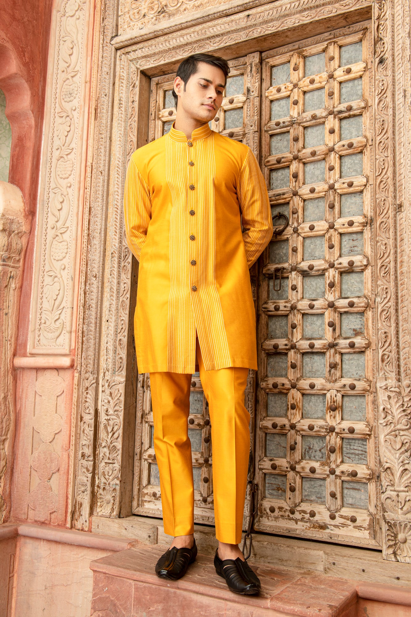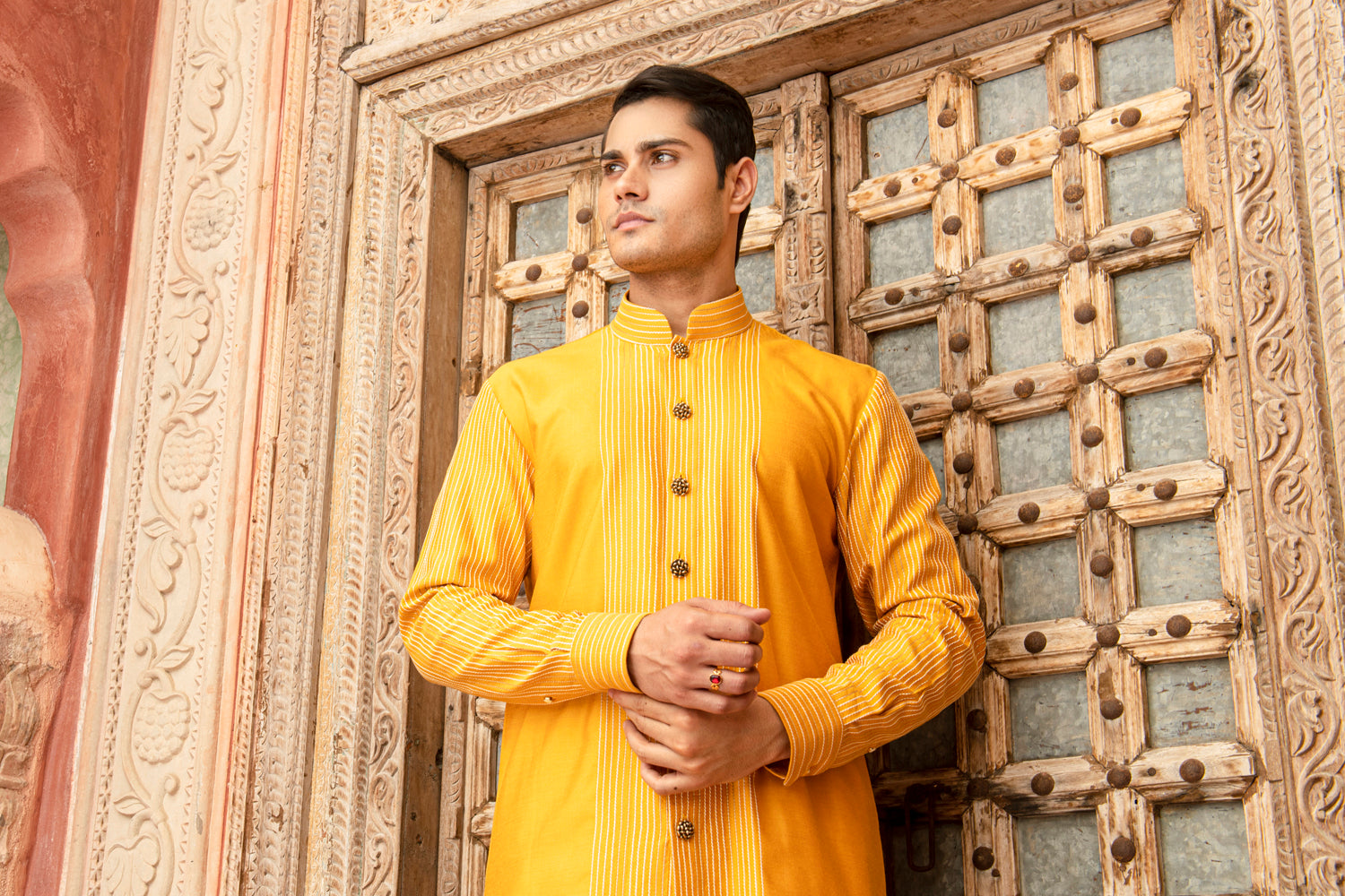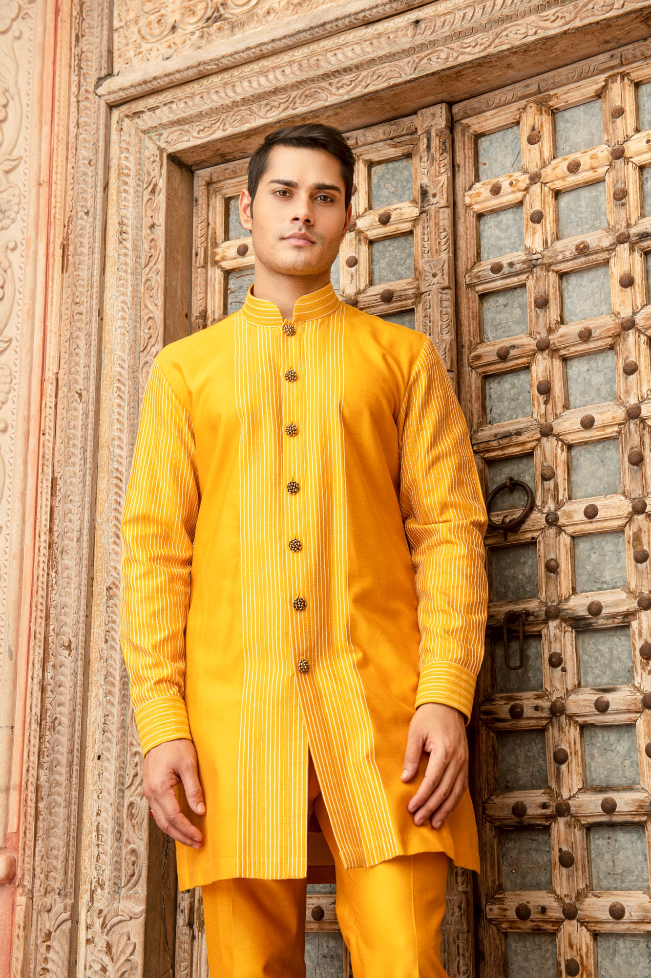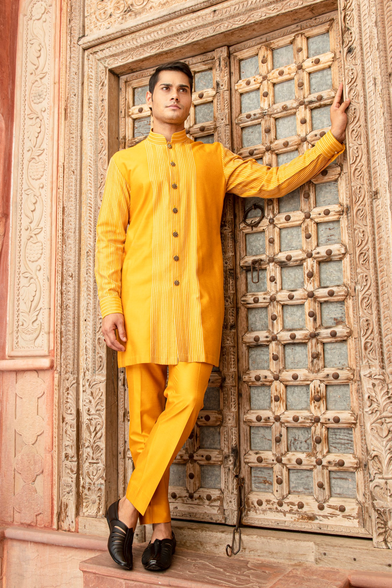 Featuring a yellow kurta in katan silk base with zari stitch line details. It is paired with pants. Accessorize this set with a pair of loafers for festive occasions or haldi ceremonies.