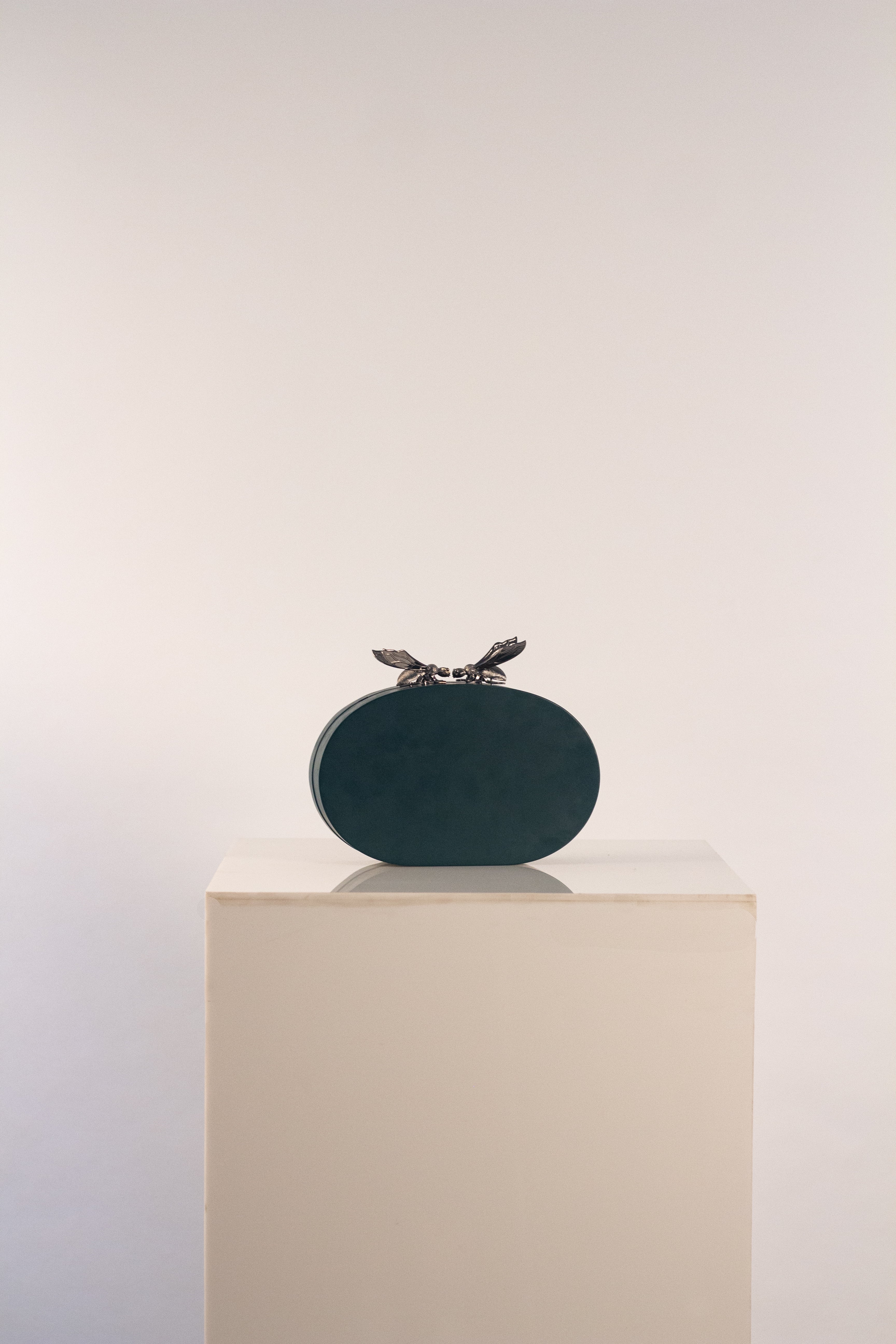 | Emerald Ovals are designed to liven an evening dress or your white staples— handcarved wooden clutches, structured to a stand-out shape. The metallic hardware is polished to perfection and adds a dazzle to the carved surface of the bag. |