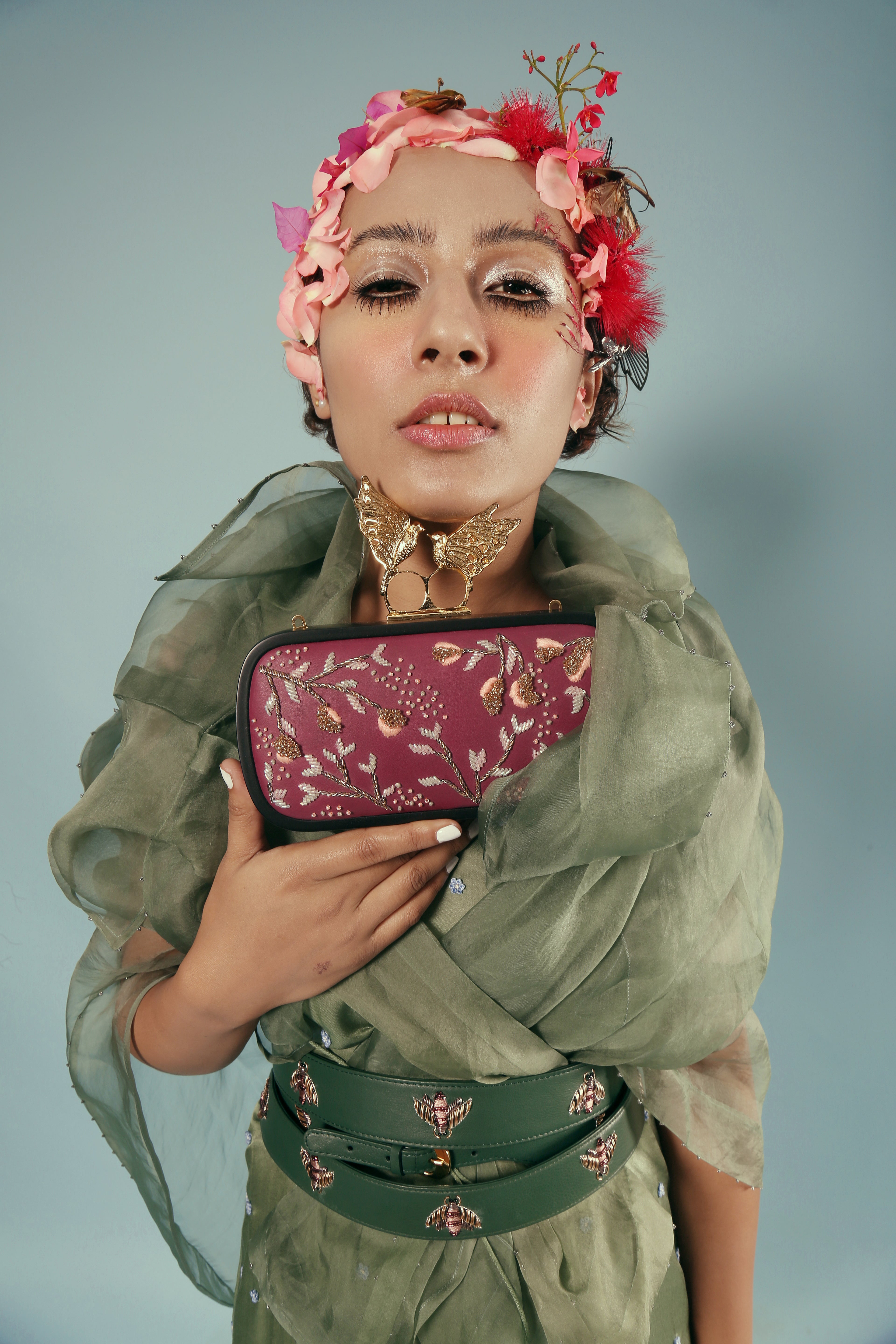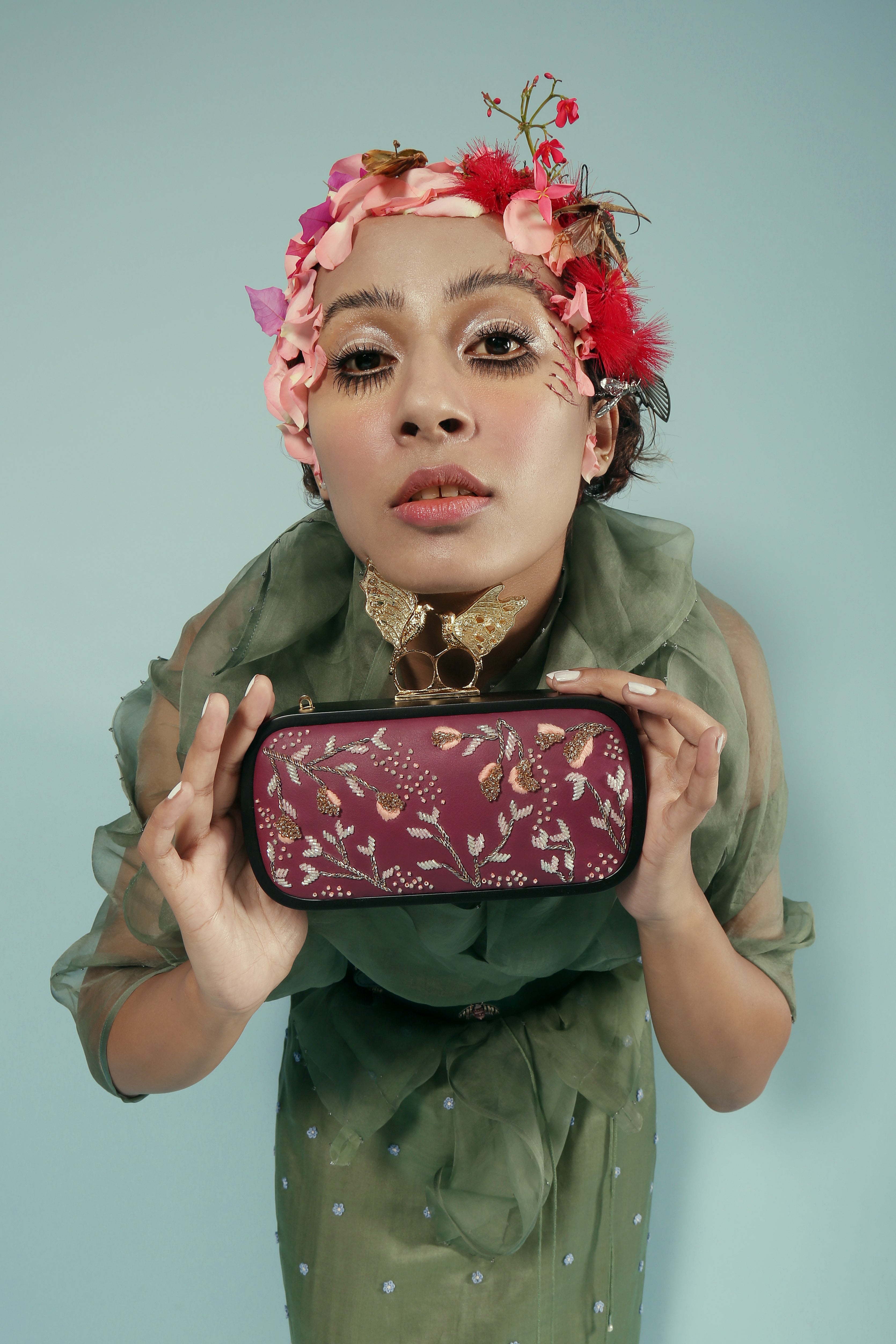 Delicately embroidered evening clutch designed to liven an evening dress, a spring - time skirt or your staples — the Gossamer bag uses a mix of wood, top quality leather and dazzling detailed handwork.