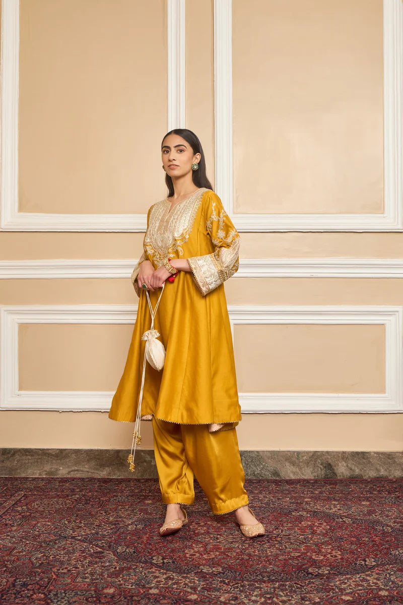 Mohsina - glaze mustard short kalidaar choga with salwar