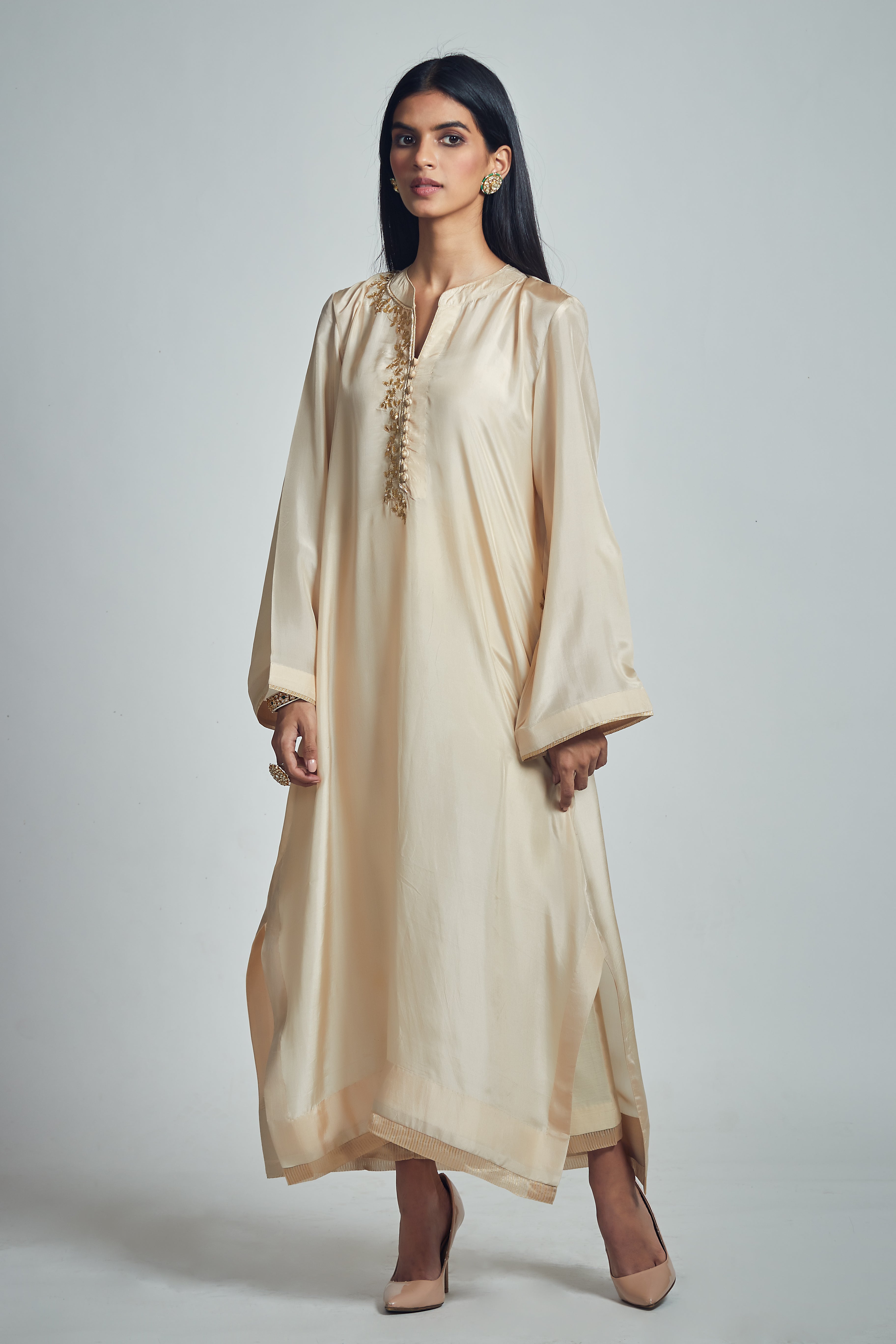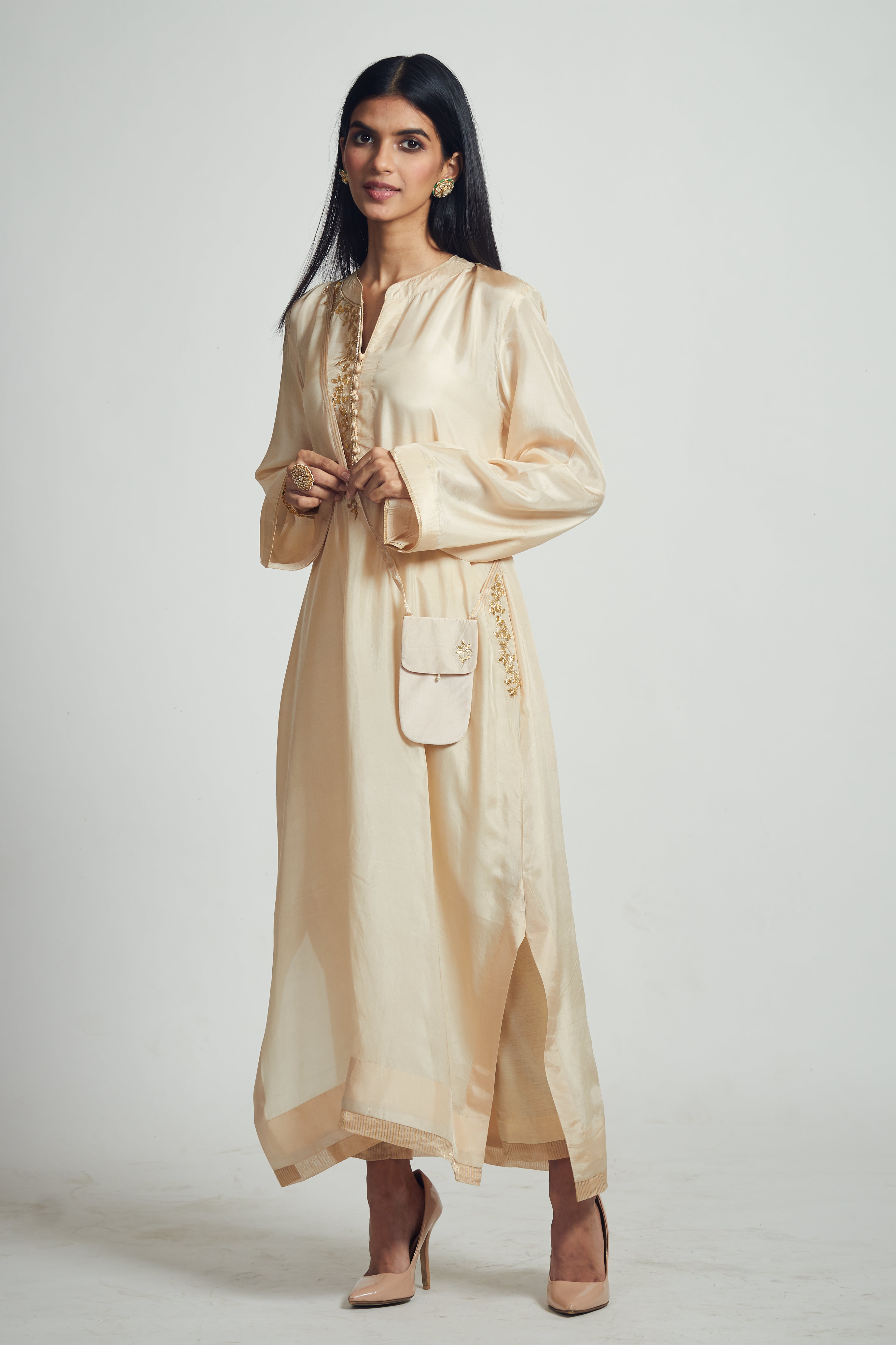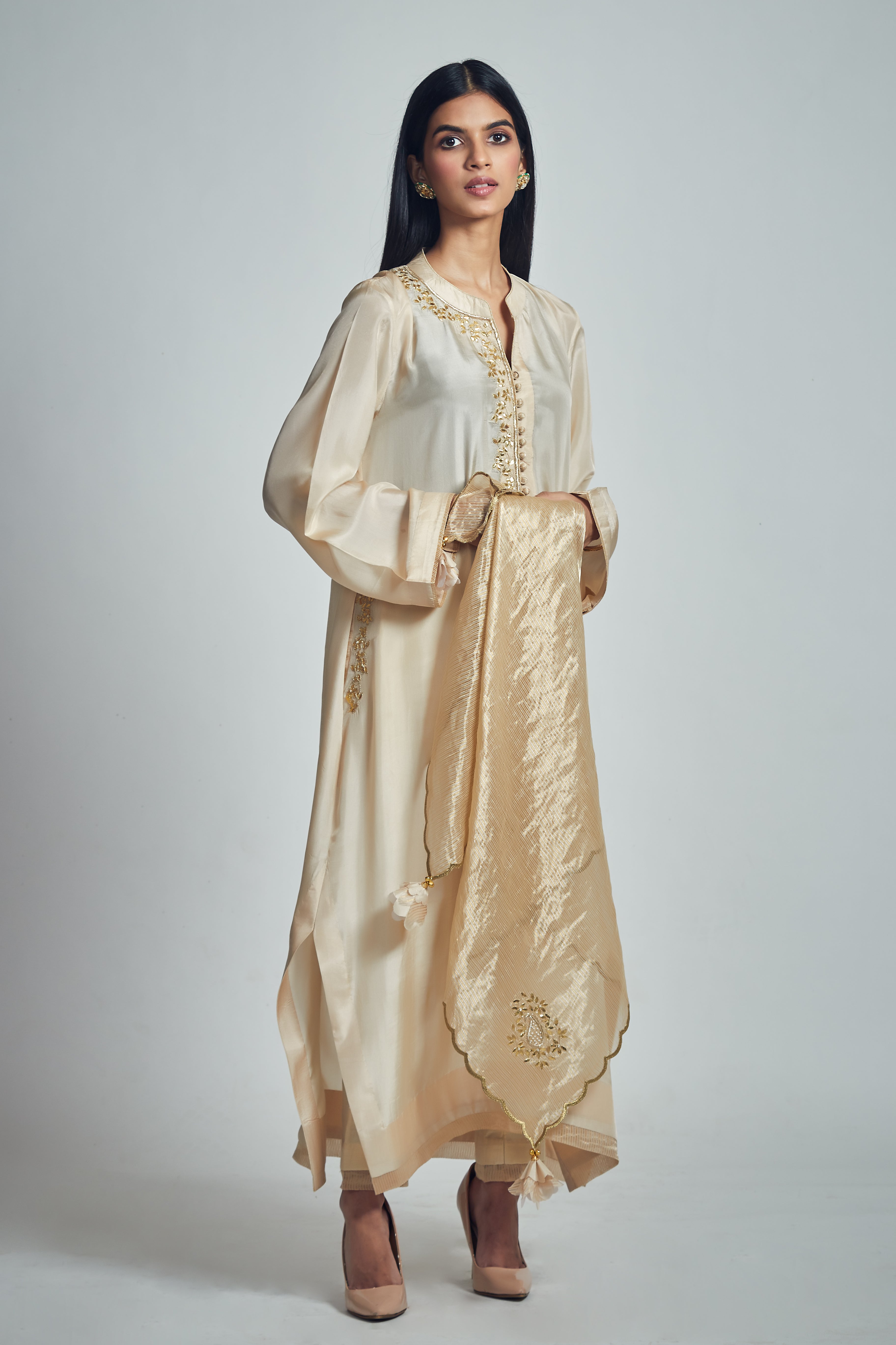 The Nyasia Chauga From Our Itr Collection Is Made In Pure Habutai Silk Adorned With Heritage Gota Patti, Dabka, Kasab And Pearl Embroidery. It Features Mandarin A Collar With Potli Button And Full Sleeves. The Finishing Of The Outfit Is Done By Silk Organza Tissue. The Chauga Is Teamed Up It With A Pair Of Beige Chanderi Silk Pants. Get A Matching Belt Or Scarf To Complete Your Look. Pants Are Not Included In The Outfit, But Can Made To Order.