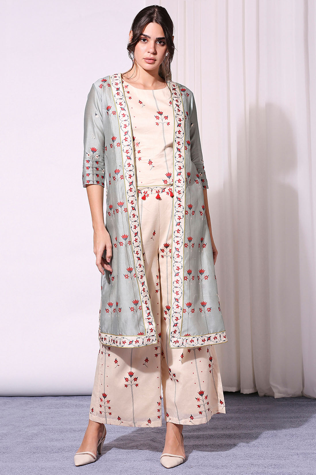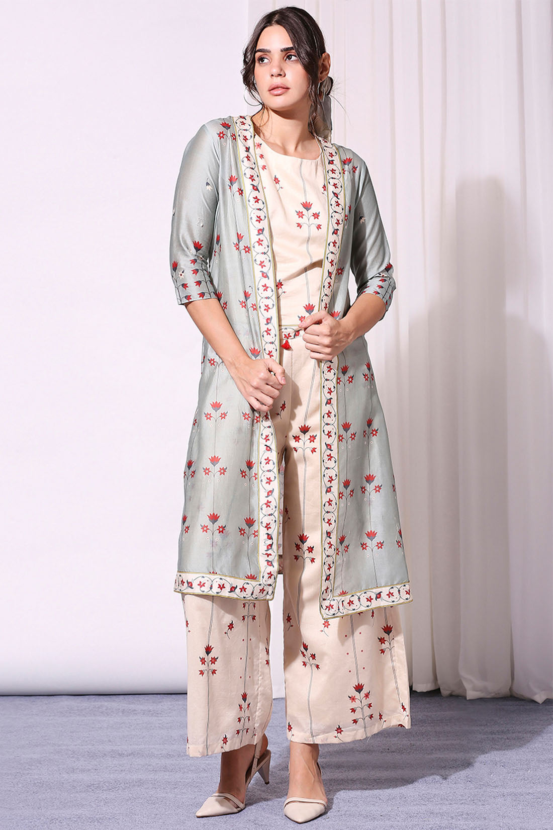 The Powder Blue Floral Printed Co-Ord Set And Jacket Offer A Fresh And Feminine Twist On Contemporary Fashion. The Co-Ord Set Features A Soft Powder Blue Base, Adorned With Delicate Floral Prints That Create An Elegant And Lively Pattern. The Top Is Cut To Perfection, Offering A Sleek Yet Comfortable Fit, While The Matching Pants Or Skirt Enhance The Set's Chic Appeal With A Flattering Silhouette. The Jacket, Designed With A Tailored Yet Relaxed Structure, Adds An Extra Layer Of Sophistication And Warmth, Completing The Look With Its Coordinated Floral Design. This Set Effortlessly Combines Modern Styling With A Touch Of Nature-Inspired Beauty, Making It Perfect For Brunches, Garden Parties, Or Stylish Evening Events.