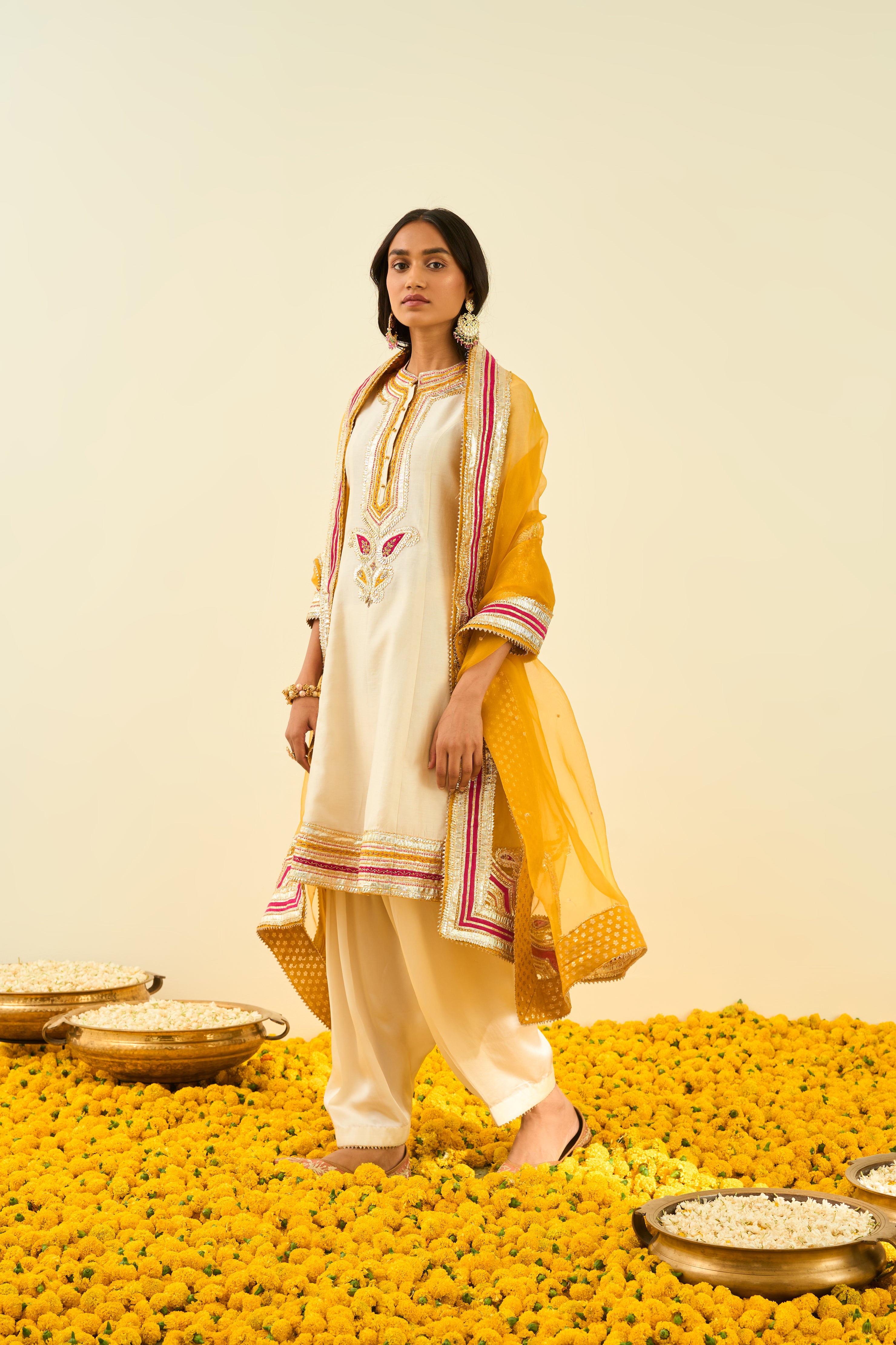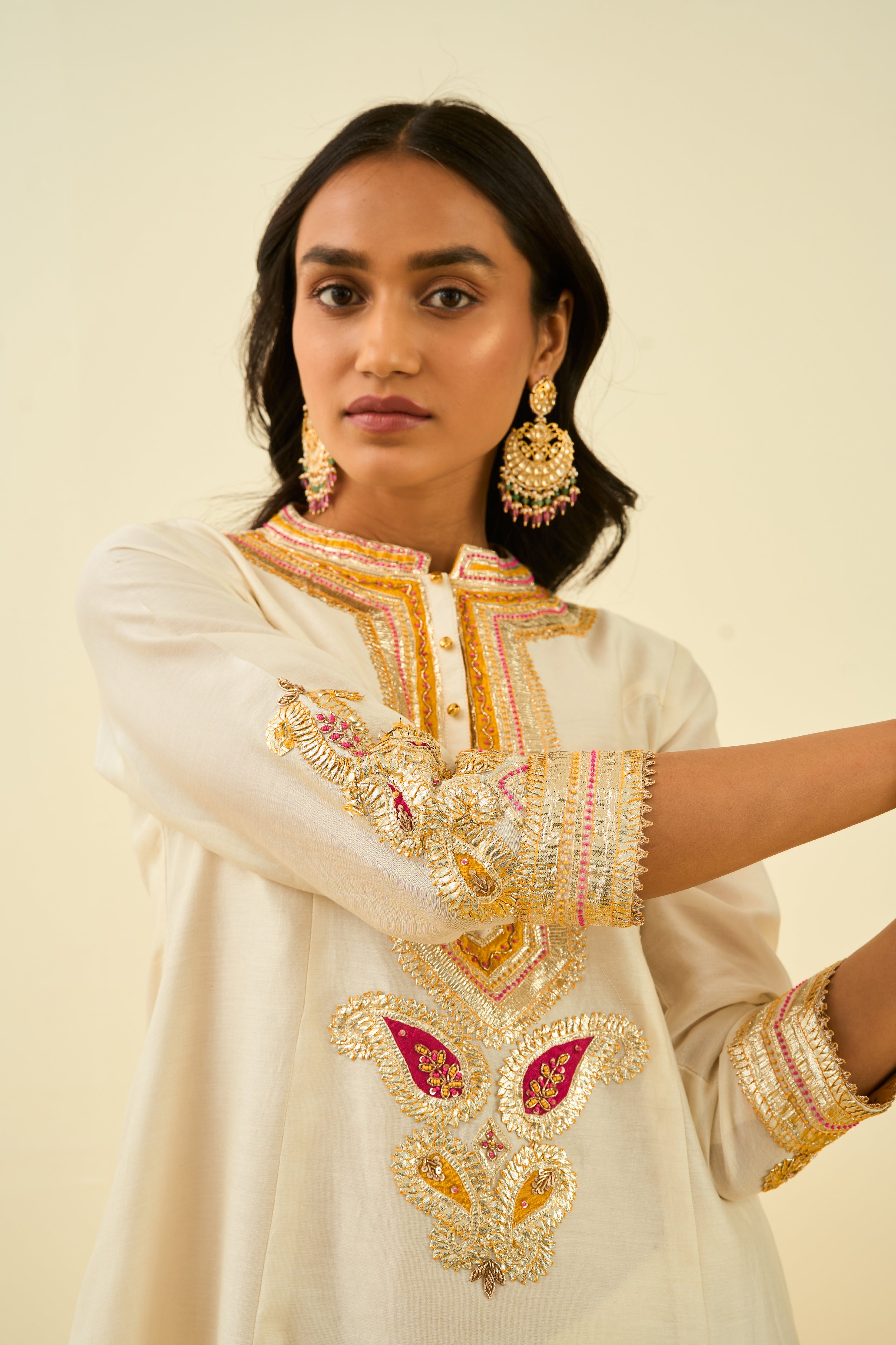 The Sadirah Ensemble From The Noor Collection Is Made Using A Pure Chanderi Silk Fabric, Crafted With Gotapatti And Highlighted With Basra Moti. It Features A Mandarin Collar With A Placket And Three-Quarter Sleeves. The Look Comes Together With A Salwar And A Silk Organza Dupatta. The Outfit Is Finished Using An Exclusive Chanderi Silk Banarsi Fabric And Pearls.