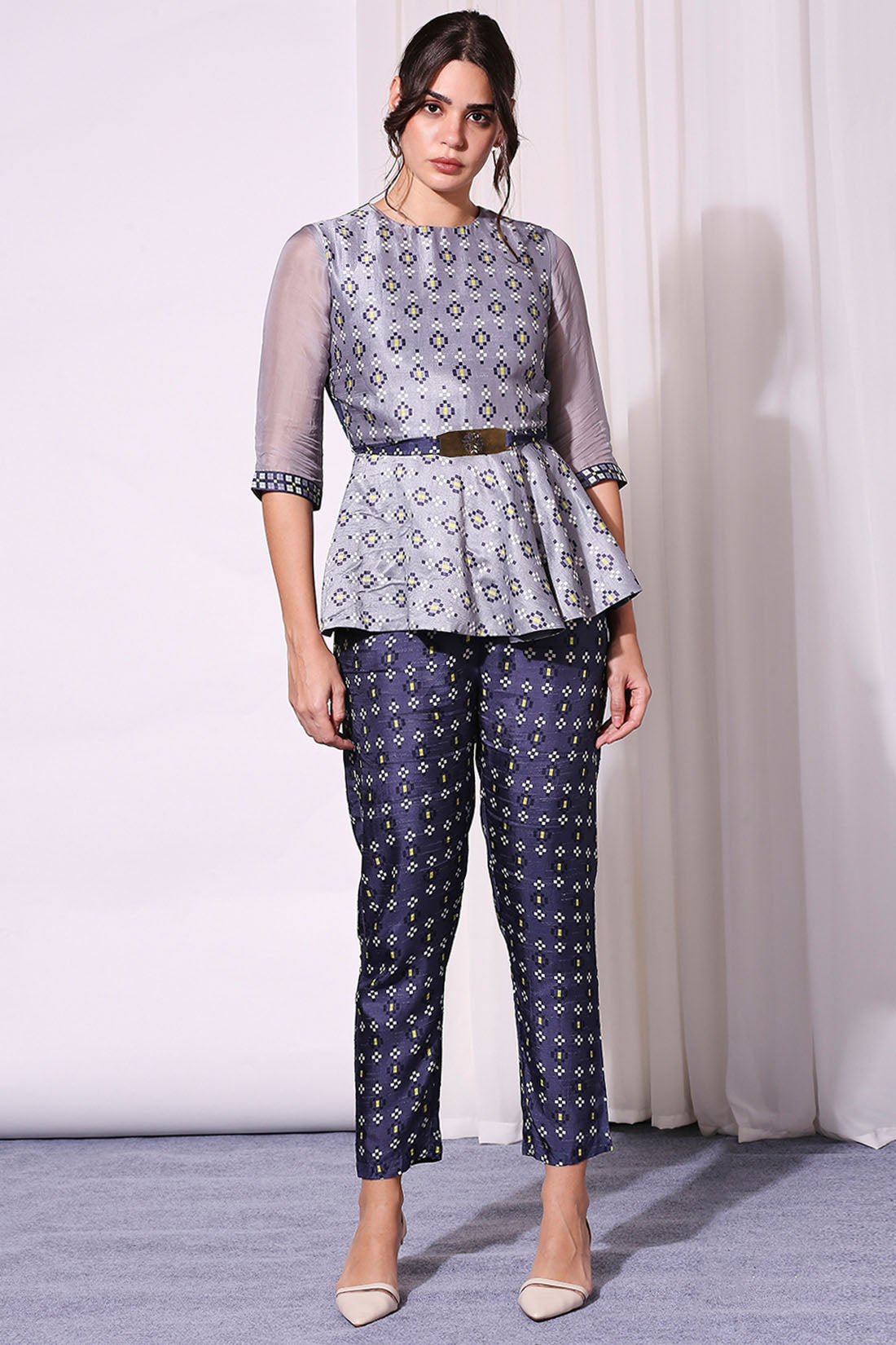 The Blue Geometrical Printed Peplum Co-Ord Set With Metal Belt Is The Epitome Of Chic And Modern Fashion. Featuring A Bold Geometric Print In Striking Blue Hues, This Set Combines Structure And Fluidity For A Flattering And Fashionable Look. The Peplum Top Adds A Touch Of Sophistication, Accentuating The Waistline, While The Matching Skirt Completes The Ensemble With A Sleek, Streamlined Silhouette. The Metal Belt Serves As A Statement Accessory, Adding A Touch Of Edgy Elegance And Creating A Perfect Balance Between Bold And Refined. Whether For A Night Out Or A Stylish Day Event, This Co-Ord Set Is Designed To Turn Heads And Keep You Looking Effortlessly Stylish.