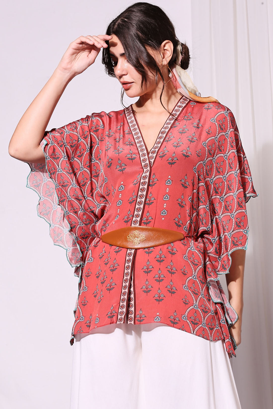 The Blush Red Ethnic Floral Printed Kaftan Top And Pants Set Is The Perfect Blend Of Contemporary Style And Traditional Charm. The Soft Blush Red Color Of The Kaftan Top Creates A Soothing And Elegant Vibe, While The Vibrant Floral Print In Rich Tones Adds A Lively And Artistic Touch. The Floral Motifs, Delicately Scattered Across The Fabric, Bring Out An Ethnic Appeal That Is Both Timeless And On-Trend.
