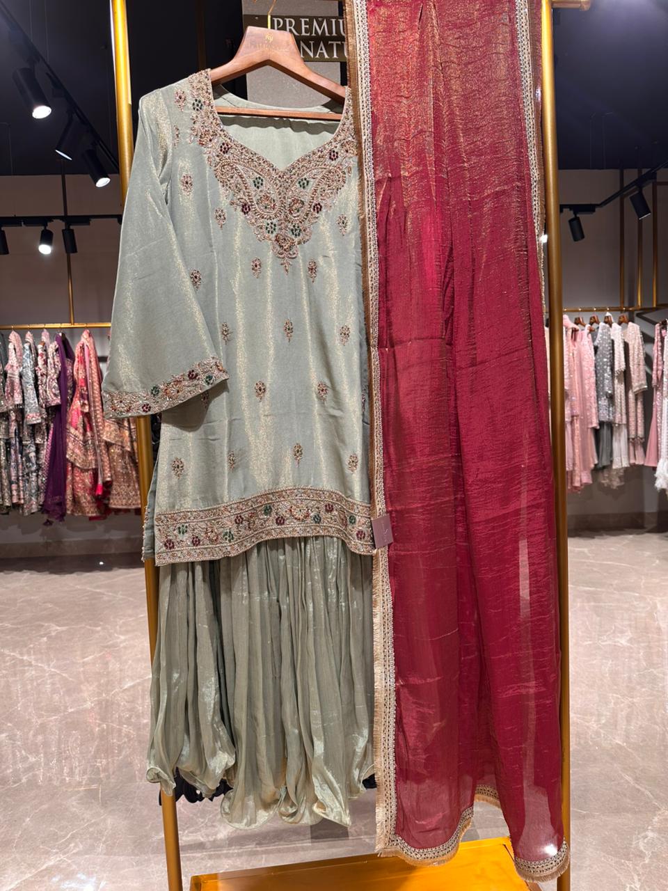 Elevate Your Festive And Wedding Wardrobe With This Exquisite Shimmer Silk Sharara Set, Designed To Bring Effortless Elegance And A Radiant Glow To Every Celebration. Crafted From Premium Shimmer Silk Fabric, The Outfit Features A Beautifully Tailored Kurta Enhanced With Subtle Shine And A Soft, Fluid Drape. The Matching Sharara Adds Graceful Volume And Movement, Making It Perfect For Twirls And Special Moments. The Ensemble Comes With A Coordinated Dupatta, Styled With A Delicate Shimmer Finish That Completes The Look With Sophistication. Lightweight, Comfortable, And Richly Stylish, This Sharara Set Is An Ideal Choice For Festive Occasions, Sangeet Nights, Engagements, And Evening Celebrations.