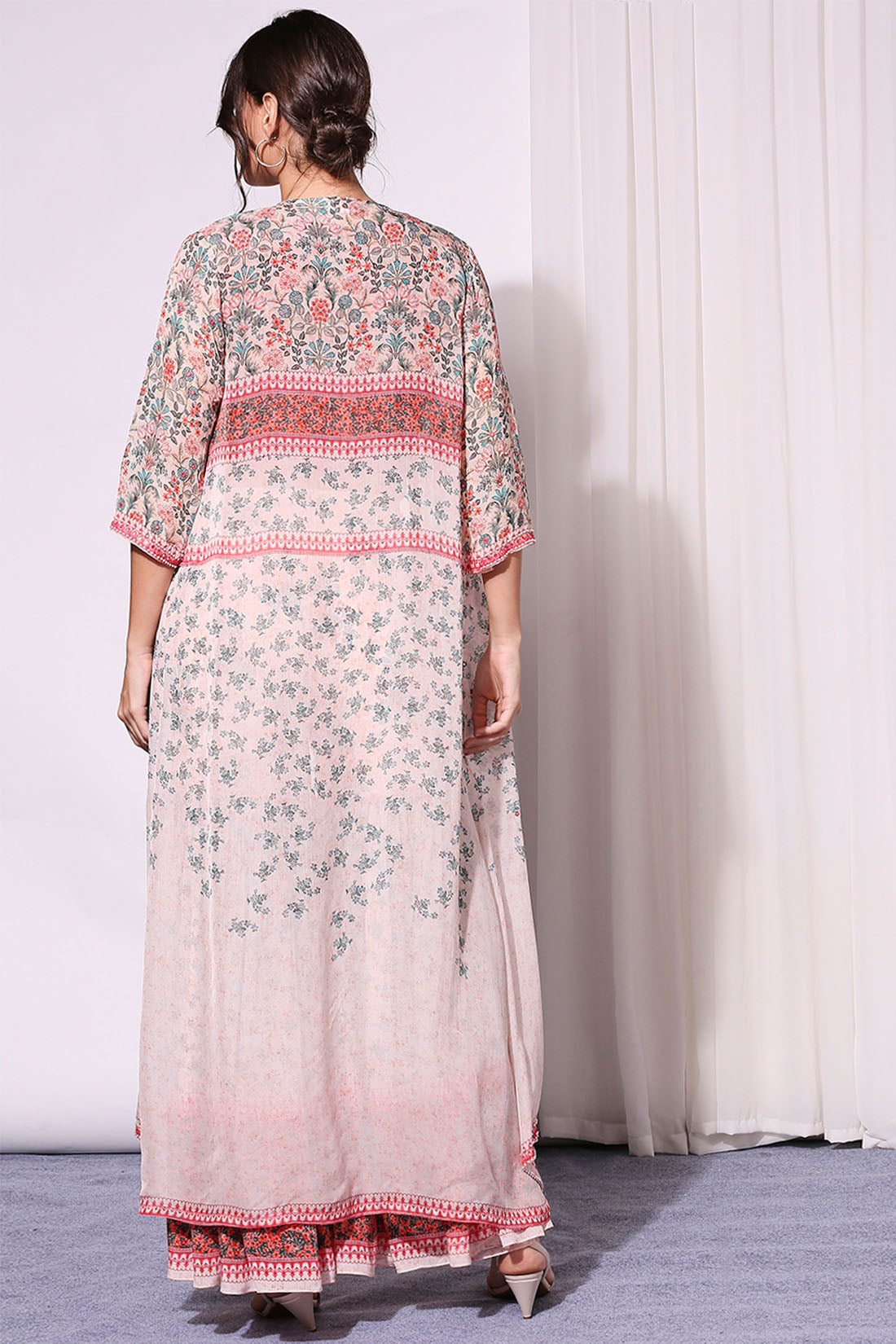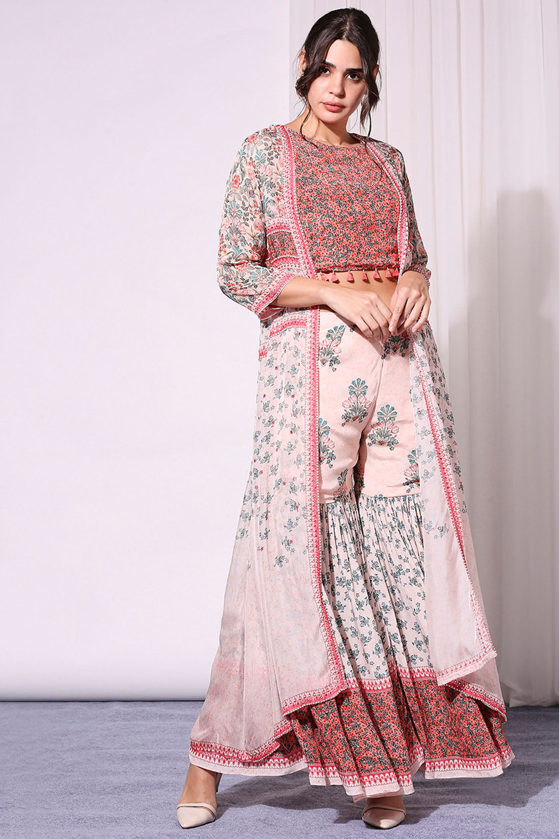 The Mellow Rose Floral Pastel Printed Sharara Set Is A Soft And Elegant Ensemble That Effortlessly Combines Traditional Charm With Contemporary Style. The Set Features A Delicate Pastel Color Palette, With The Mellow Rose Hue Adding A Warm And Feminine Touch. The Intricate Floral Print Enhances The Overall Design, Creating A Romantic And Timeless Appeal.