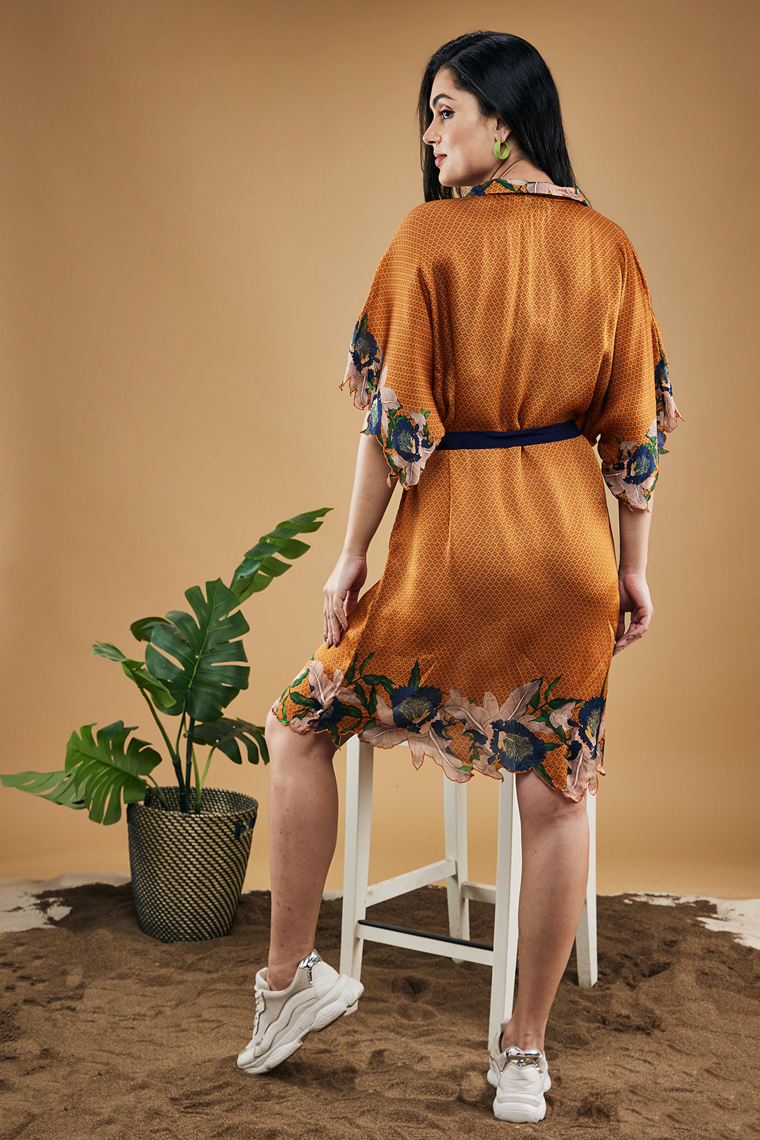 Orange Orchid Bloom Printed Kimono Dress In Cotton Silk.