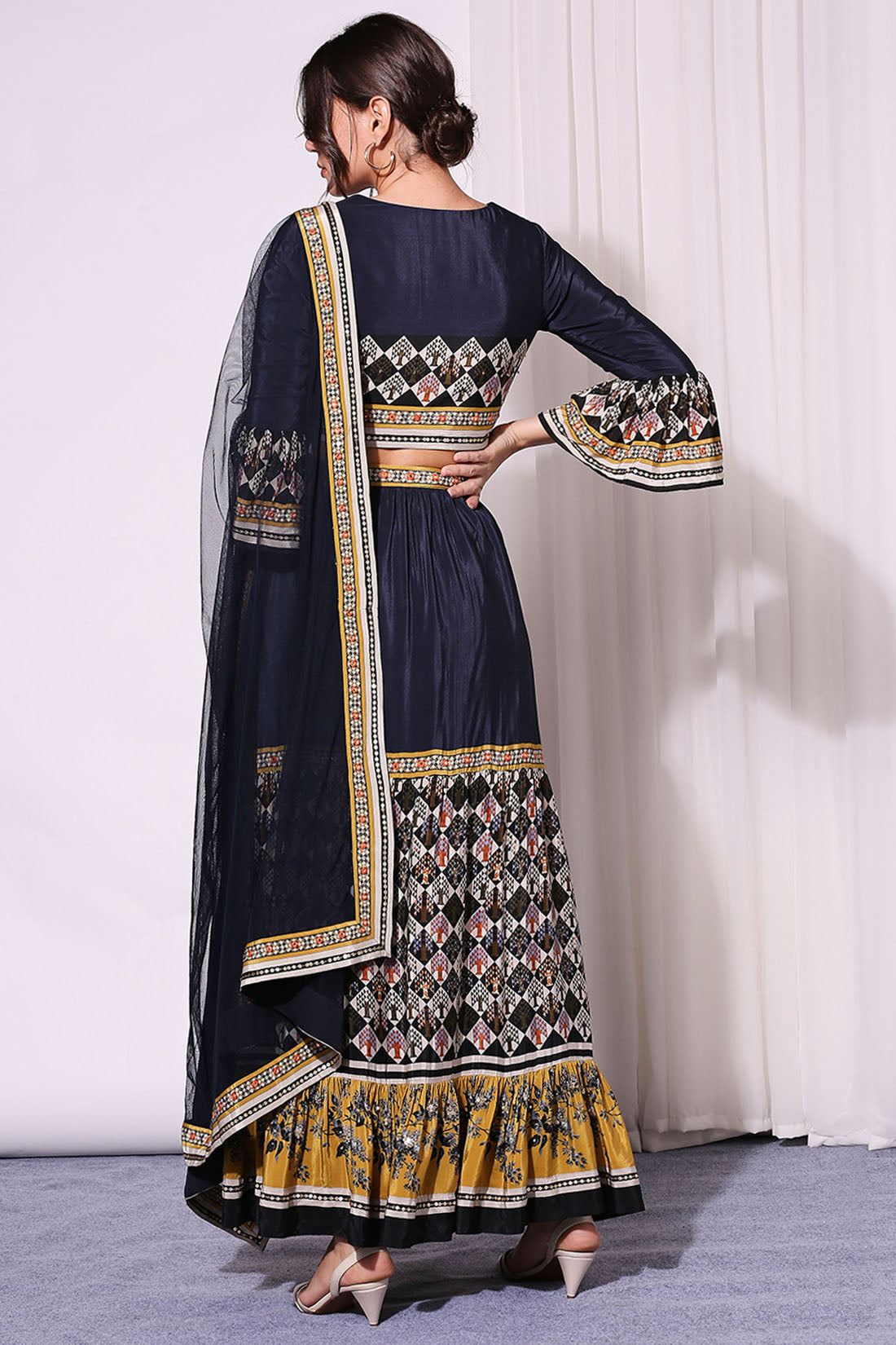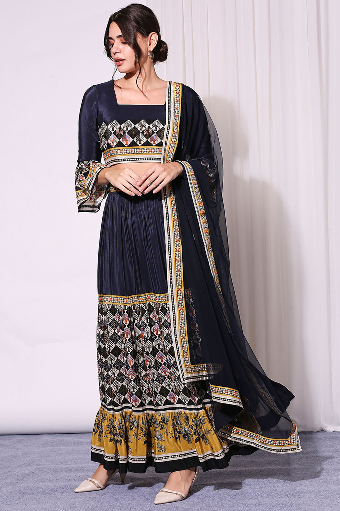 The Persian Blue Applique Printed Crop Top And Skirt Set Is A Stunning Fusion Of Traditional Artistry And Contemporary Fashion. The Crop Top Features Intricate Applique Detailing That Enhances The Rich Persian Blue Fabric, Creating A Mesmerizing Visual Effect. Paired With A Matching Skirt, This Ensemble Flows Gracefully With Its Flattering Cut And Elegant Design. The Delicate Print Adds Depth And Texture, Making It Perfect For Festive Occasions, Evening Gatherings, Or Cultural Celebrations. Designed For Both Style And Comfort, This Set Is A Versatile Addition To Your Wardrobe, Offering A Modern Yet Timeless Appeal.