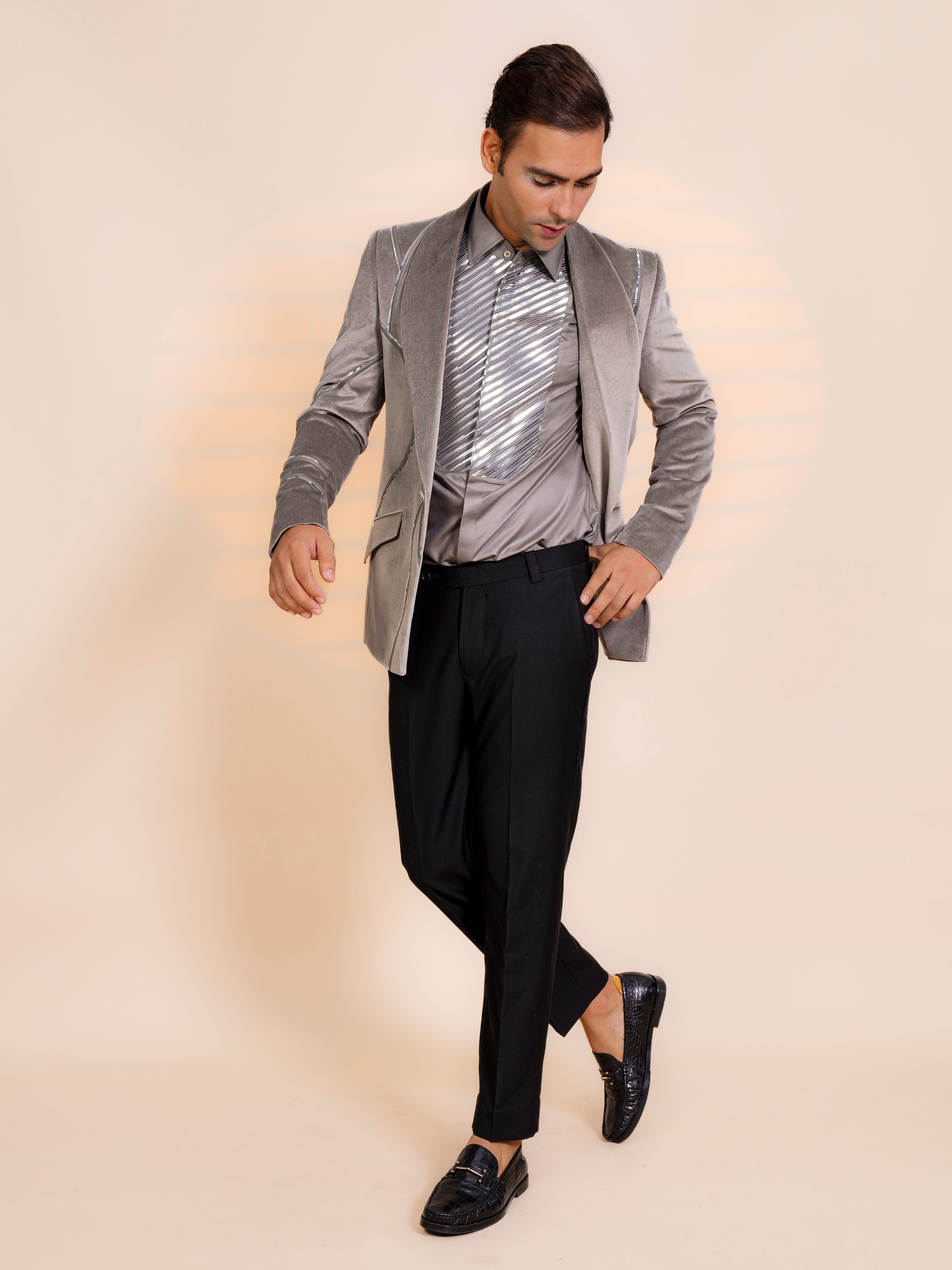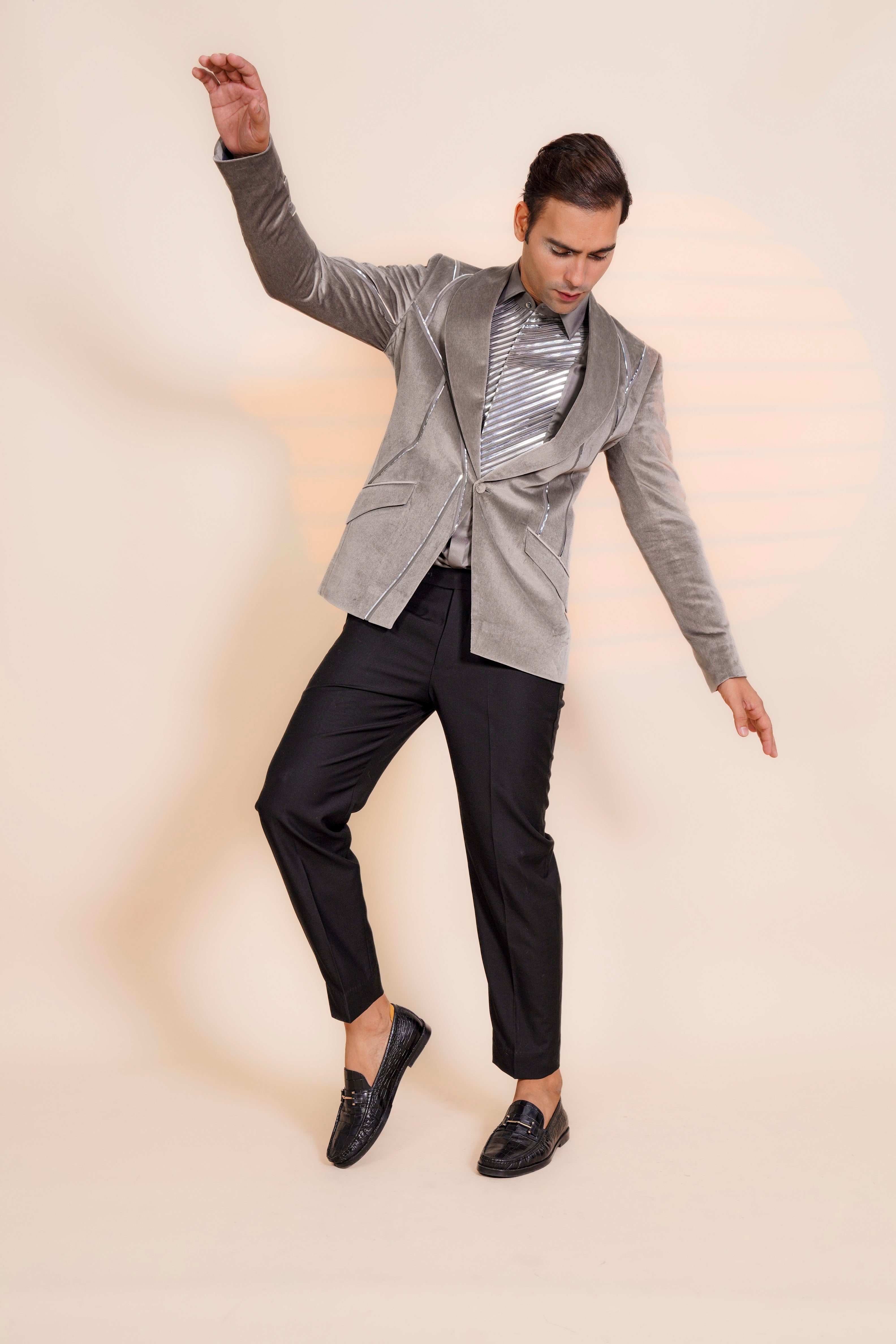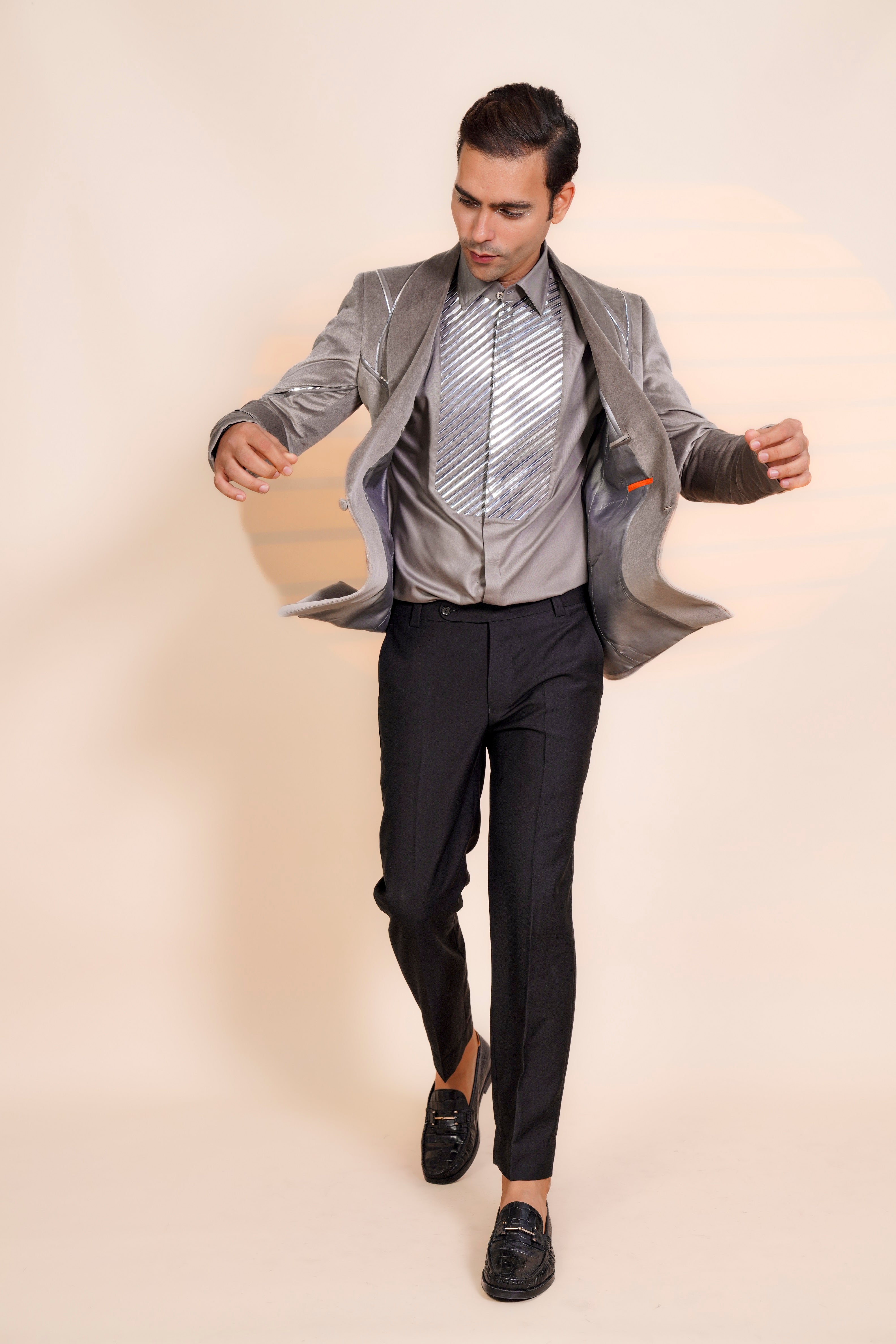 Featuring the Brown Velvet suit set styling with Silver Metal Stripes on it. It is Paired with Coat and Trouser