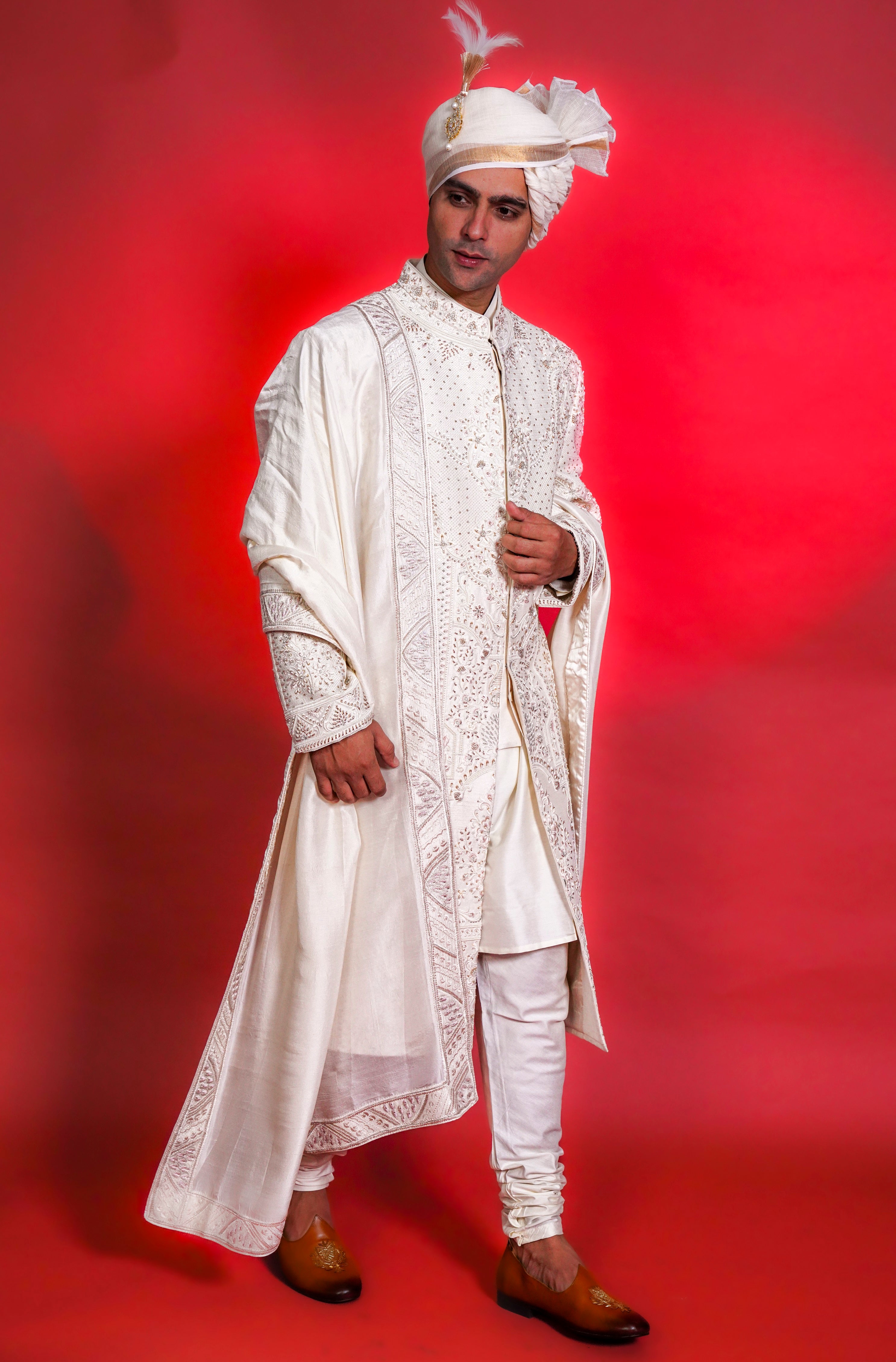 Featuring the Off white colour Sherwani embroided with thread and hand work it is paired with Anarkali,Chridaar,embroided stole, and jutti