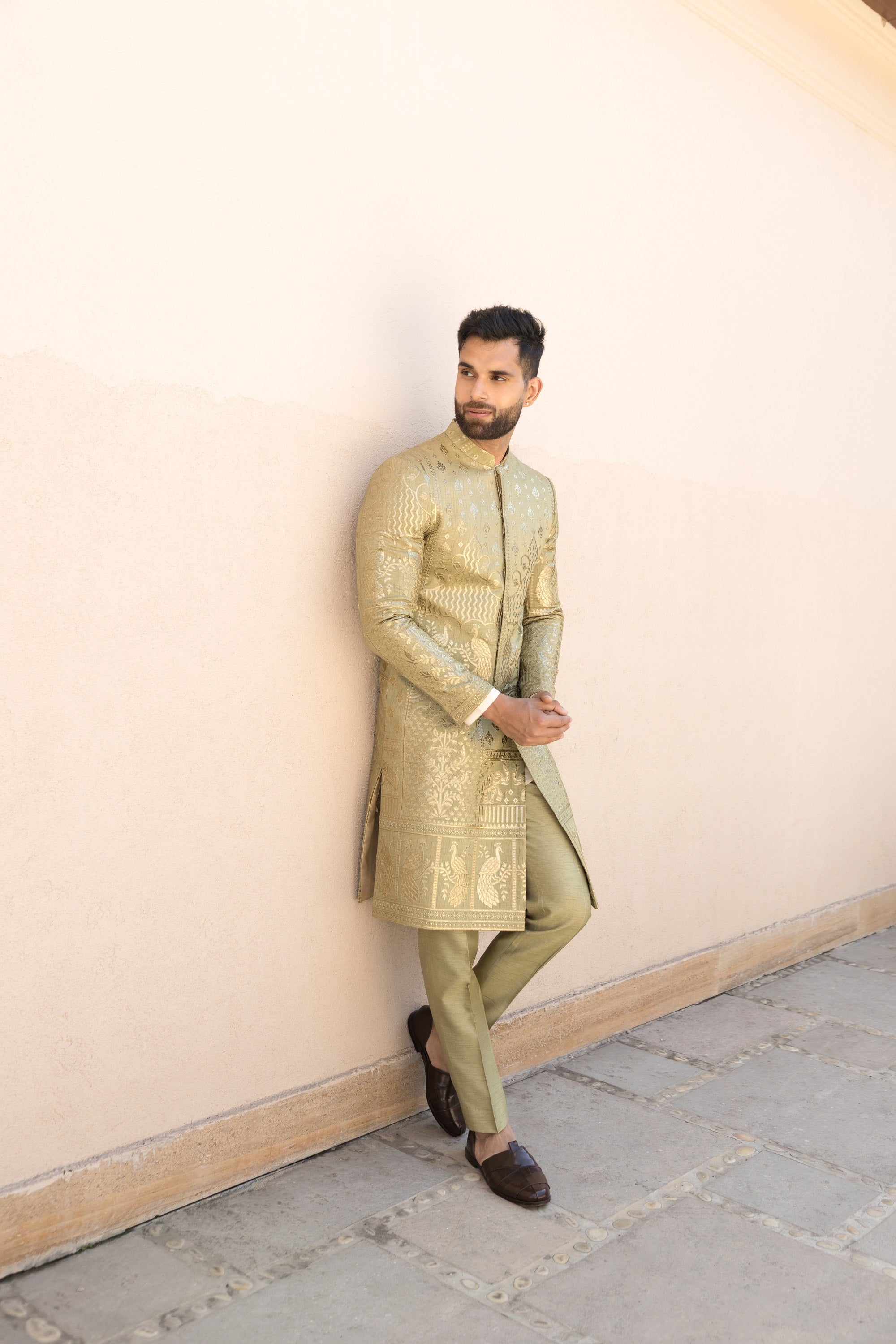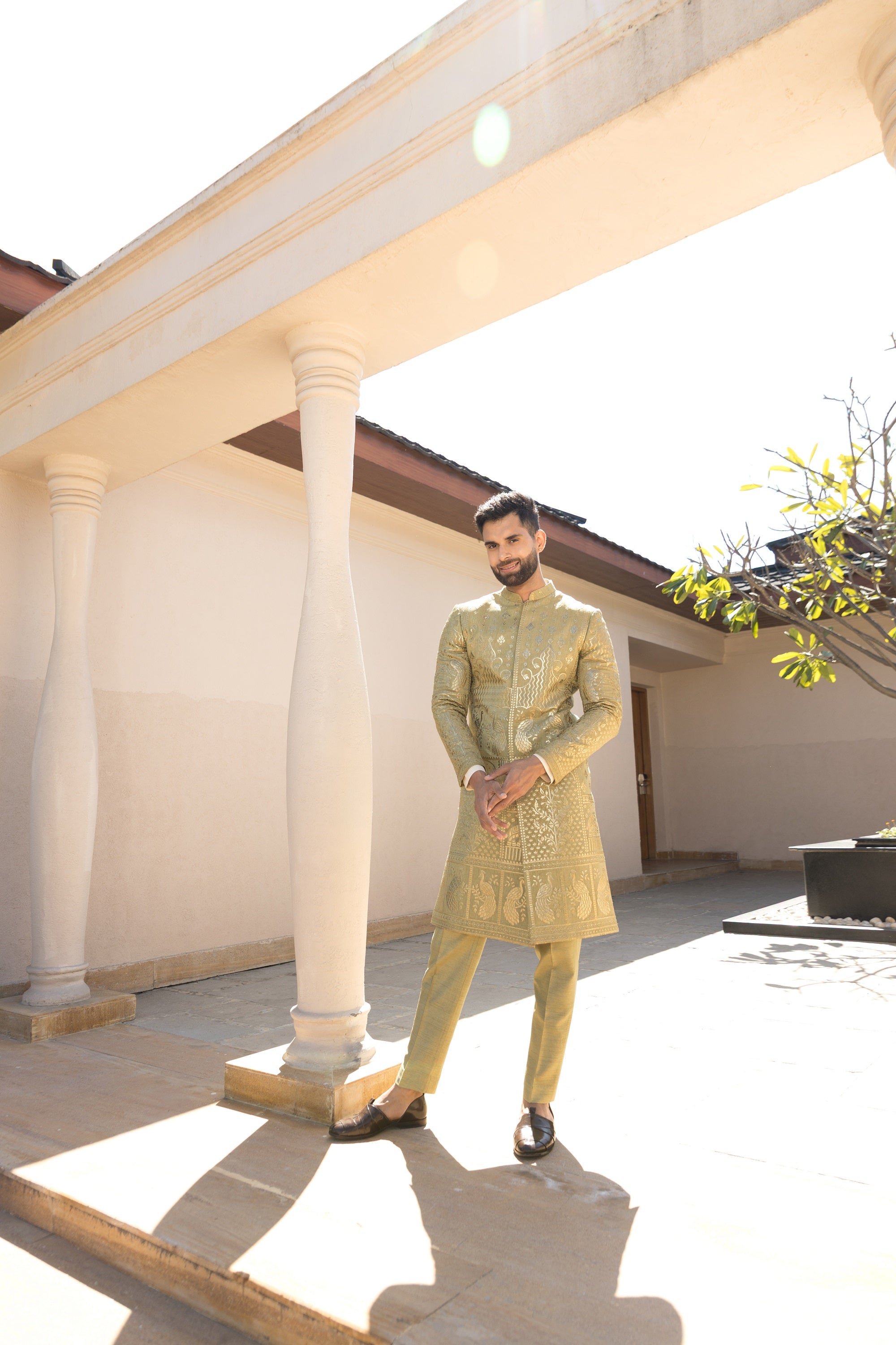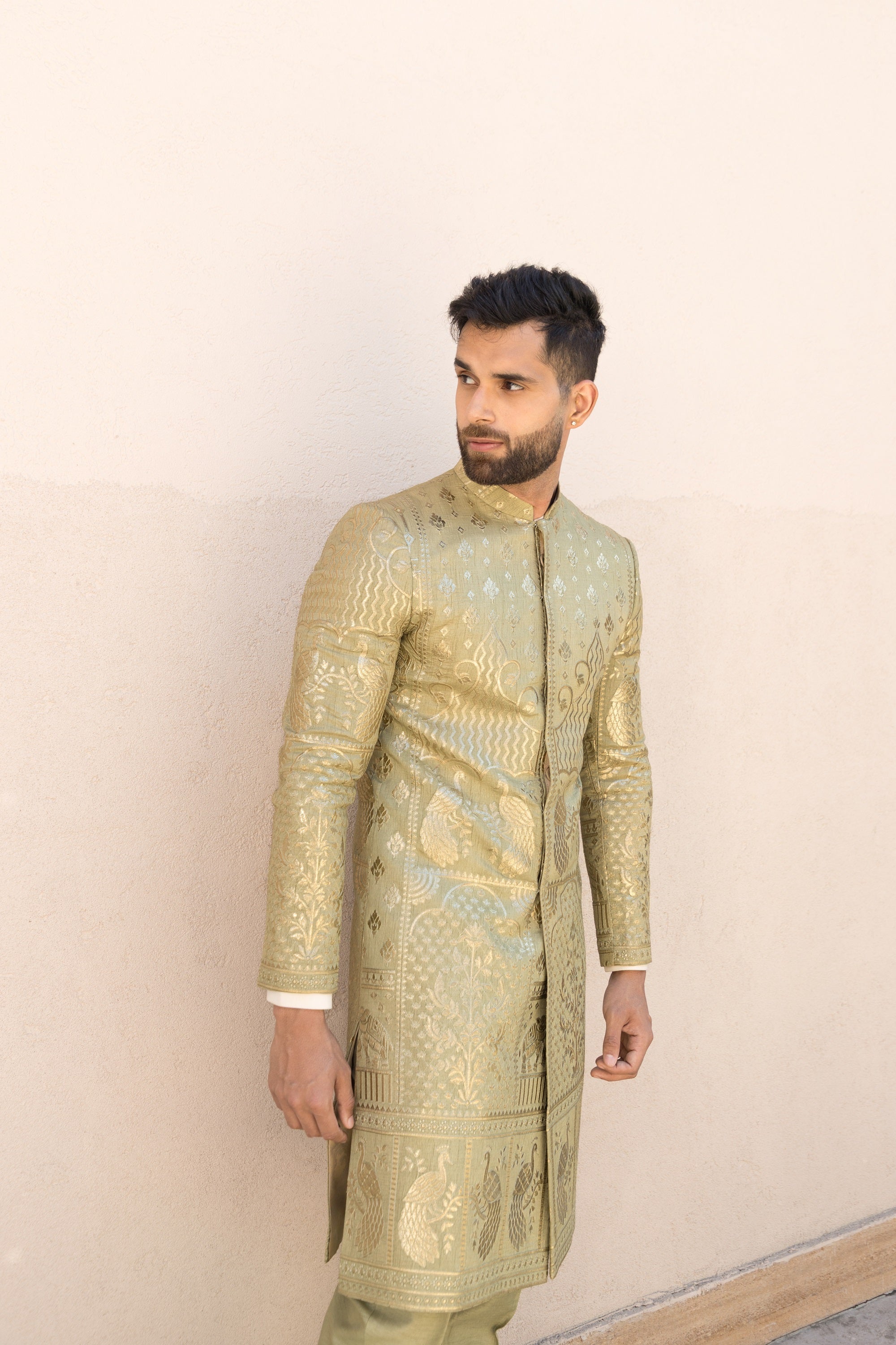 The olive green sherwani set, made from premium silk fabric, offers a perfect blend of opulence and sophistication. The rich, deep hue paired with the smooth, lustrous texture of silk creates a timeless and regal appearance, making it an ideal choice for weddings, festive occasions, or any event where you want to make a statement of style and elegance.