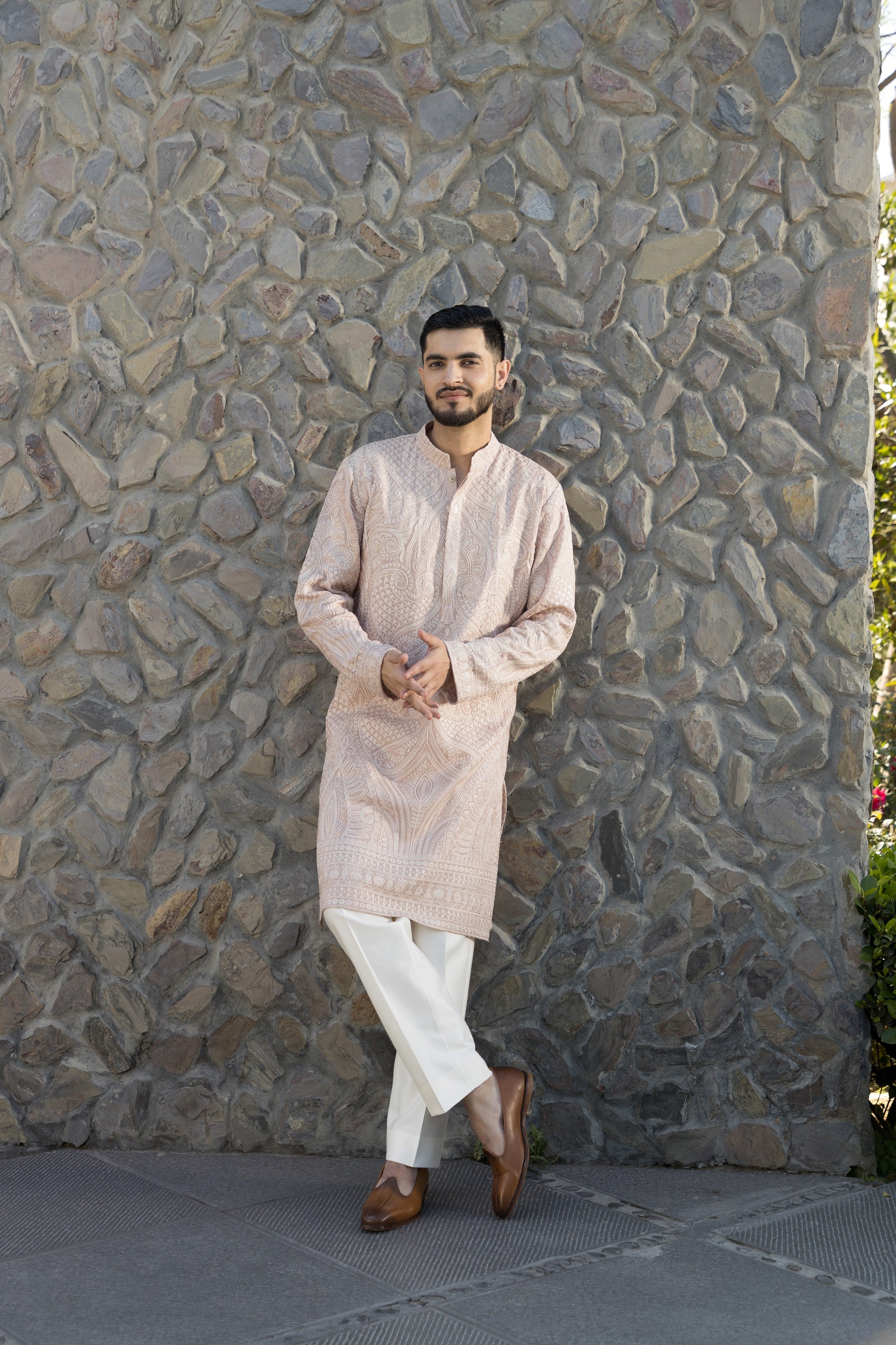 The pink kurta with pyjama, made from a blend of silk cotton fabric, combines the smooth, lustrous finish of silk with the breathability and softness of cotton, creating a comfortable yet stylish ensemble perfect for both relaxed gatherings and formal occasions. The kurta’s refined design is complemented by the lightweight fabric, ensuring comfort throughout the day while exuding a graceful, elegant appeal.