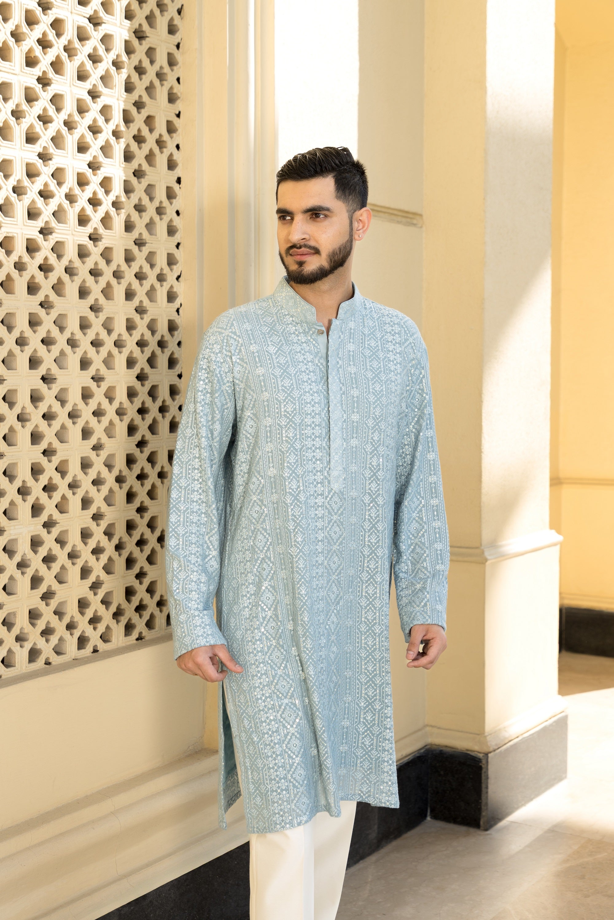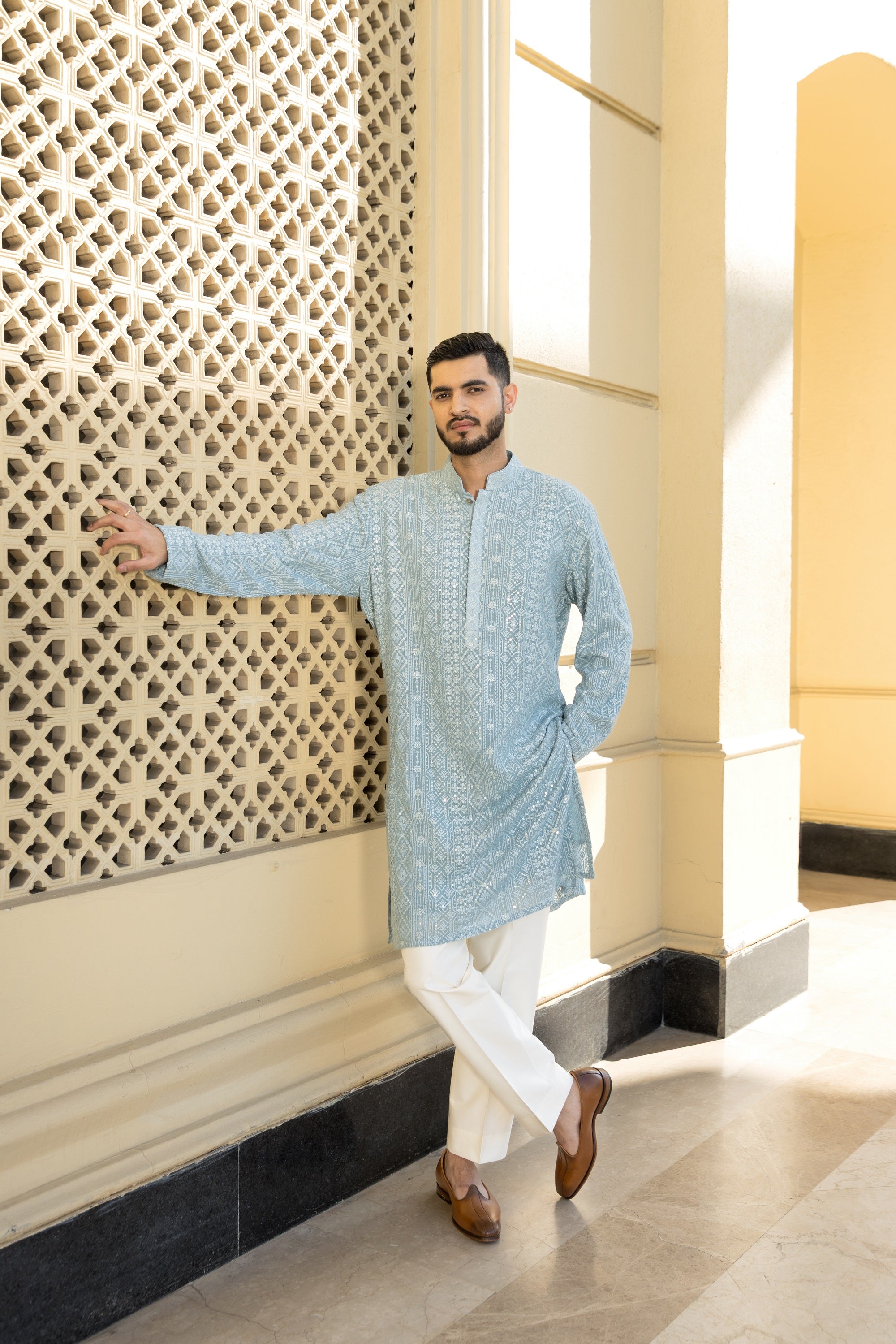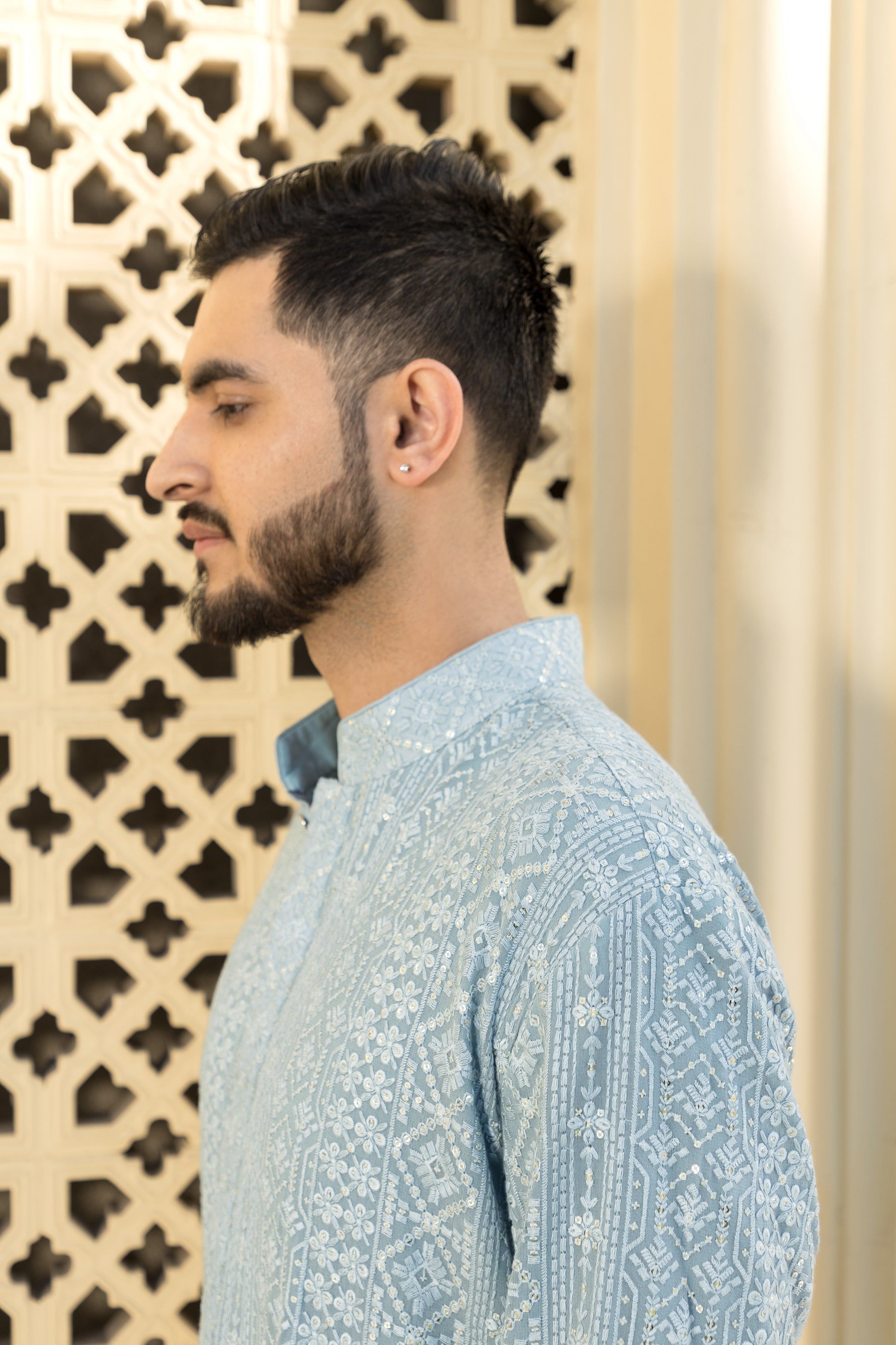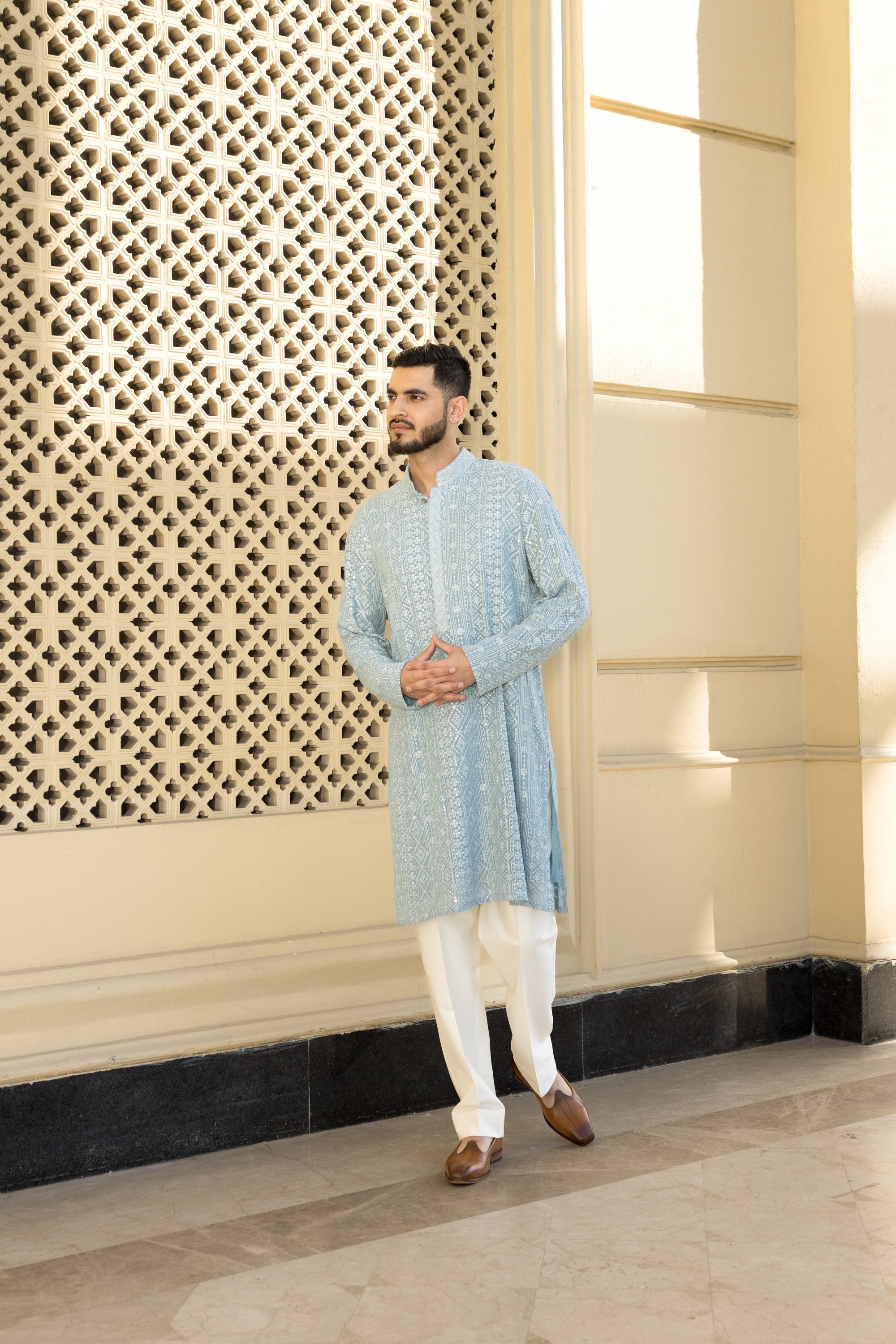 The sky blue Luckhnavi Kurta Pyjama, crafted from the finest georgette fabric, is a stunning fusion of traditional elegance and contemporary comfort. The kurta is beautifully adorned with delicate Luckhnavi chikankari embroidery, a timeless hand-embroidered technique that originates from the heart of Lucknow, India. He sky blue color exudes a serene and fresh vibe, making it a standout choice for weddings, receptions, and cultural gatherings. Whether you're attending a family celebration or a formal event, this Luckhnavi Kurta Pyjama set will ensure you make a lasting impression with its timeless appeal and impeccable craftsmanship.