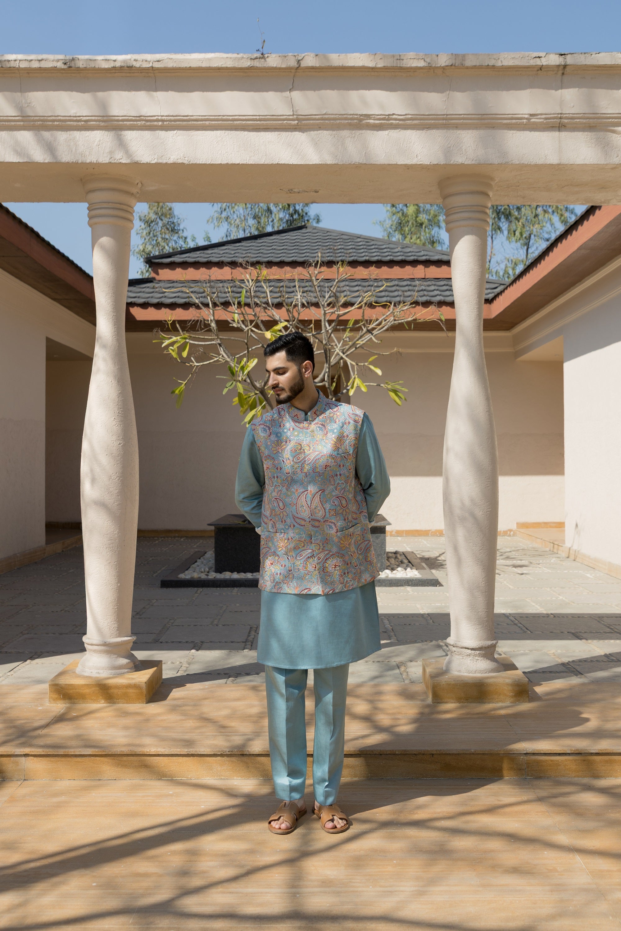 The light blue nehru jacket set, crafted from luxurious silk fabric