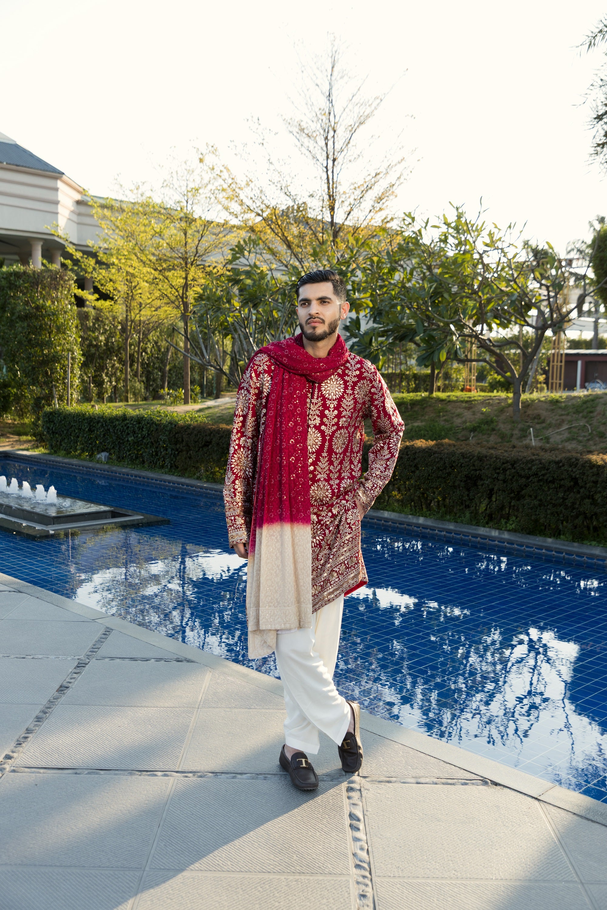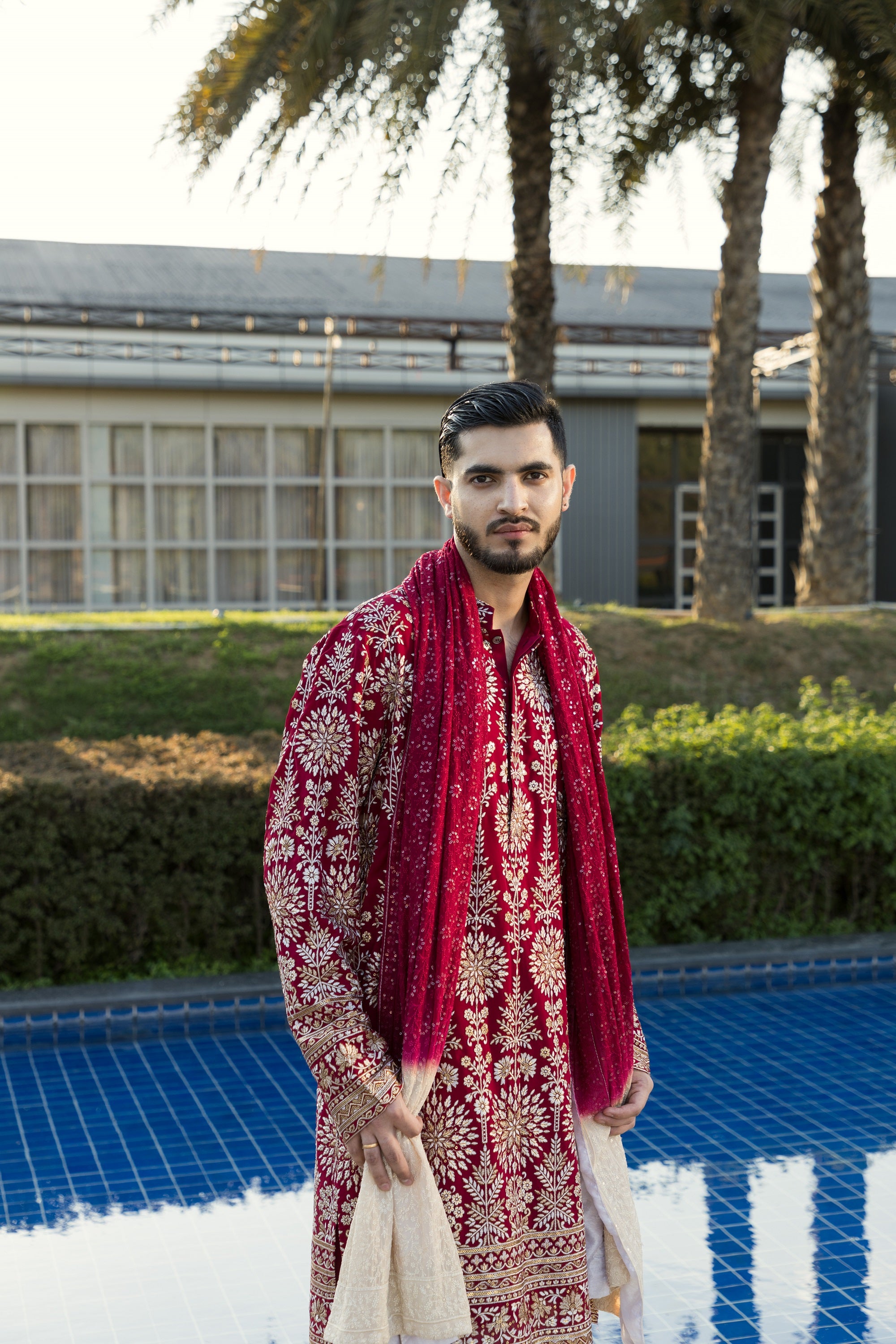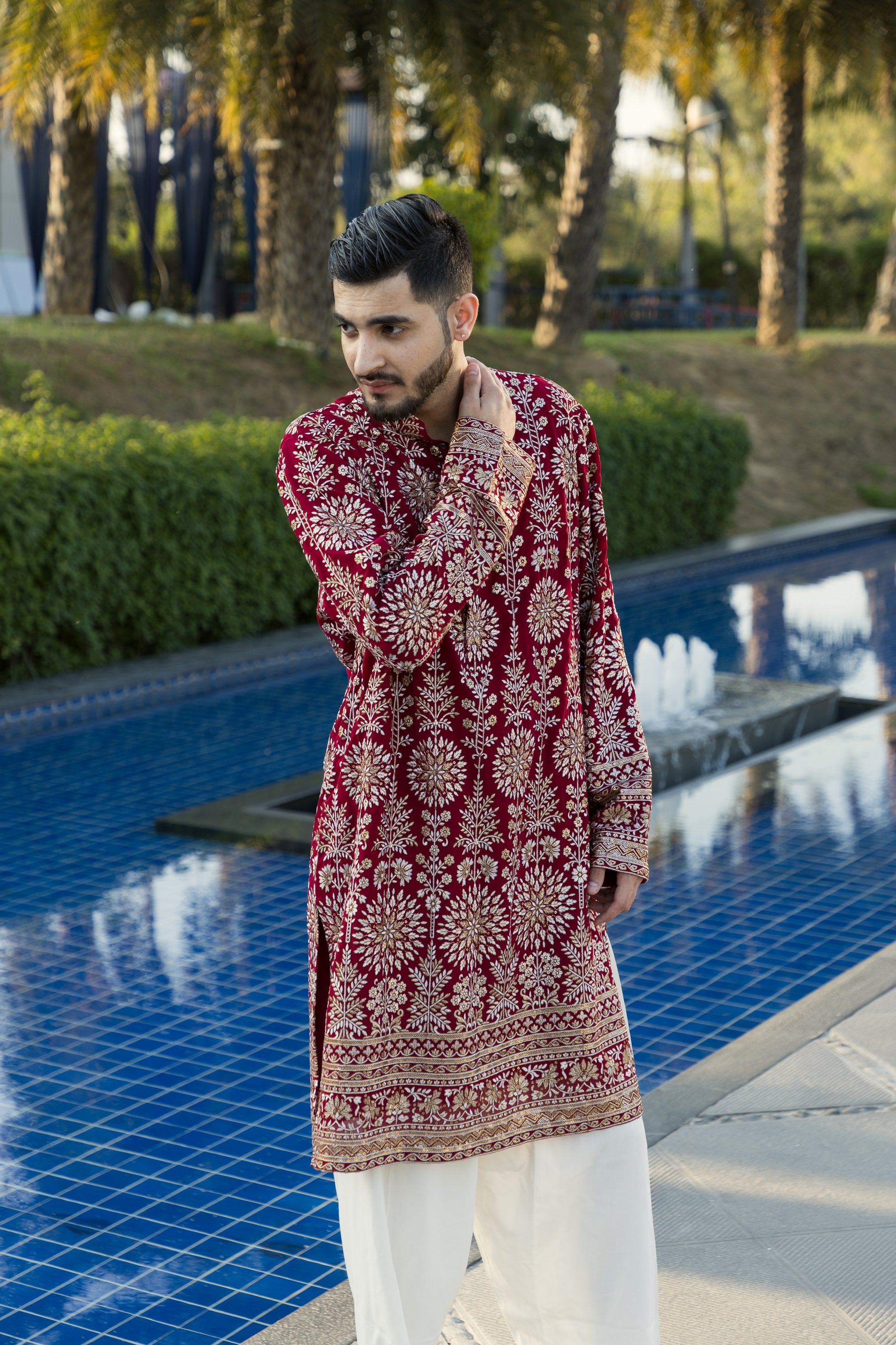 The maroon kurta and pyjama, crafted from smooth georgette fabric