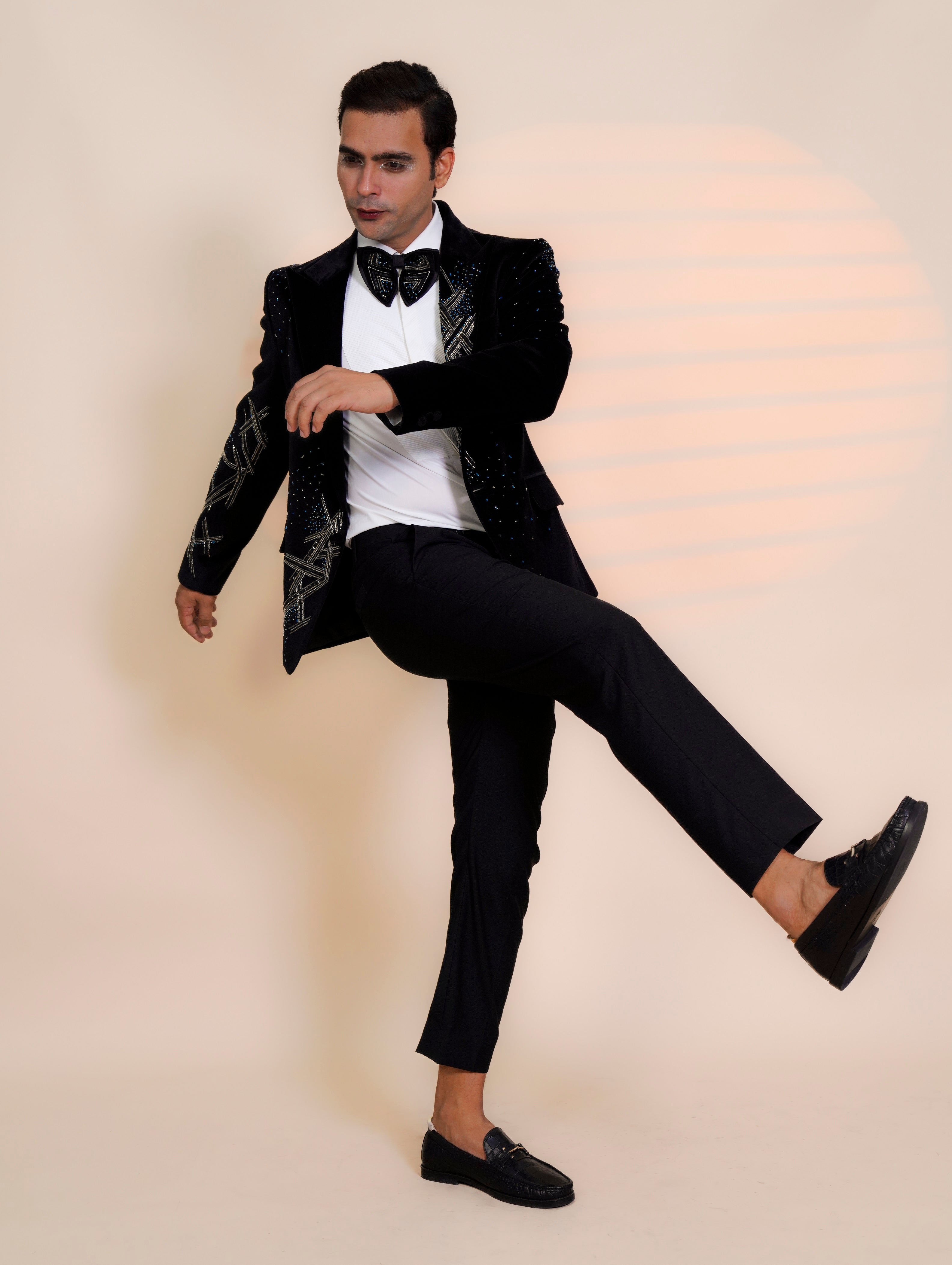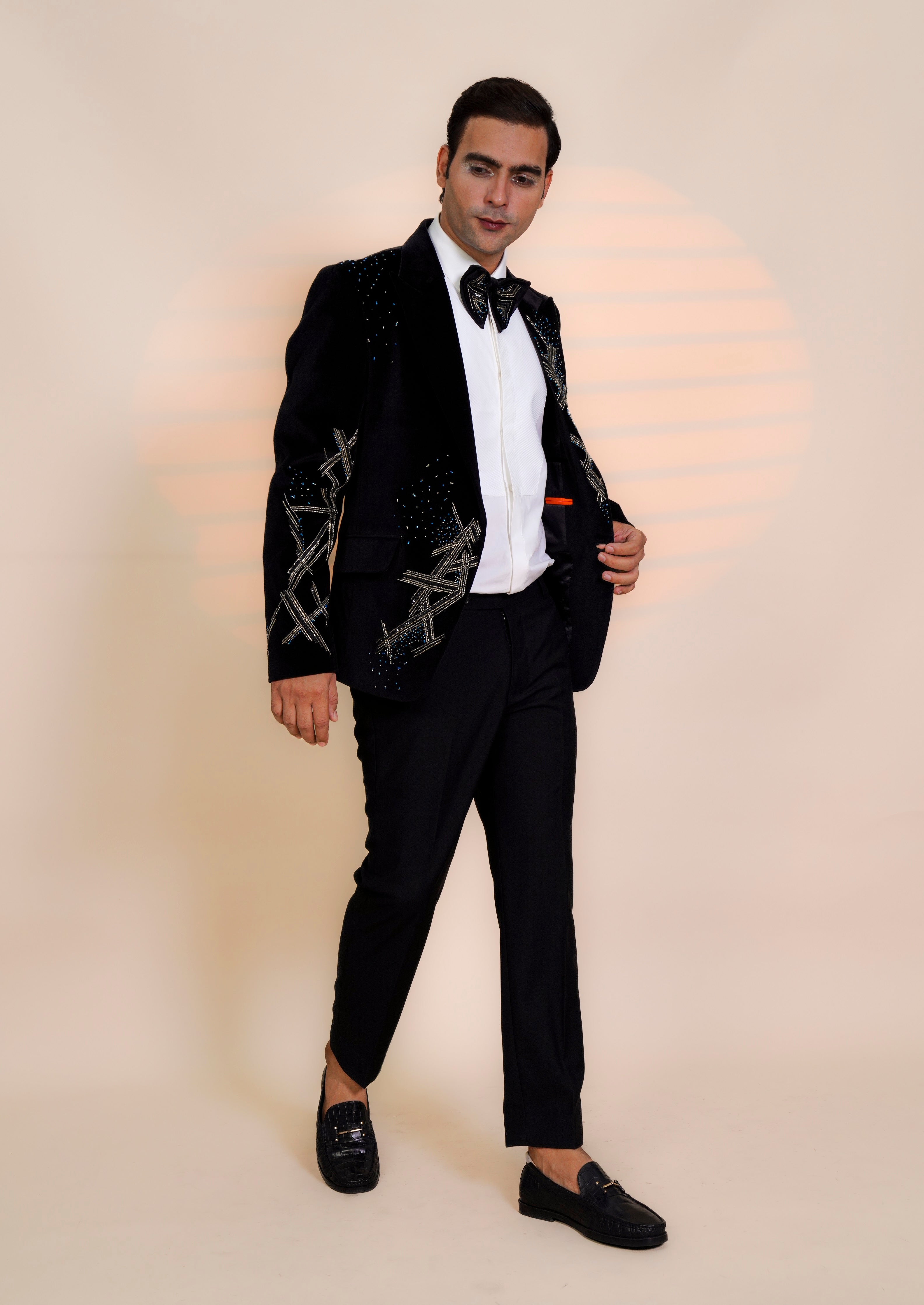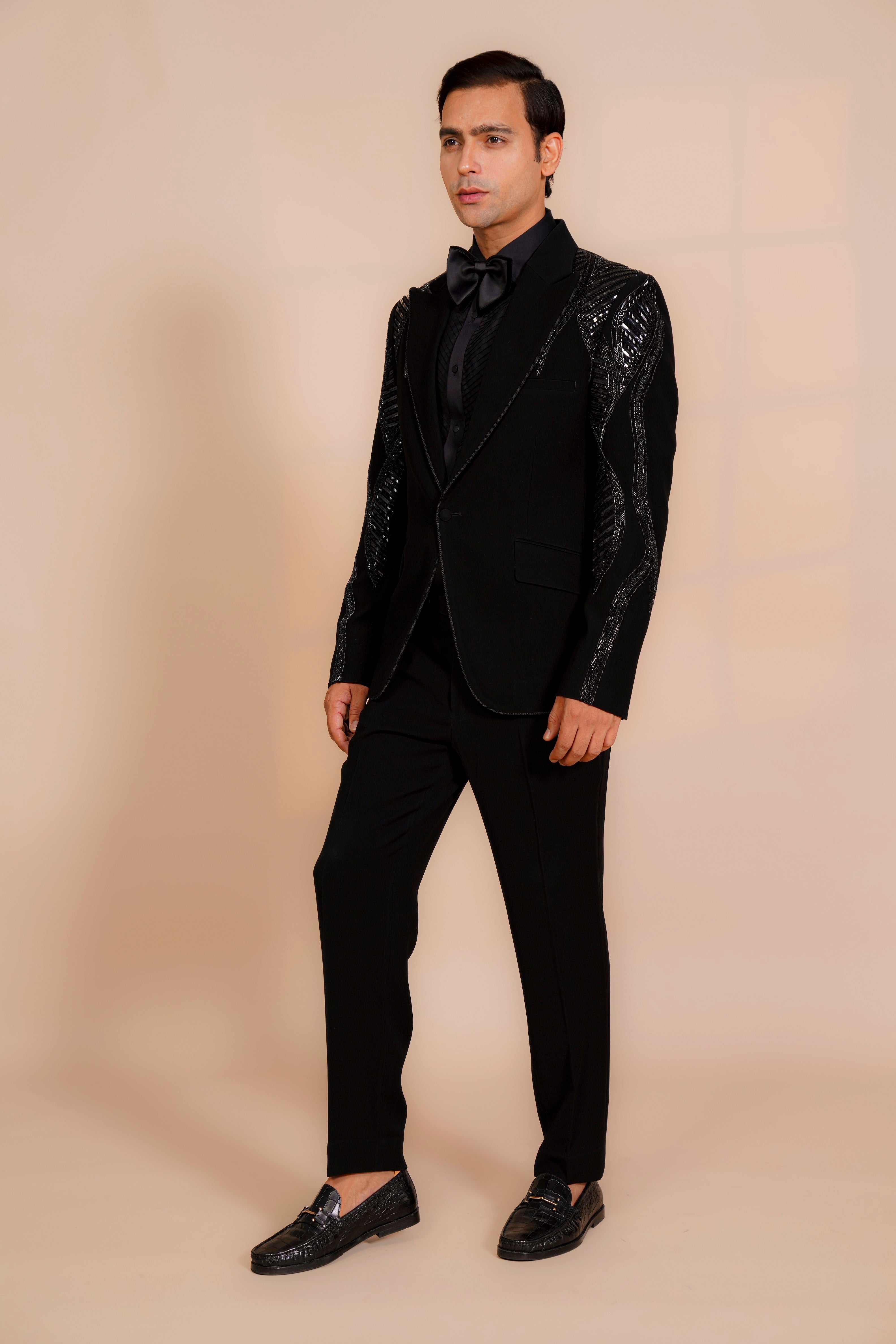 The black nehru jacket set, crafted from premium italian stretch fabric