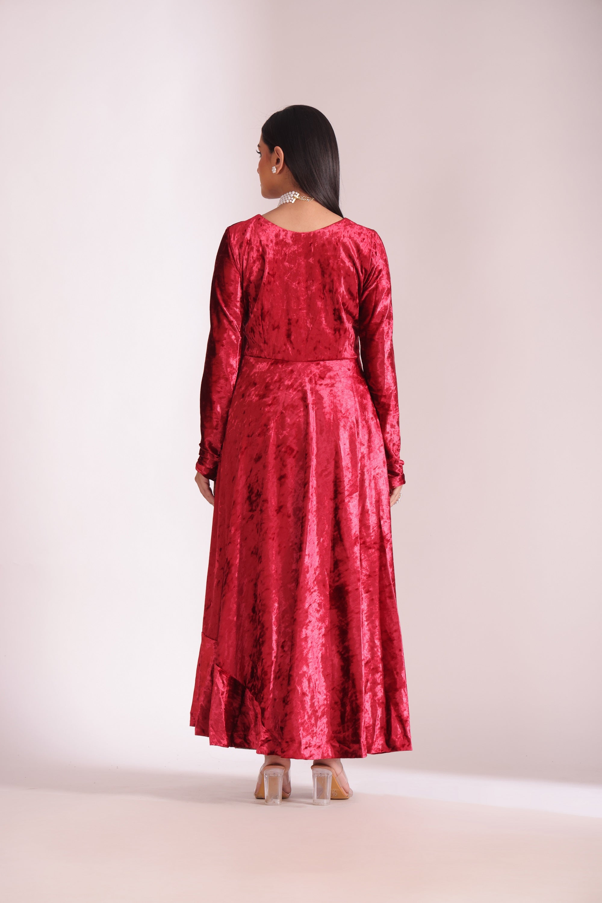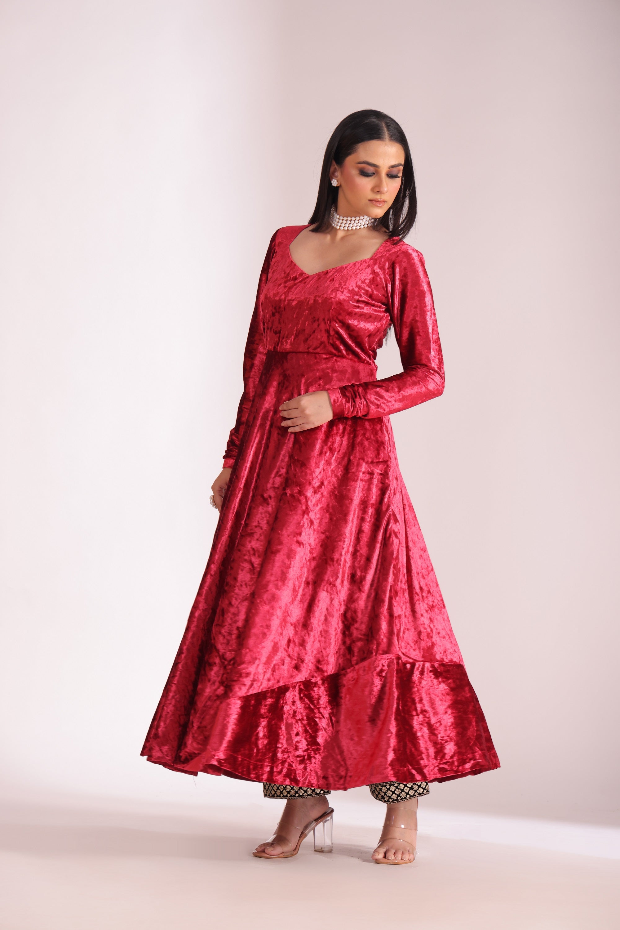 Noor-e-zar red velvet anarkali with velvet palazzo and shawl - set of 3