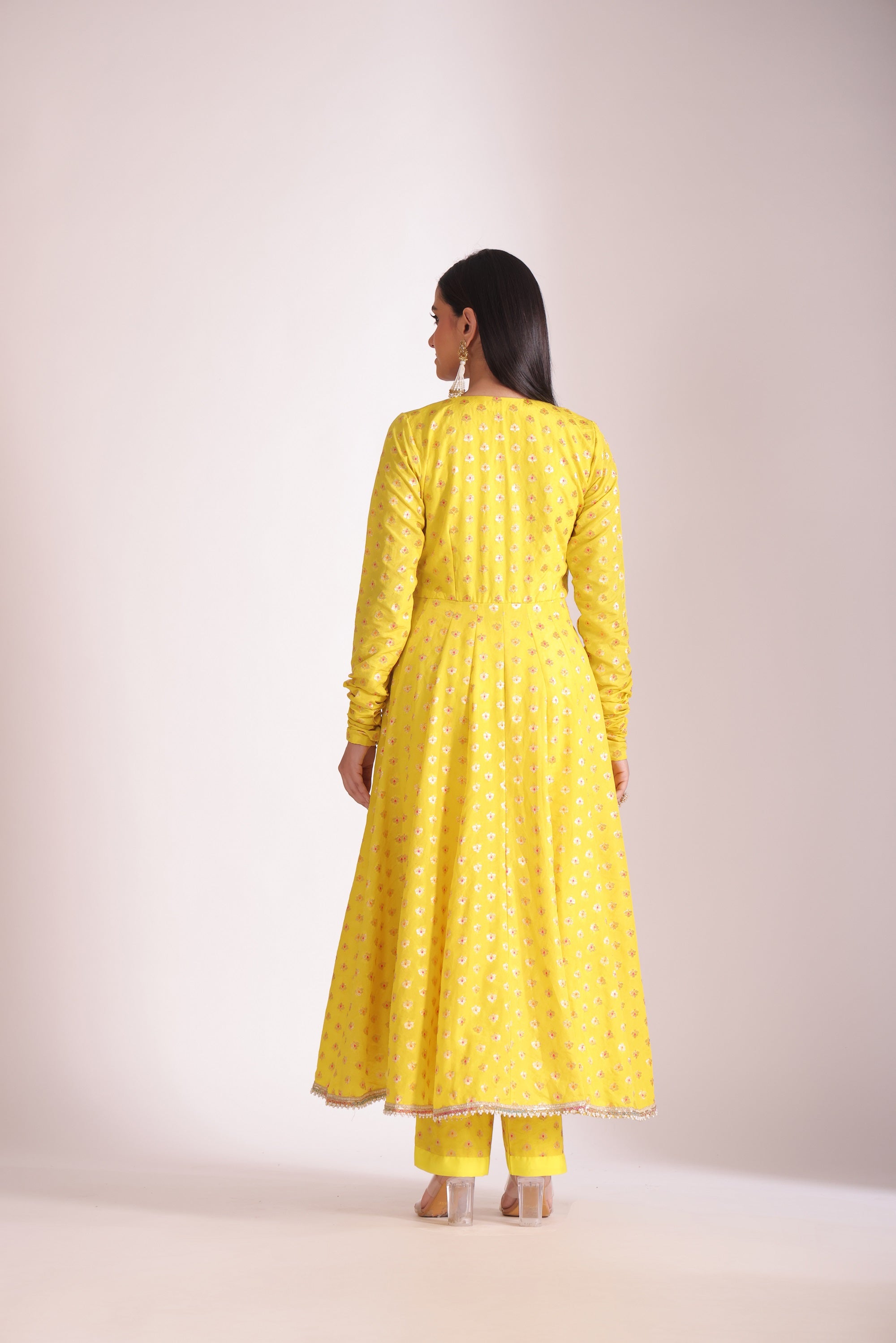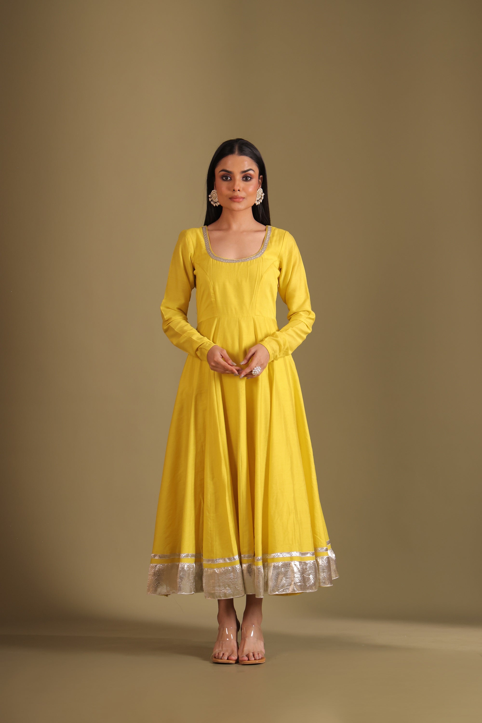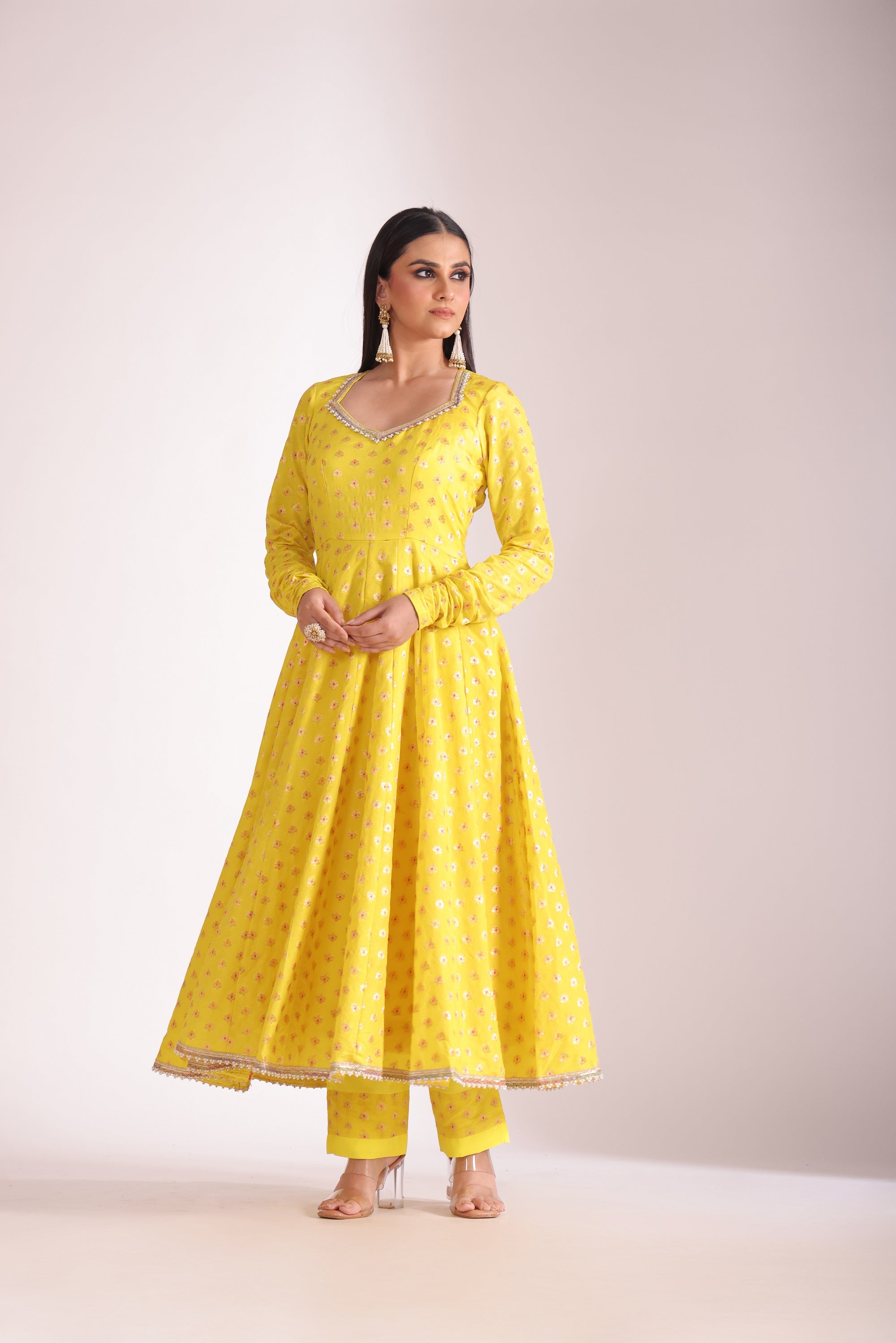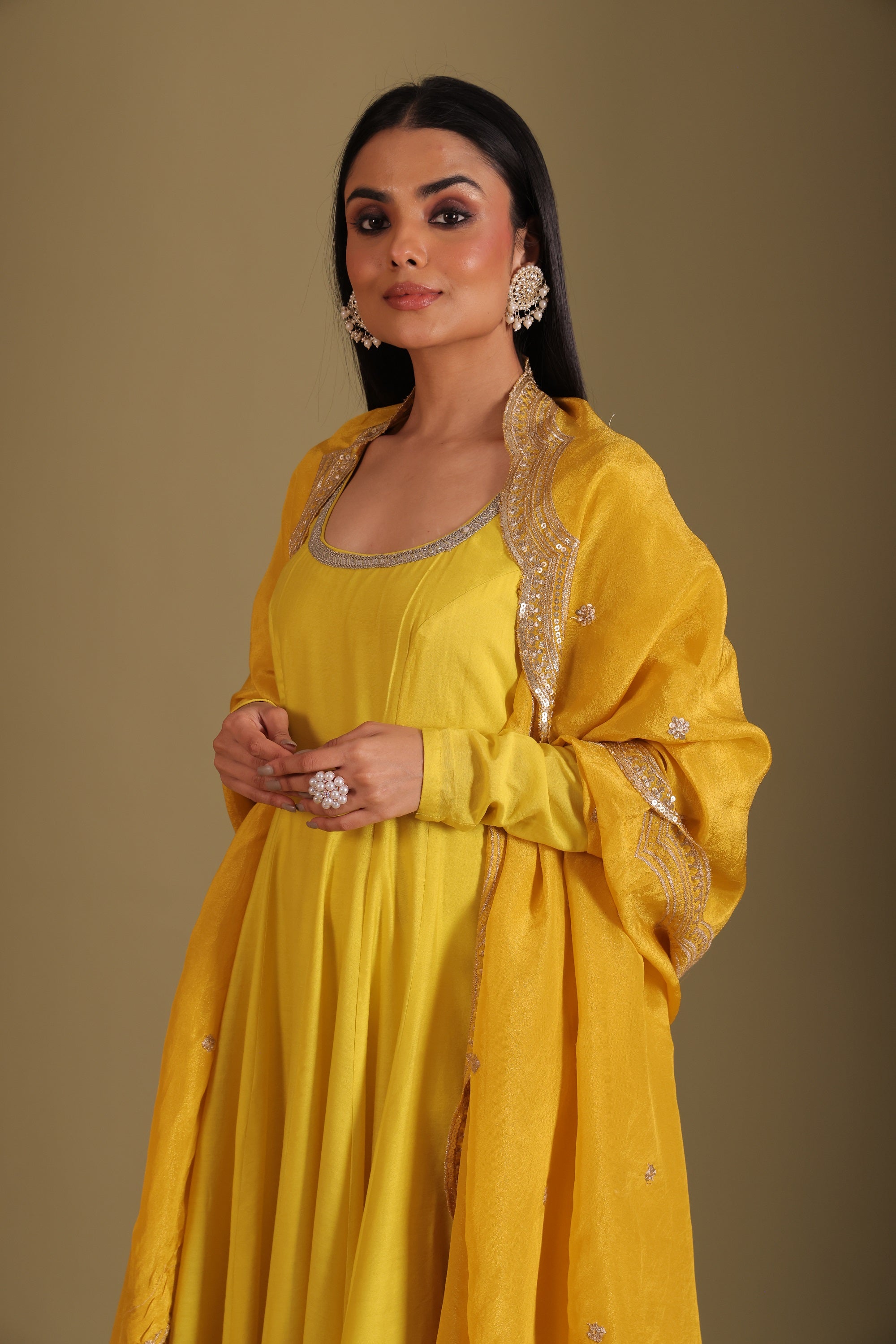 Noorika yellow silk anarkali with pant and dupatta- set of 3