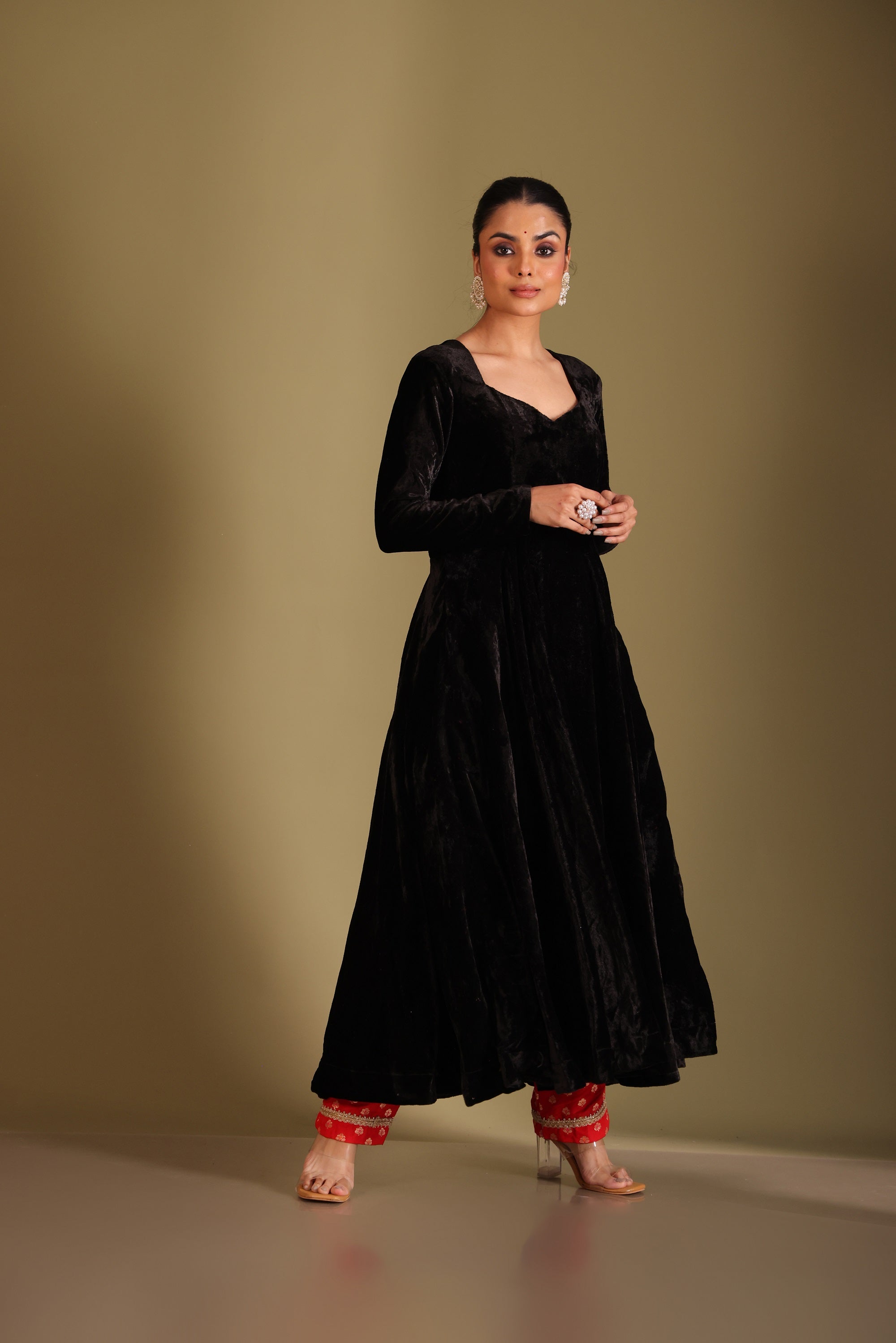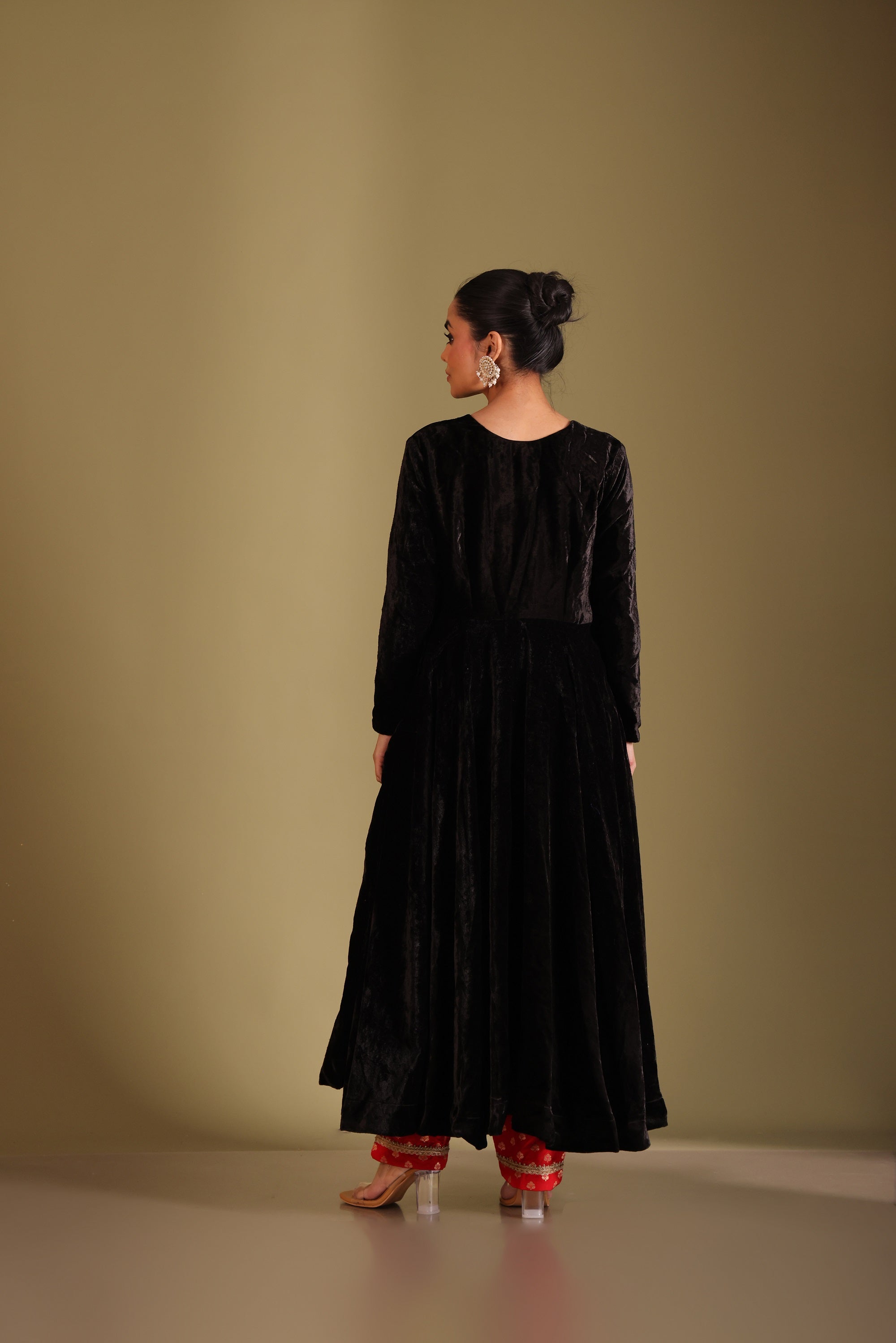 Noor-e-zar black velvet anarkali with silk pants and shawl - set of 3