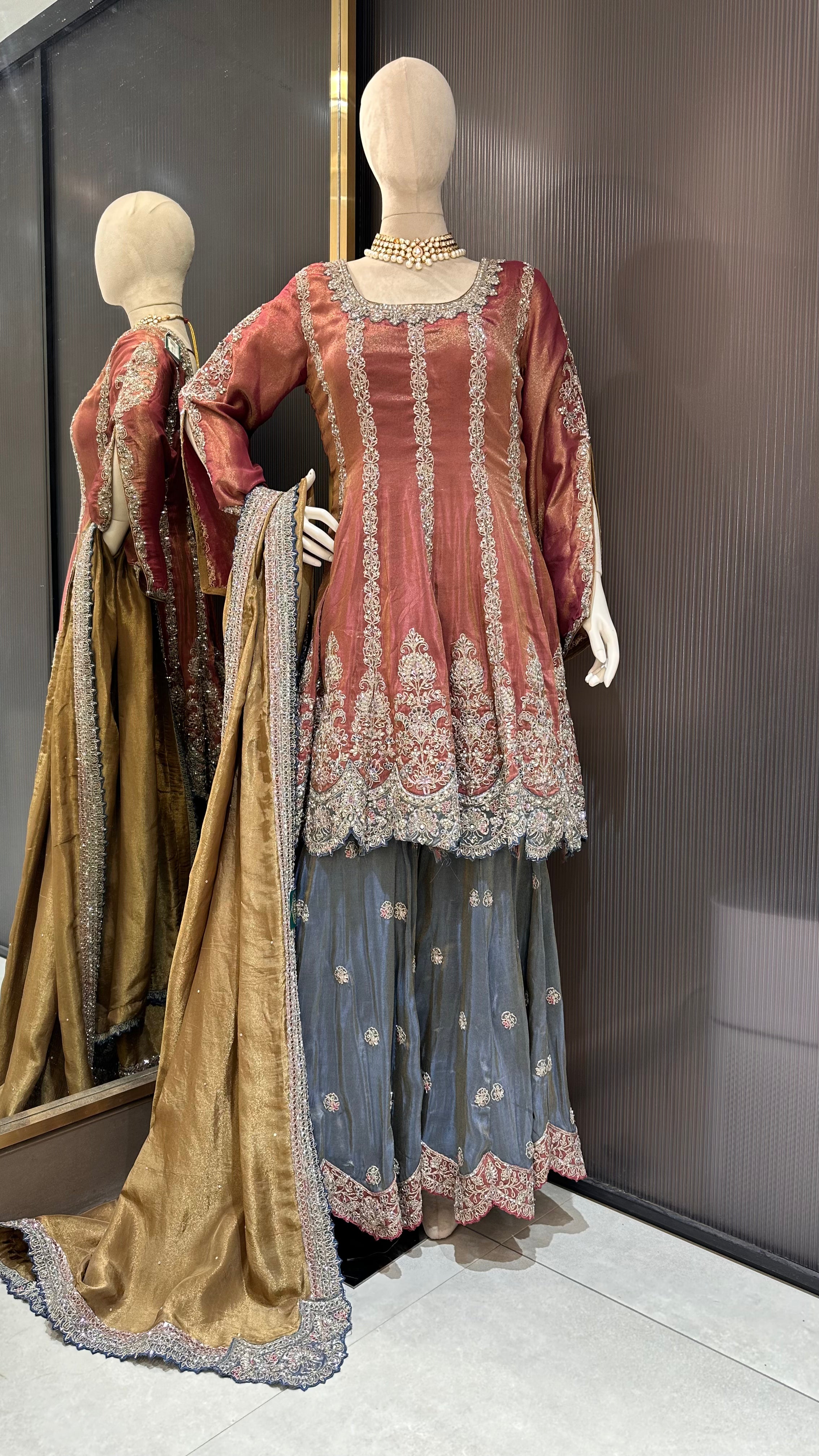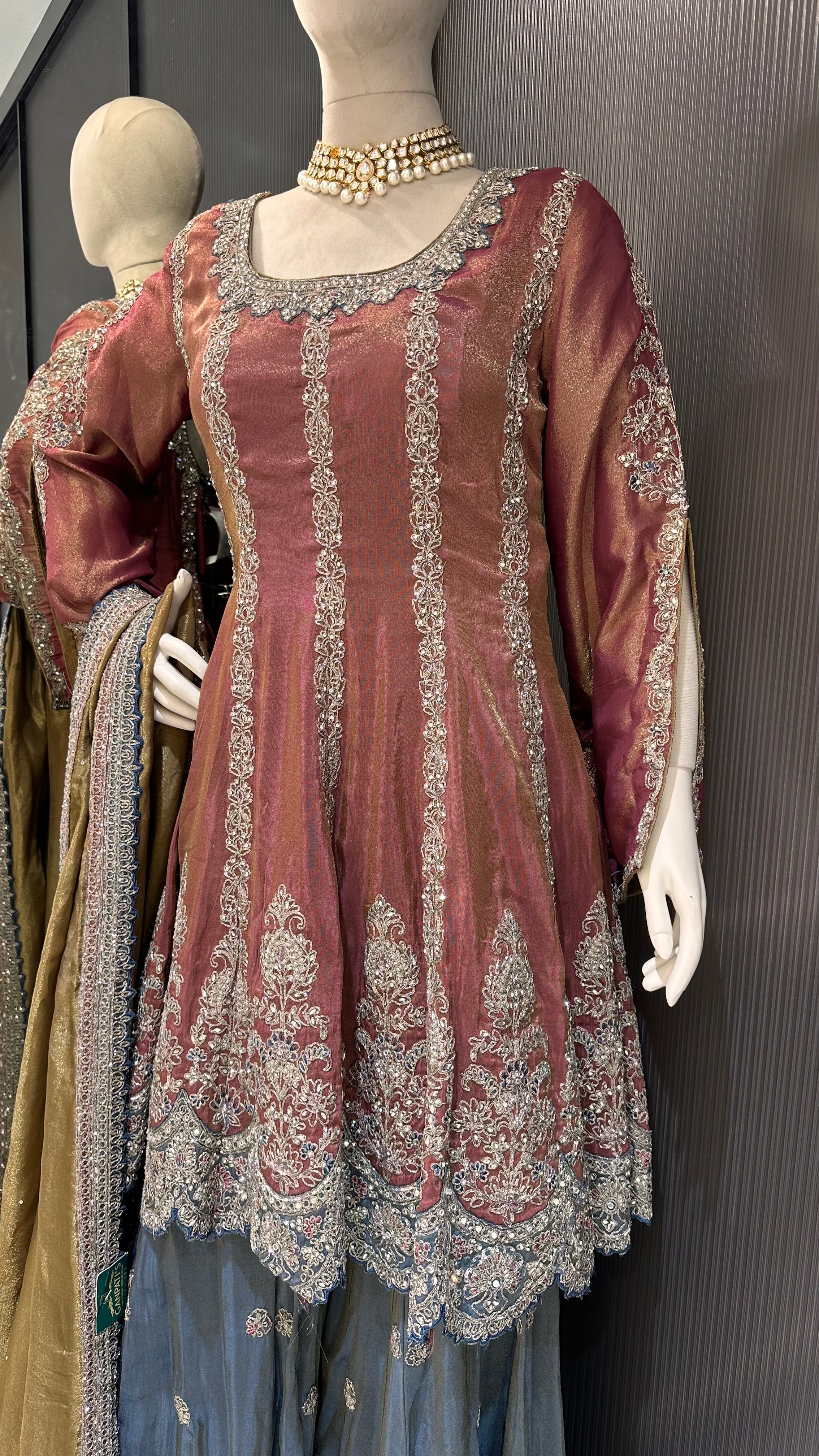 Elevate Your Festive Wardrobe With This Exquisite Contrast Suit Featuring An Anarkali And Garara, Crafted Entirely From Luxurious Shimmer Silk Fabric. The Rich Texture Of Shimmer Silk Adds A Subtle Sparkle And Opulent Glow, Making This Ensemble Perfect For Weddings, Receptions, And Grand Celebrations. The Anarkali Is Designed With A Flowing Silhouette That Flatters Every Figure, Paired Seamlessly With A Wide-Legged Garara That Adds Volume And Traditional Elegance To Your Look. The Highlight Of This Set Is The Beautifully Coordinated Shimmer Silk Dupatta, Which Complements The Contrast Suit Perfectly, Adding A Delicate Shimmer That Catches The Light With Every Movement. The Rich Interplay Of Colors In The Contrast Suit Creates A Striking Visual Appeal, While The Soft Shimmer Silk Fabric Ensures Comfort Without Compromising Style. Intricate Detailing And Fine Craftsmanship Come Together In This Ensemble To Offer You A Timeless Fusion Of Classic Tradition And Contemporary Fashion. Pair It With Statement Jewelry And Heels To Complete A Regal Look That Will Make You The Center Of Attention At Any Festive Occasion.