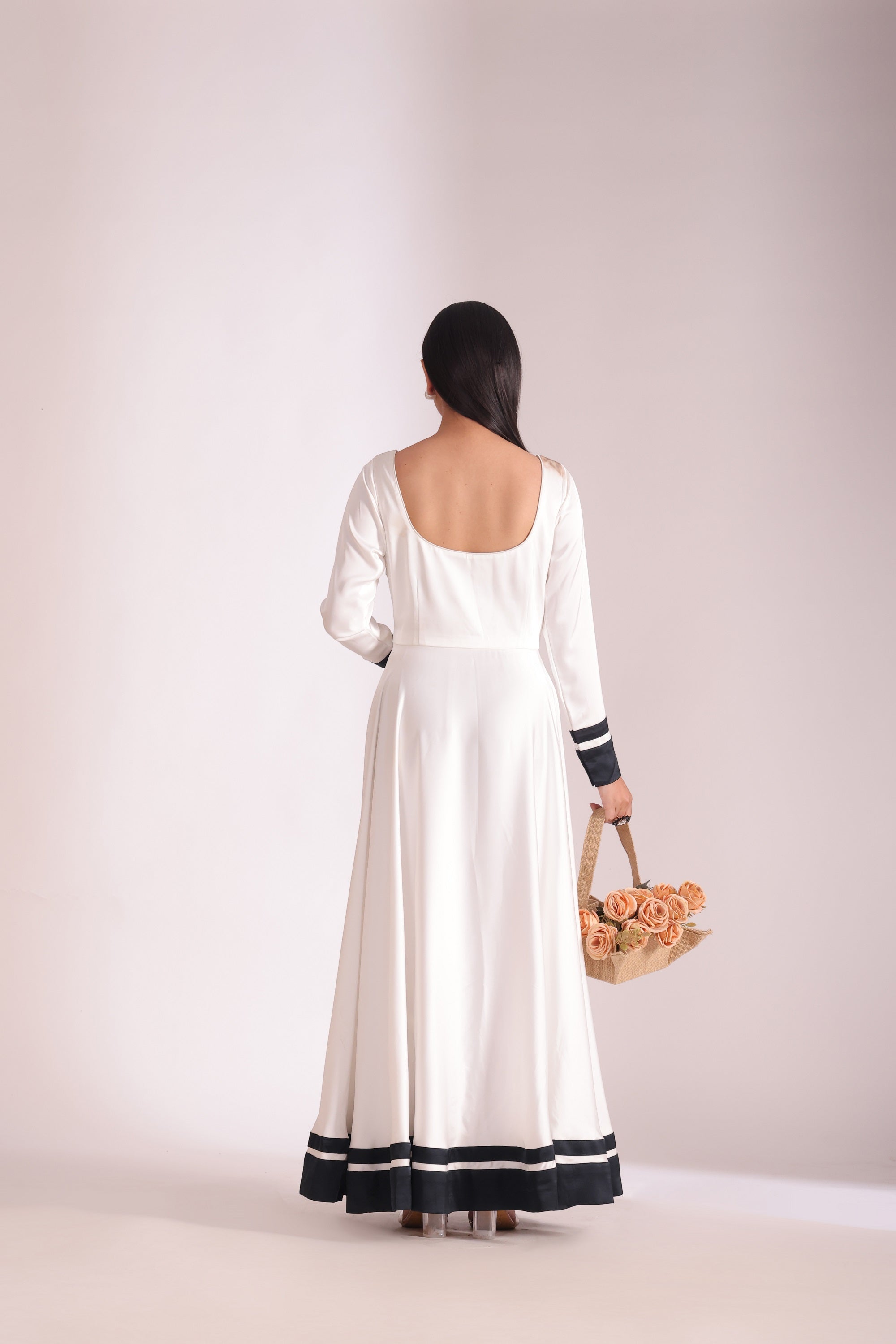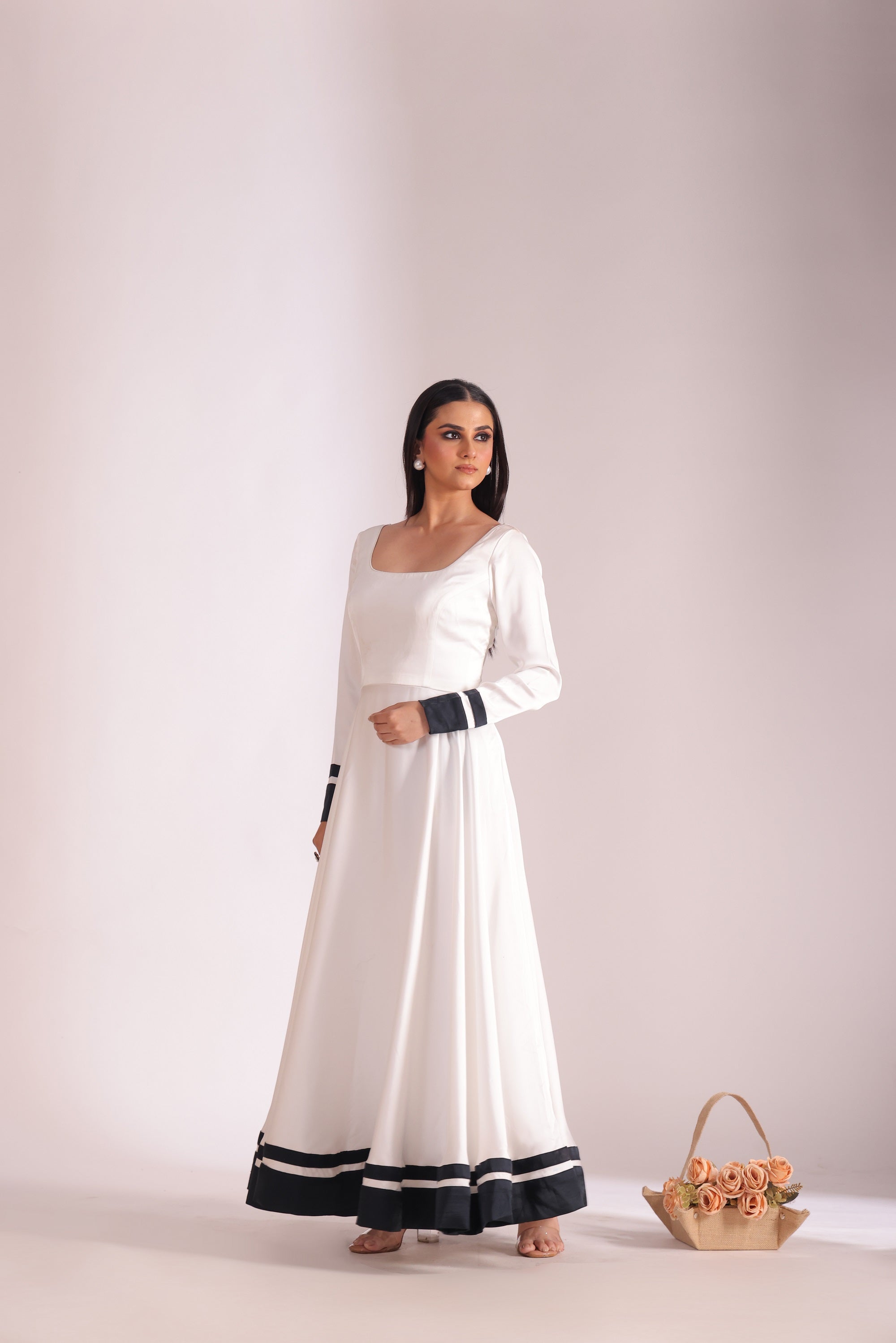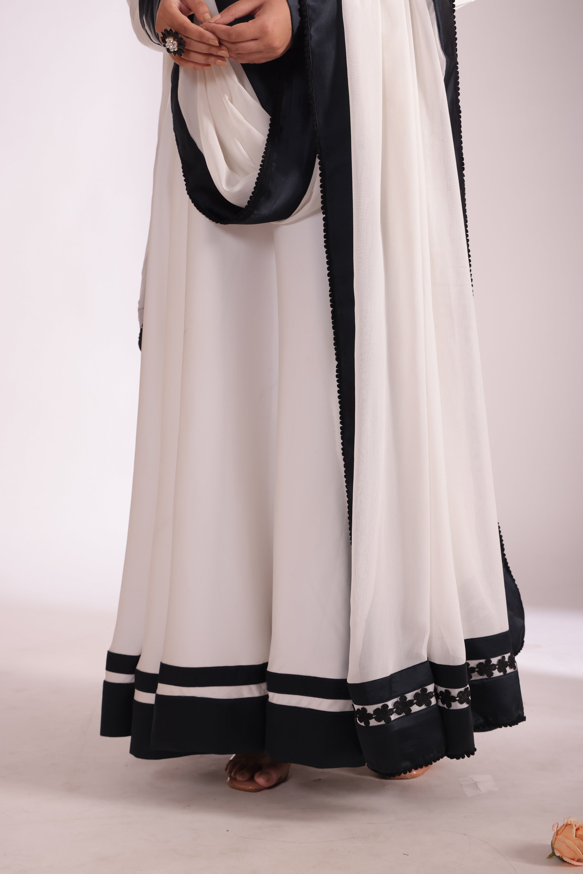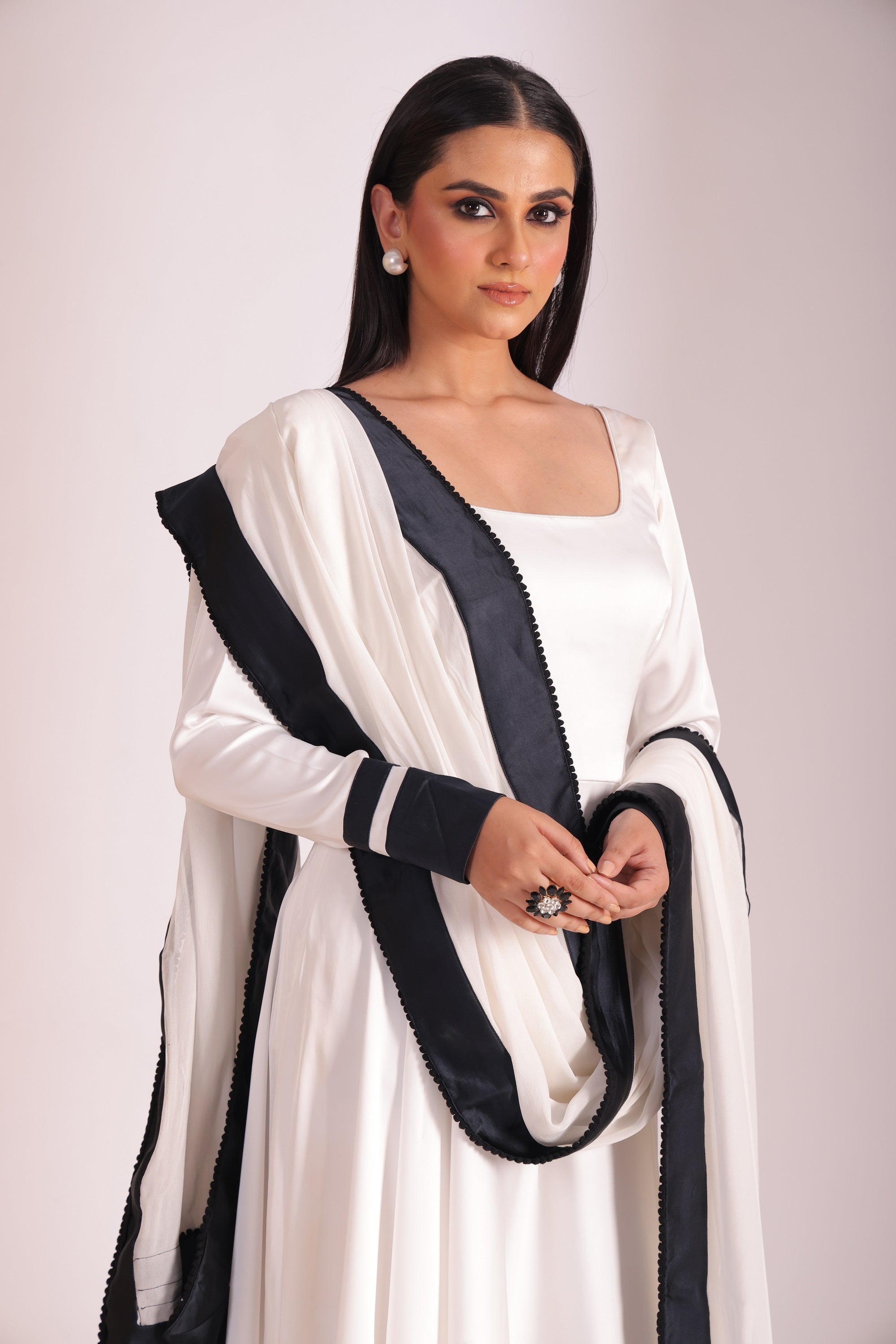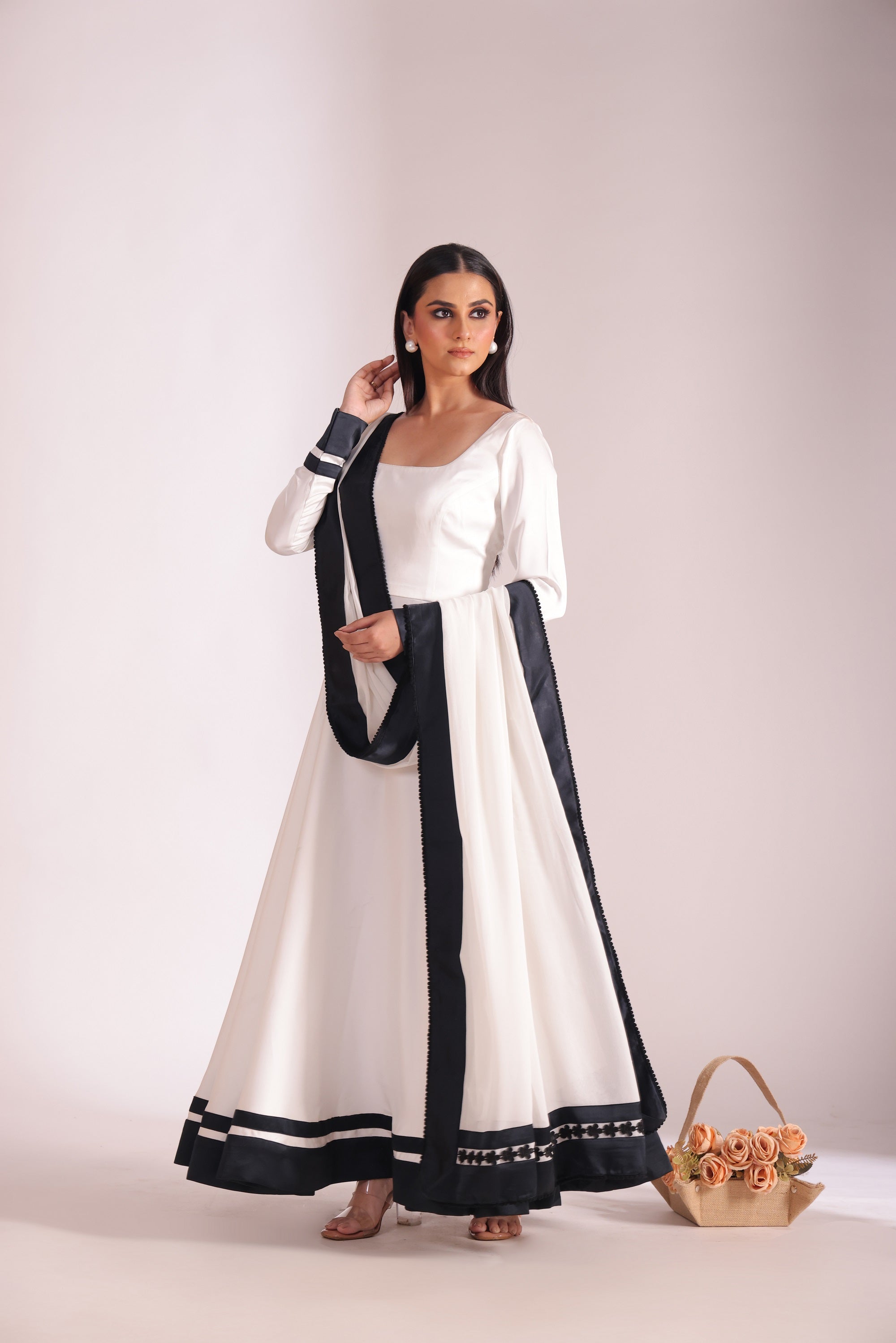 This Three Piece Set Includes Anarkali, Churidar And Dupatta White Satin Round Neckline Anarkali With Black Satin Border In The Hem And Sleeves. White Churidar. White Georgette Dupatta With Black Satin Border With Floral Black Lace Finishing's.