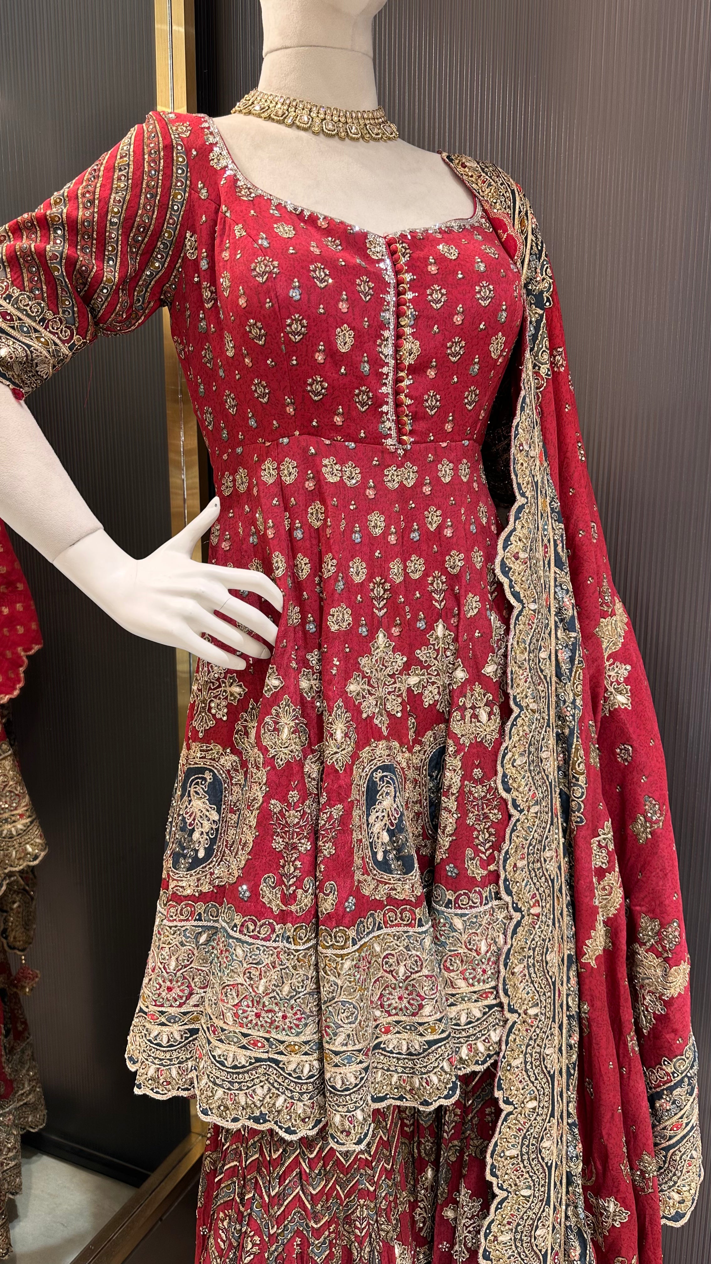 Turn Heads With This Stunning Maroon Short Anarkali Paired With A Garara Crafted In High-Quality Digital Crepe Print Fabric. The Rich Maroon Color Adds Depth And Elegance, Making It A Perfect Choice For Festive Gatherings, Wedding Functions, Or Traditional Celebrations. Designed To Combine Heritage With A Modern Twist, The Short Anarkali Features A Flattering Silhouette That Enhances Your Natural Curves, While The Flared Garara Adds Volume, Grace, And A Touch Of Royal Charm. The Digital Crepe Print Brings Contemporary Flair To Classic Ethnic Wear, With Intricate Patterns That Add Visual Interest Without Overwhelming The Design. Lightweight, Breathable, And Easy To Carry, The Crepe Fabric Ensures Comfort And Fluid Movement, Allowing You To Enjoy Every Moment In Style. Whether Paired With Statement Earrings And Juttis Or Styled With Subtle Accessories For A More Refined Look, This Maroon Anarkali And Garara Set Is A Versatile Addition To Your Ethnic Wardrobe—Effortlessly Fusing Tradition With Trend.