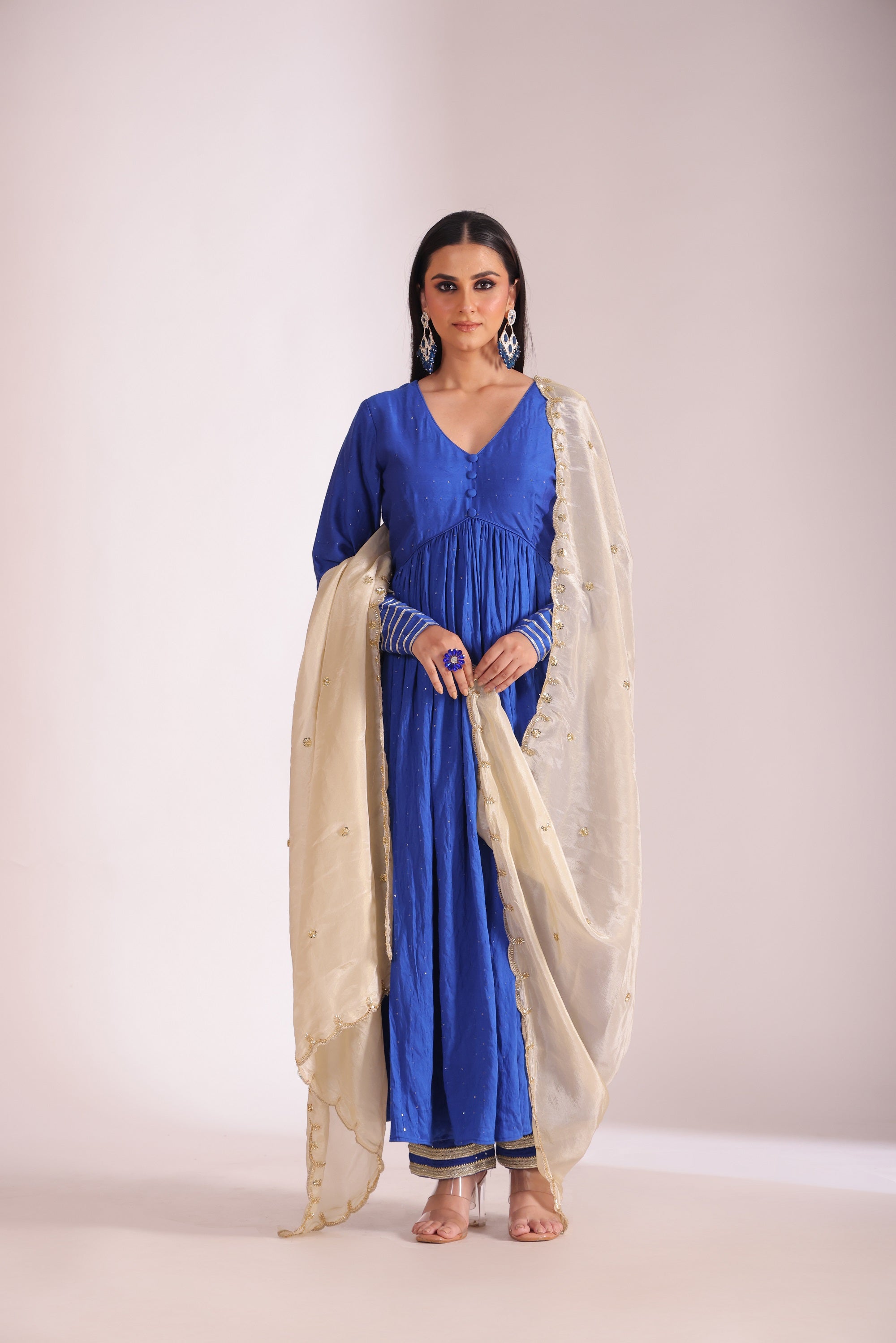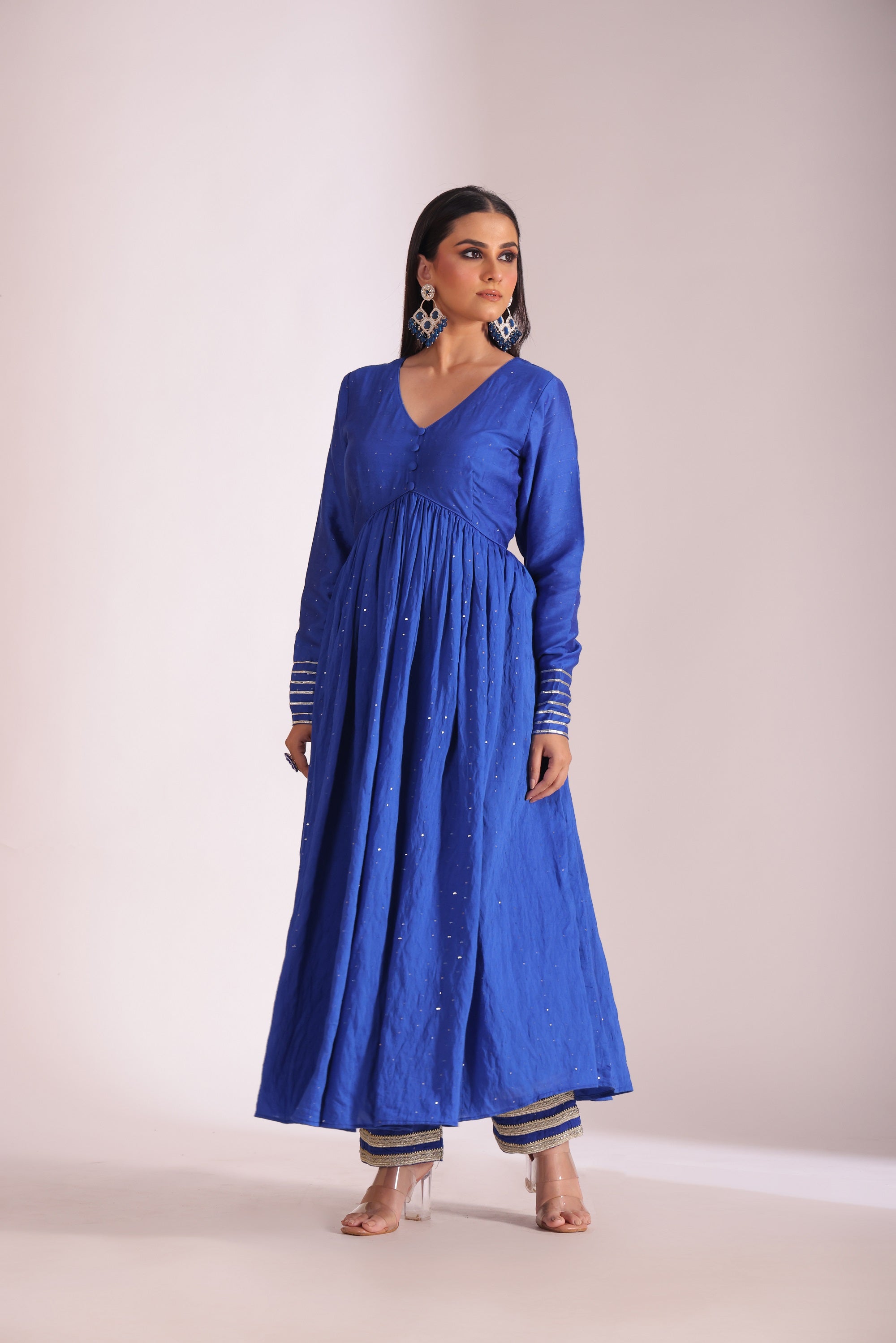 "This Set Includes Anarkali, Palazzo, And Dupatta. The Anarkali Features Delicate Sequins In Blue Chanderi, Designed With A Flattering V-Neckline And Sleeves With Gota Detailing, Leading Into Soft Gathers That Create A Flowing, Elegant Silhouette. It Is Paired With Chanderi Palazzo For Comfort And Fluidity With Detailed Gota And Dori Work At The Hem The Look Is Completed With A Contrast Tissue Dupatta, Finished With Intricate Embroidery And Scalloped Edges For A Graceful And Festive Finish.