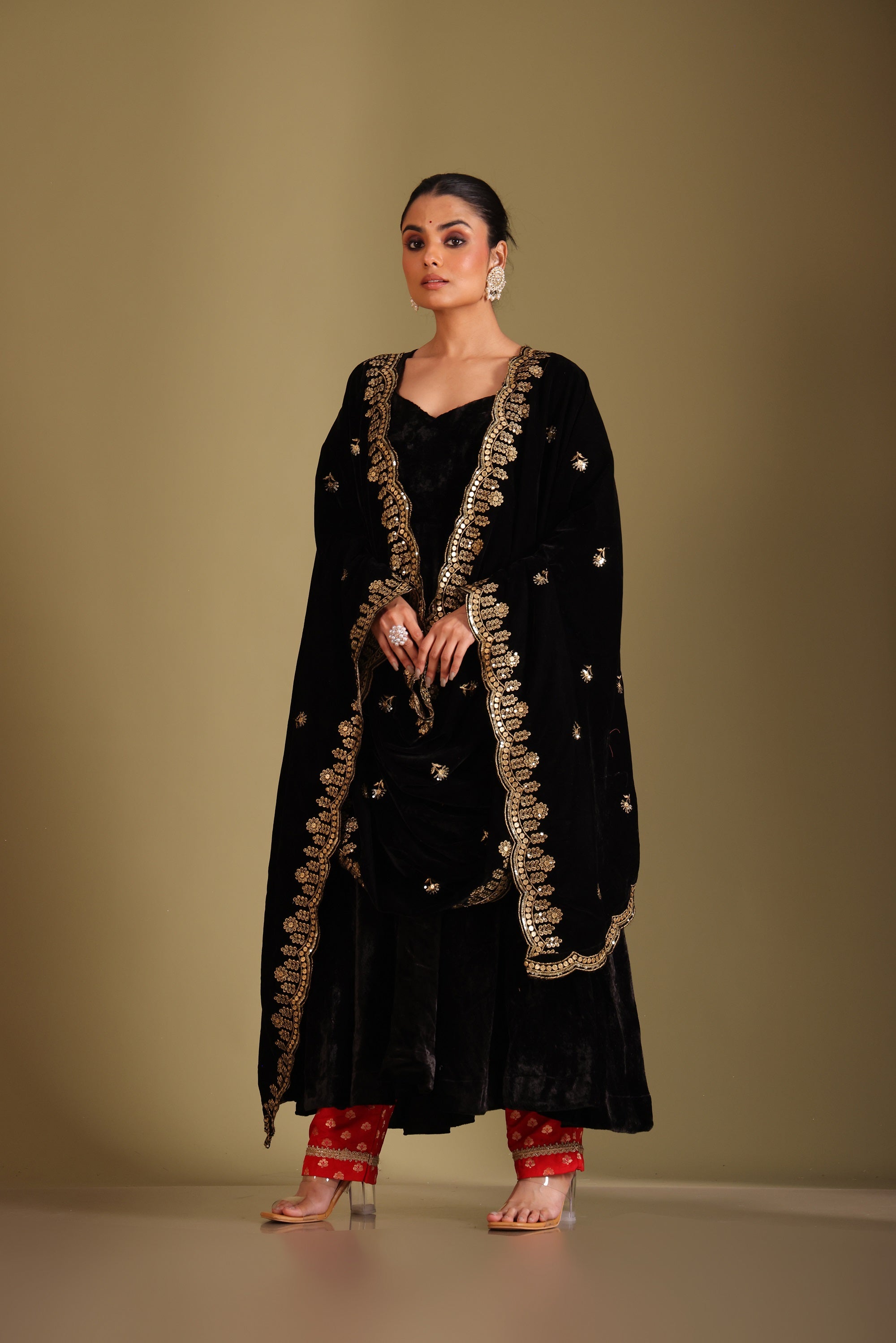 Noor-e-zar black velvet anarkali with silk pants and shawl - set of 3