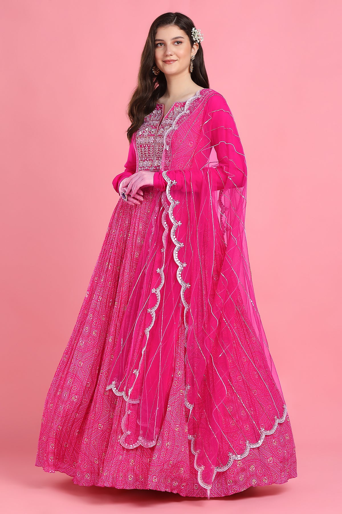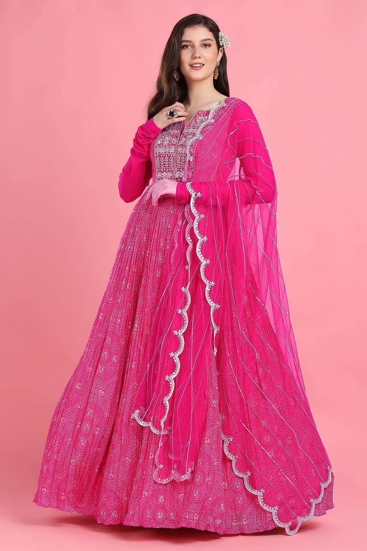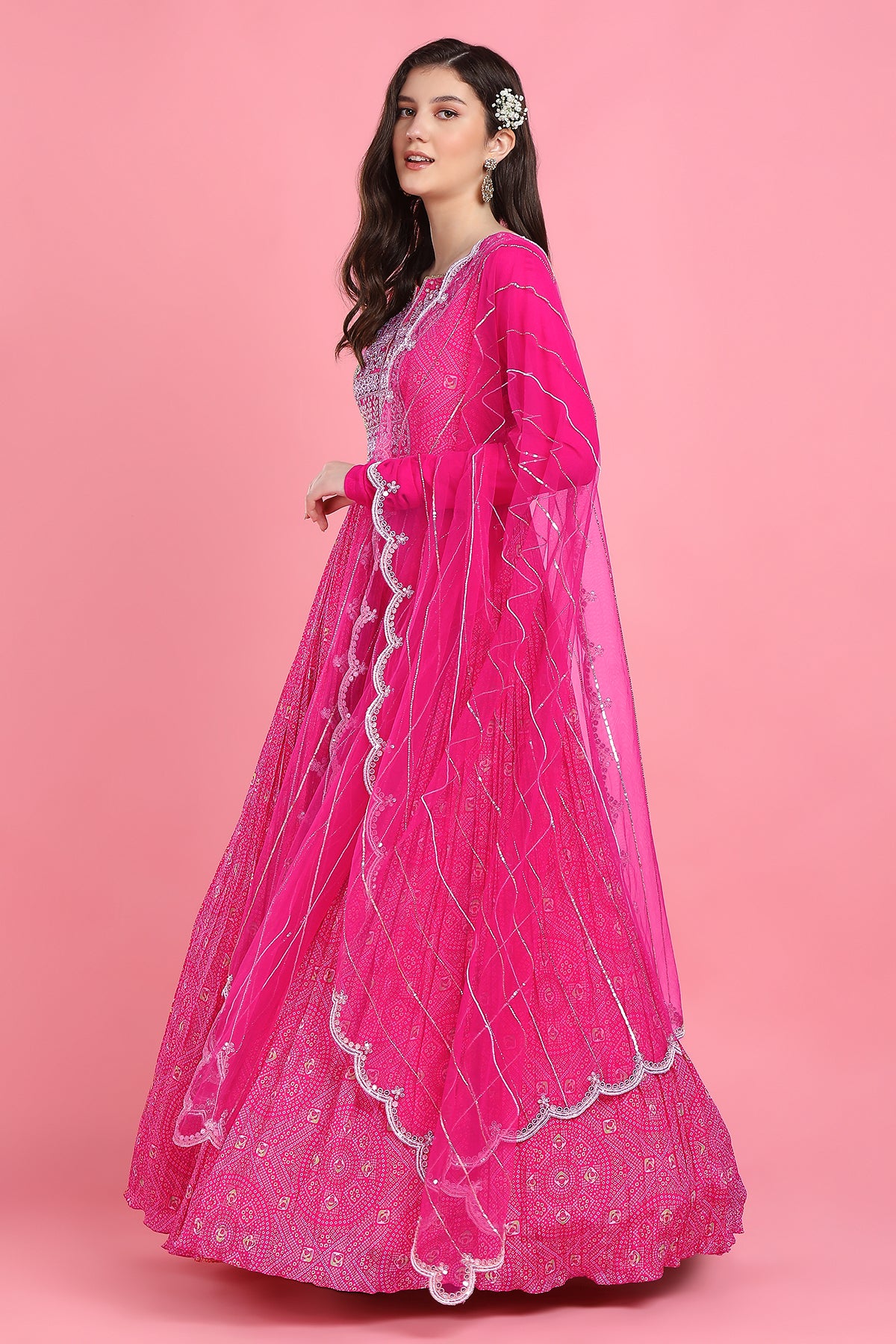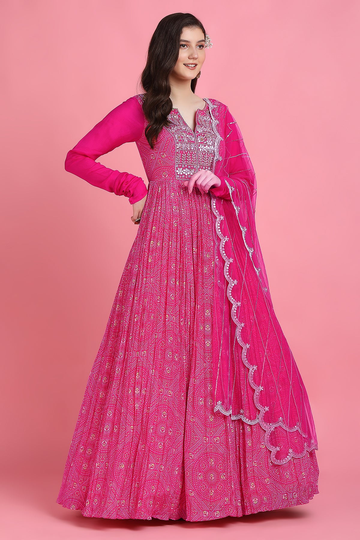 Pink yoke bandhni anarkali