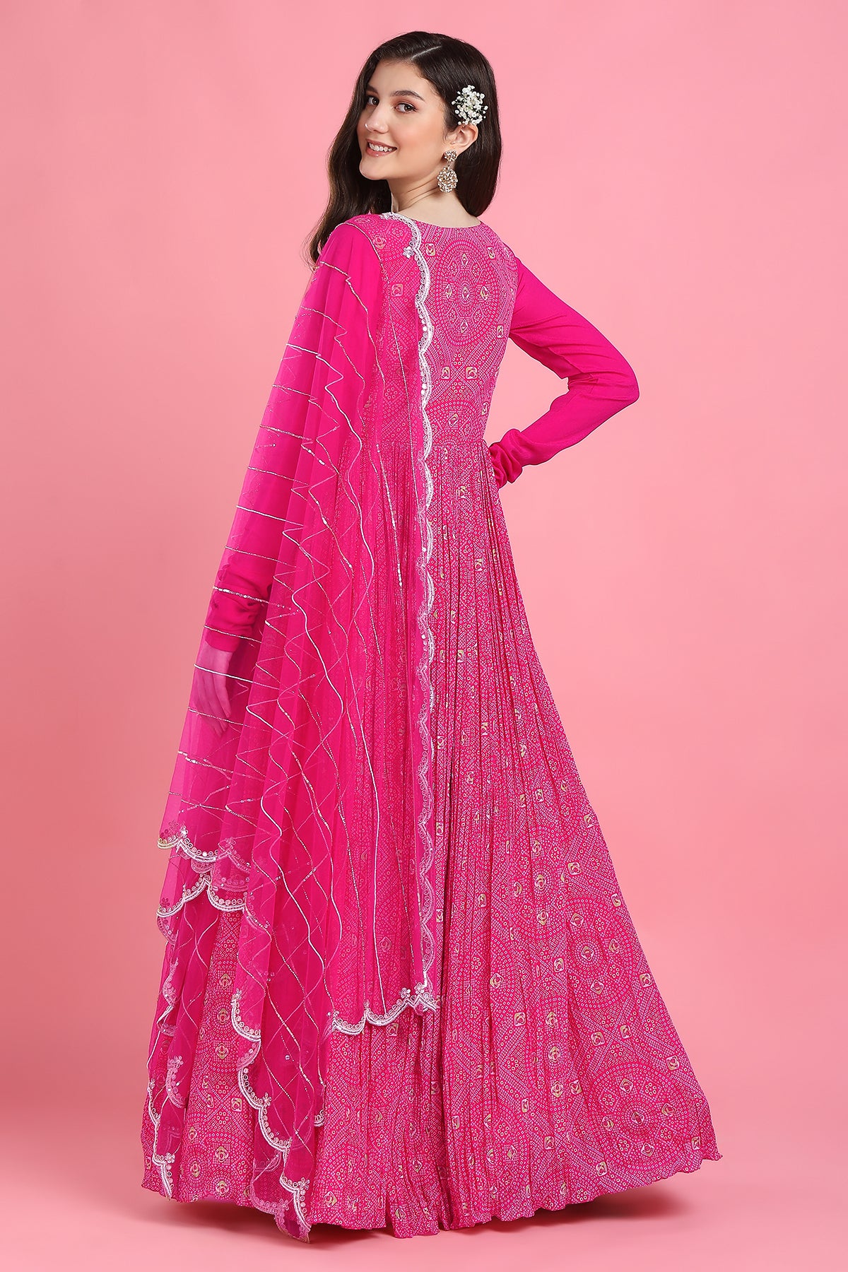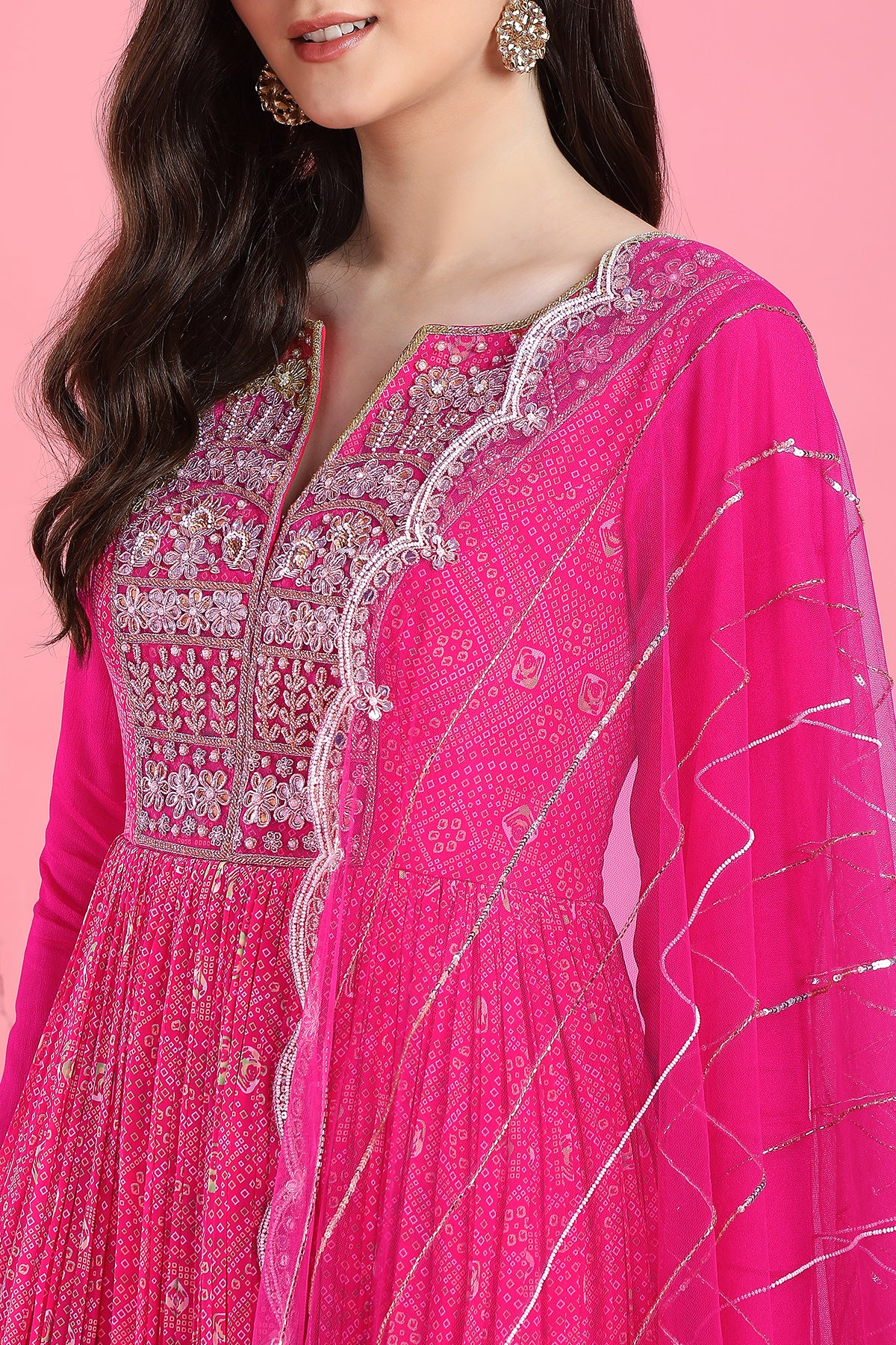 Pink yoke bandhni anarkali