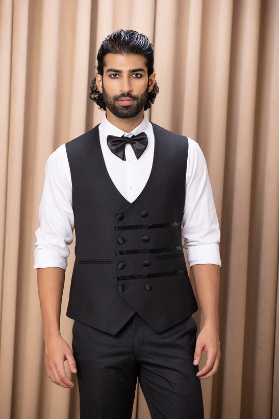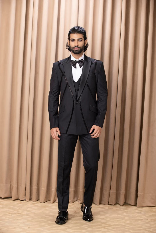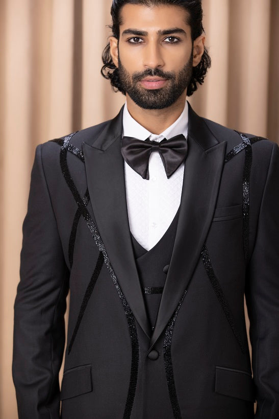 | Featuring a bespoke hand embroidered black tuxedo set with peak lapels and intricate detailing. Perfect for the classy events for you. This includes a black jacket, embroidered waistcoat and black trousers. |