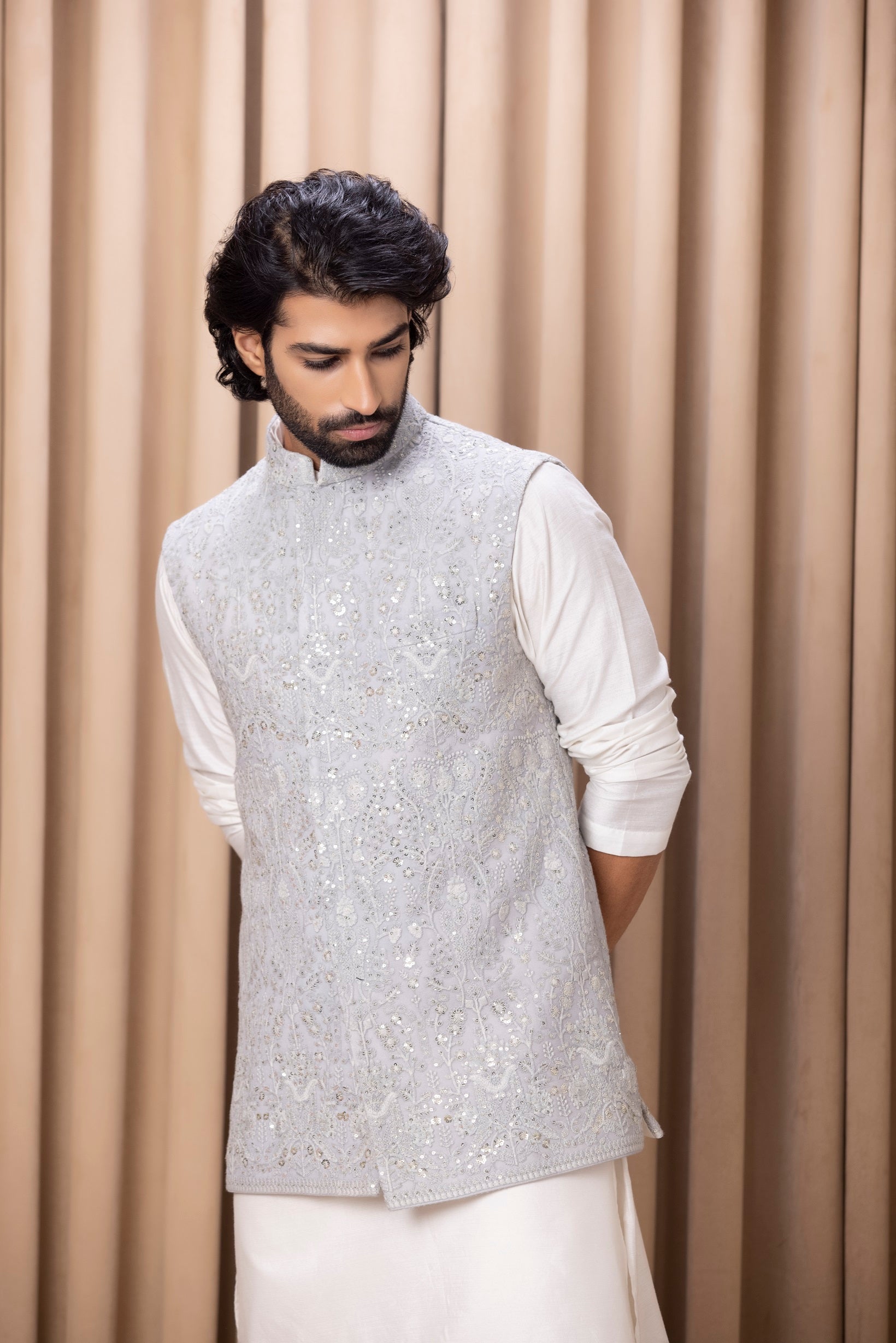 | Featuring a traditional lucknowi steel grey nehru jacket with delicate thread and sequence embroidery. Perfect for any indoor or outdoor occasion. Pair it up with Ankit V Kapoor's ivory Kurta Set |