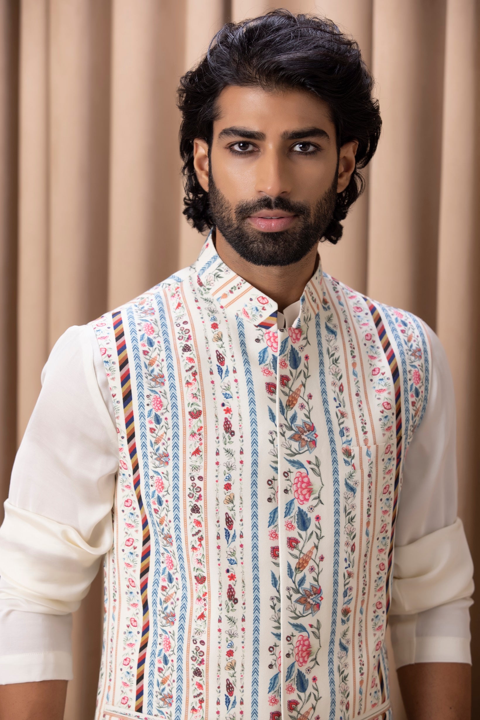 | Featuring a contemporary printed ivory nehru jacket with delicate hand painted designed motifs. Perfect for any indoor or outdoor occasion. Pair it up with Ankit V Kapoor's ivory Kurta Set |