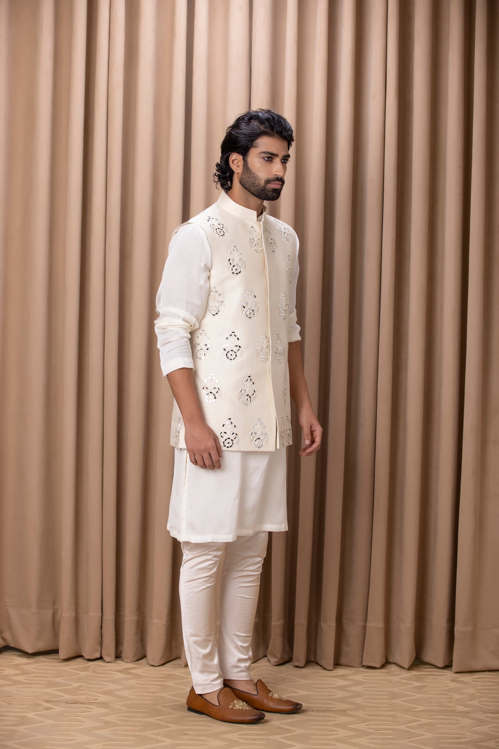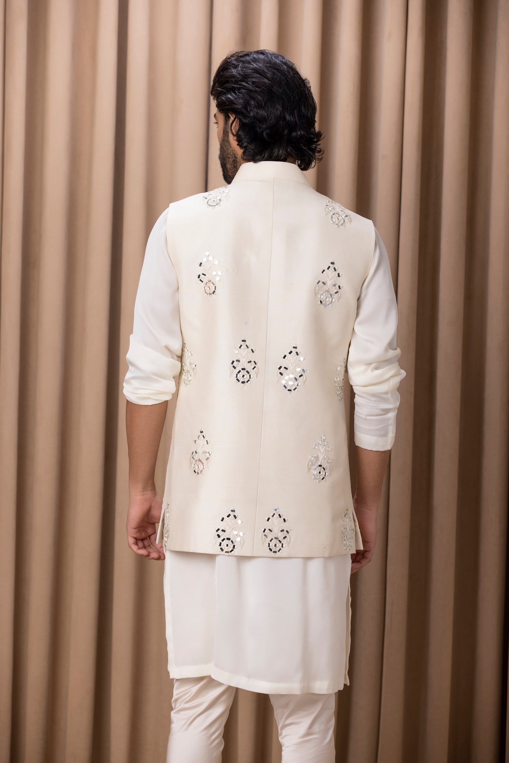 Featuring an uber classy orignal hand embroidered mirror nehru jacket with an elegant design and intricate details. Perfect for any indoor or outdoor occasion. Pair it up with Ankit V Kapoor's ivory Kurta Set