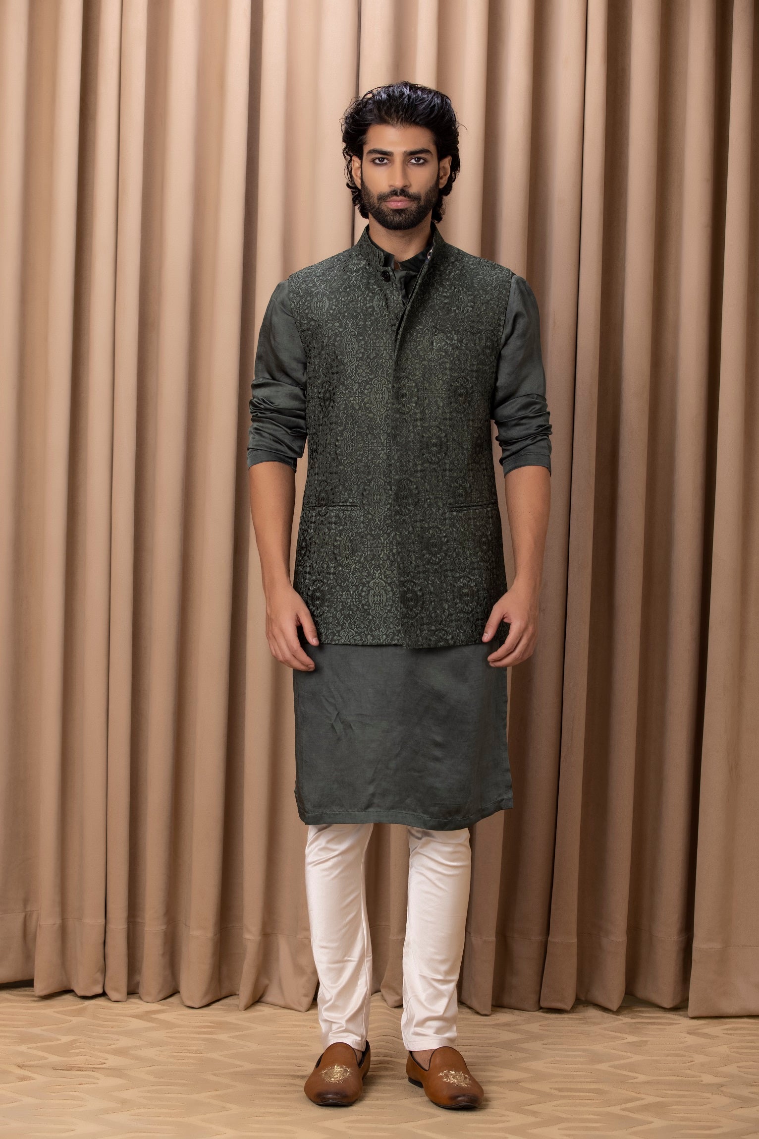 | Featuring a bespoke thread work olive green nehru jacket with delicate thread embroidery and minimal details. Perfect for an outdoor occcasion. Pair this with a plain olive green cotton silk kurta and ivory churidaar. |