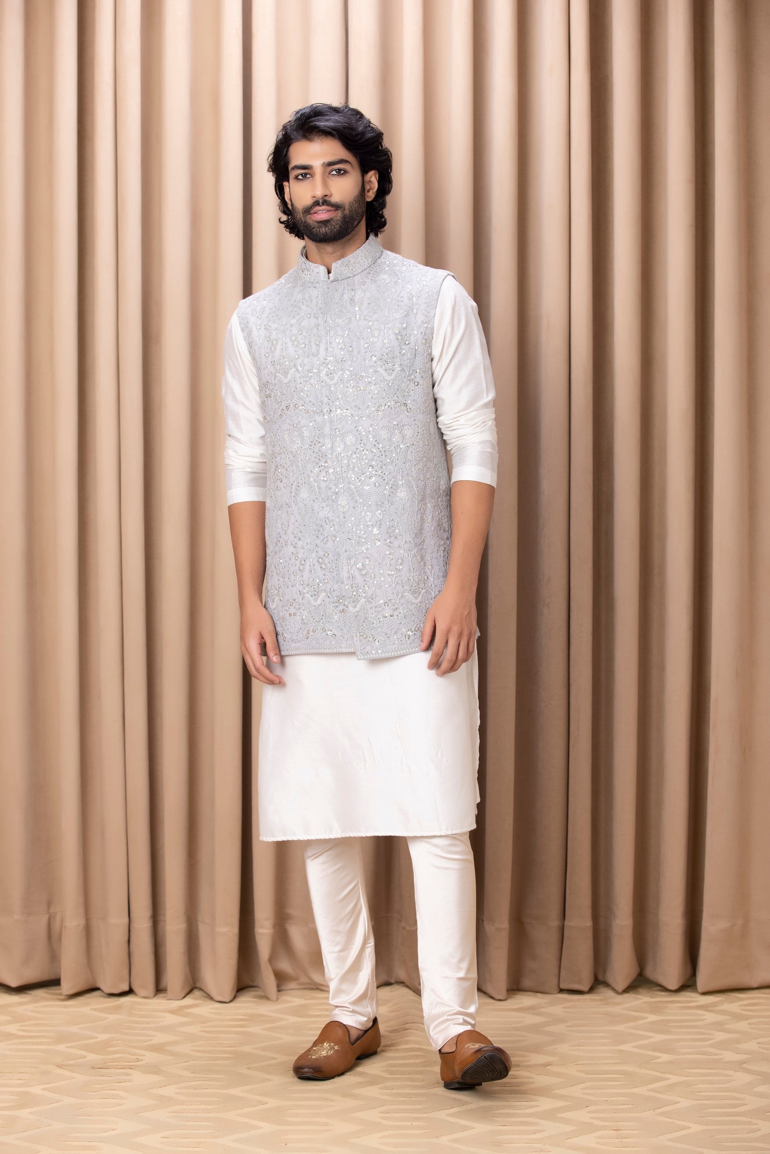 | Featuring a traditional lucknowi steel grey nehru jacket with delicate thread and sequence embroidery. Perfect for any indoor or outdoor occasion. Comes with Ankit V Kapoor's ivory Kurta Set |