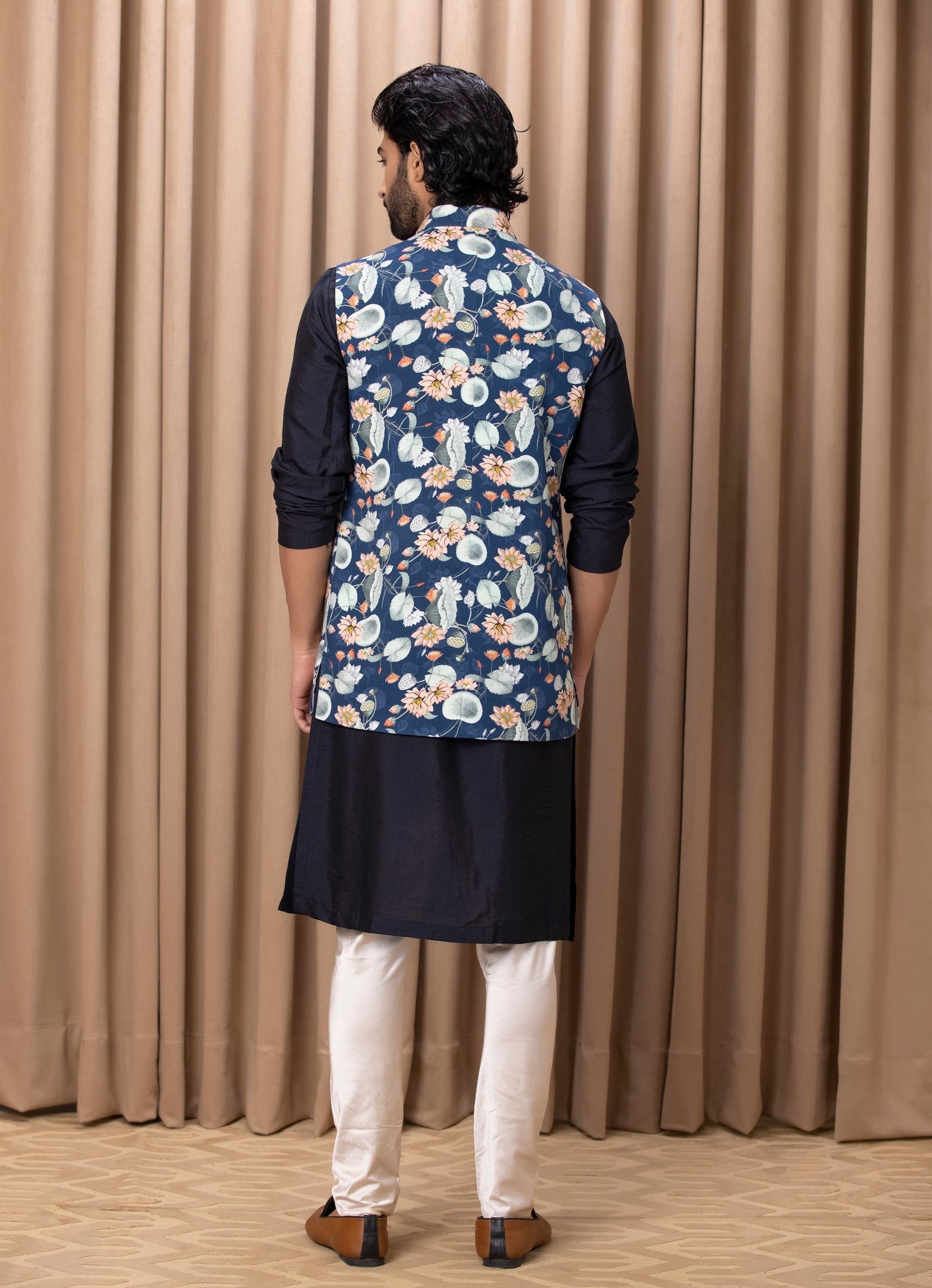 | Featuring a contemporary printed blue nehru jacket with delicate hand painted designed motifs. Perfect for any indoor or outdoor occasion. Comes with Ankit V Kapoor's blue Kurta Set |