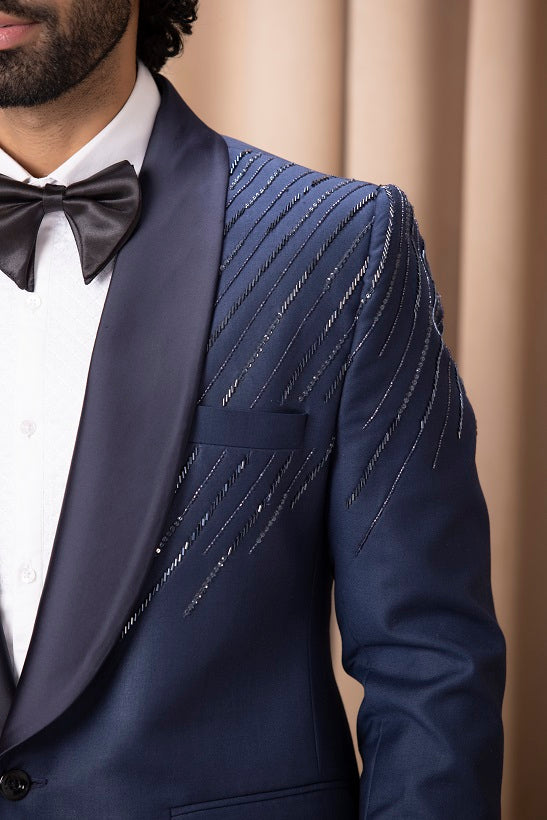 | Featuring a bespoke hand embroidered blue tuxedo set with shawl collar and intricate detailing. Perfect for the classy events for you. This includes a blue jacket and black trousers. |