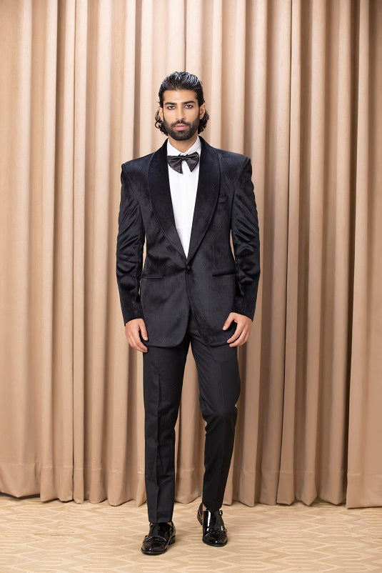 | Featuring a bespoke black velvet tuxedo set with shawl collar and intricate detailing. Perfect for the classy events for you. This includes a black jacket and black trousers. |