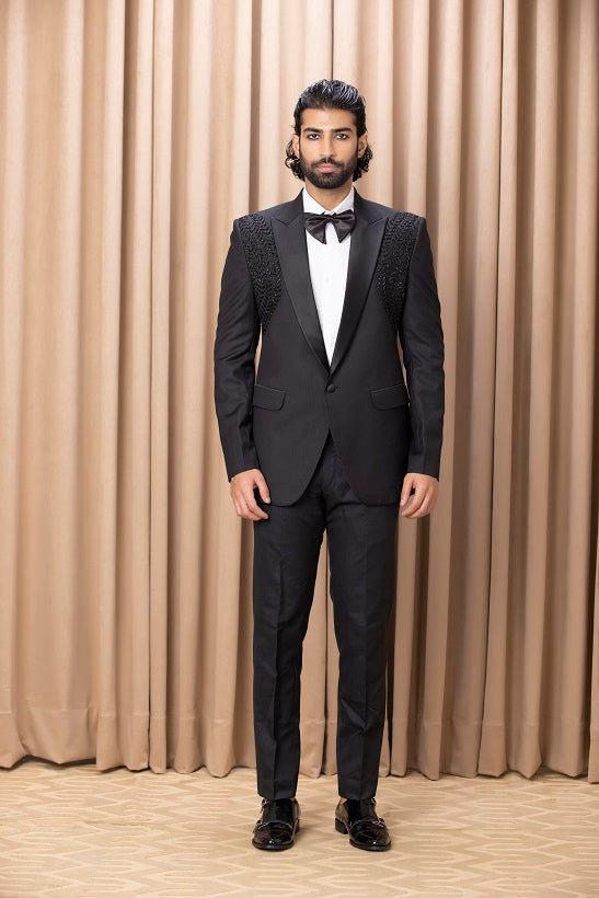 | Featuring a bespoke hand embroidered black tuxedo set with peak lapels and intricate detailing. Perfect for the classy events for you. This includes a black jacket and black trousers. |