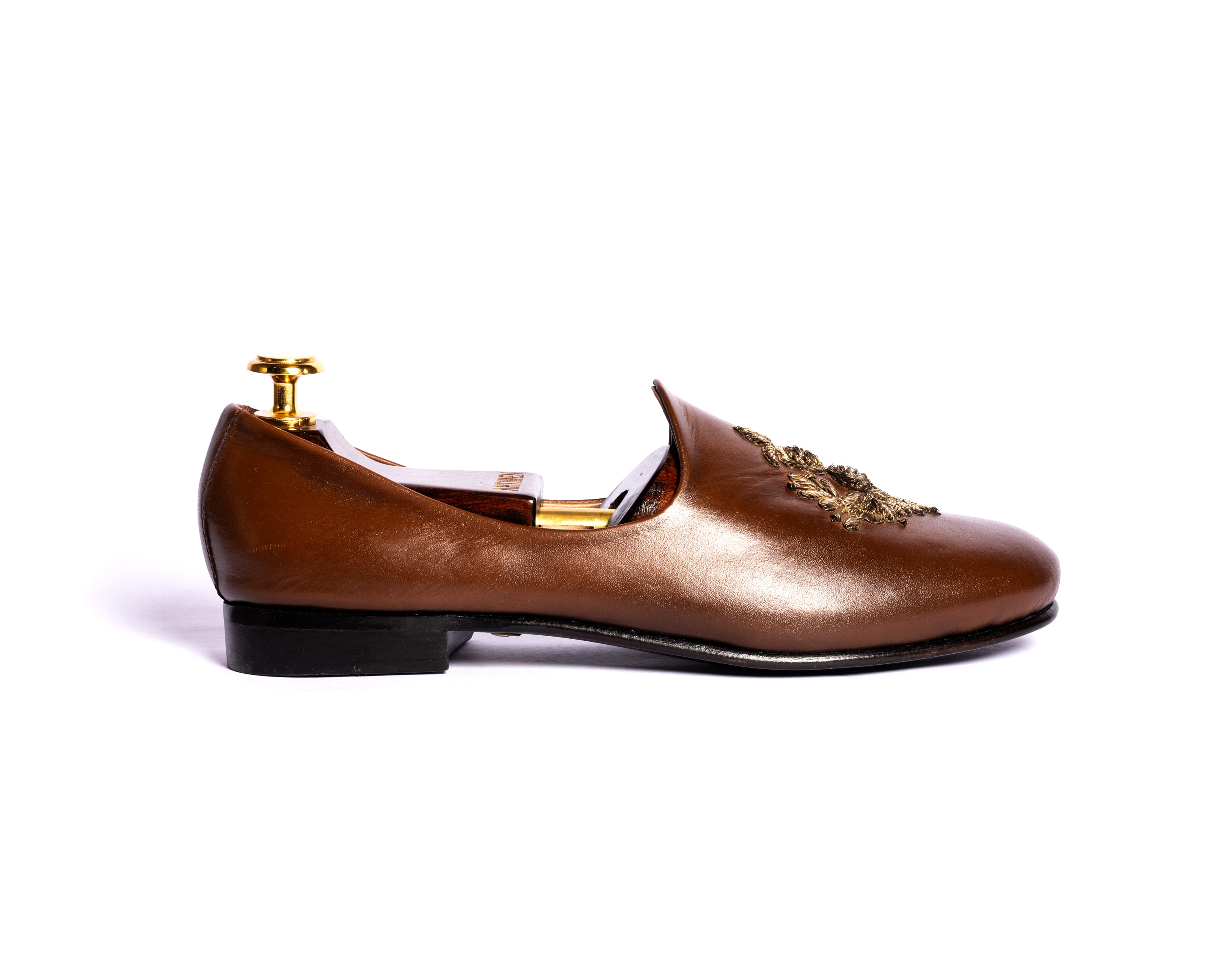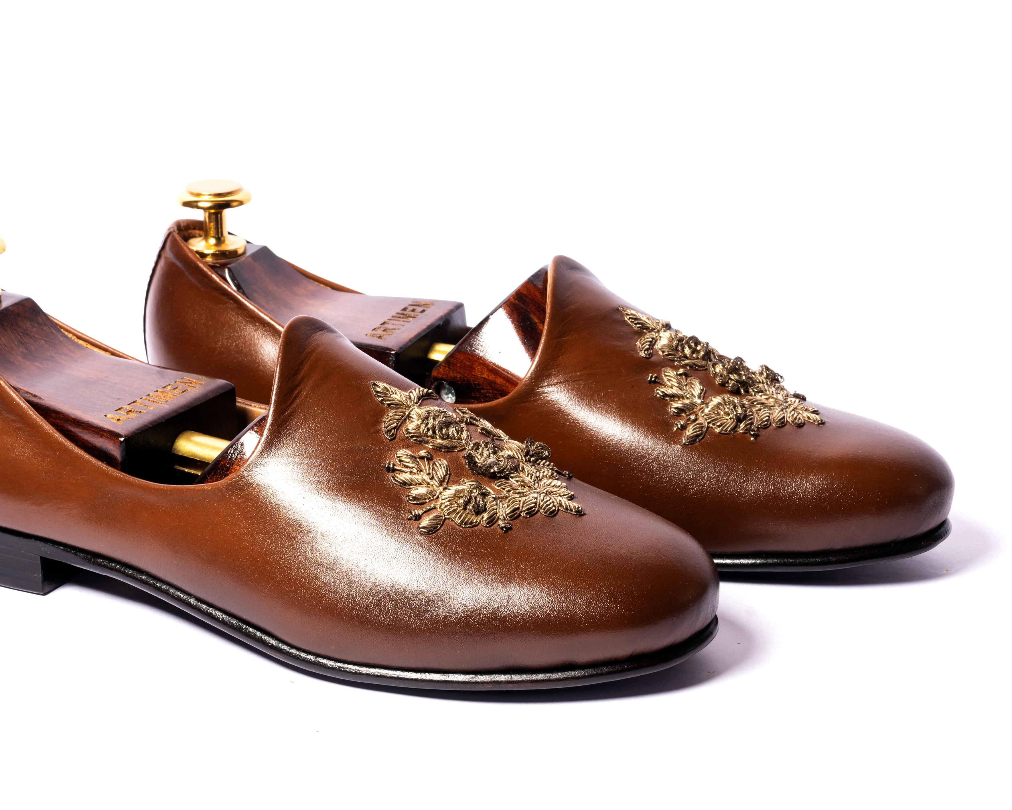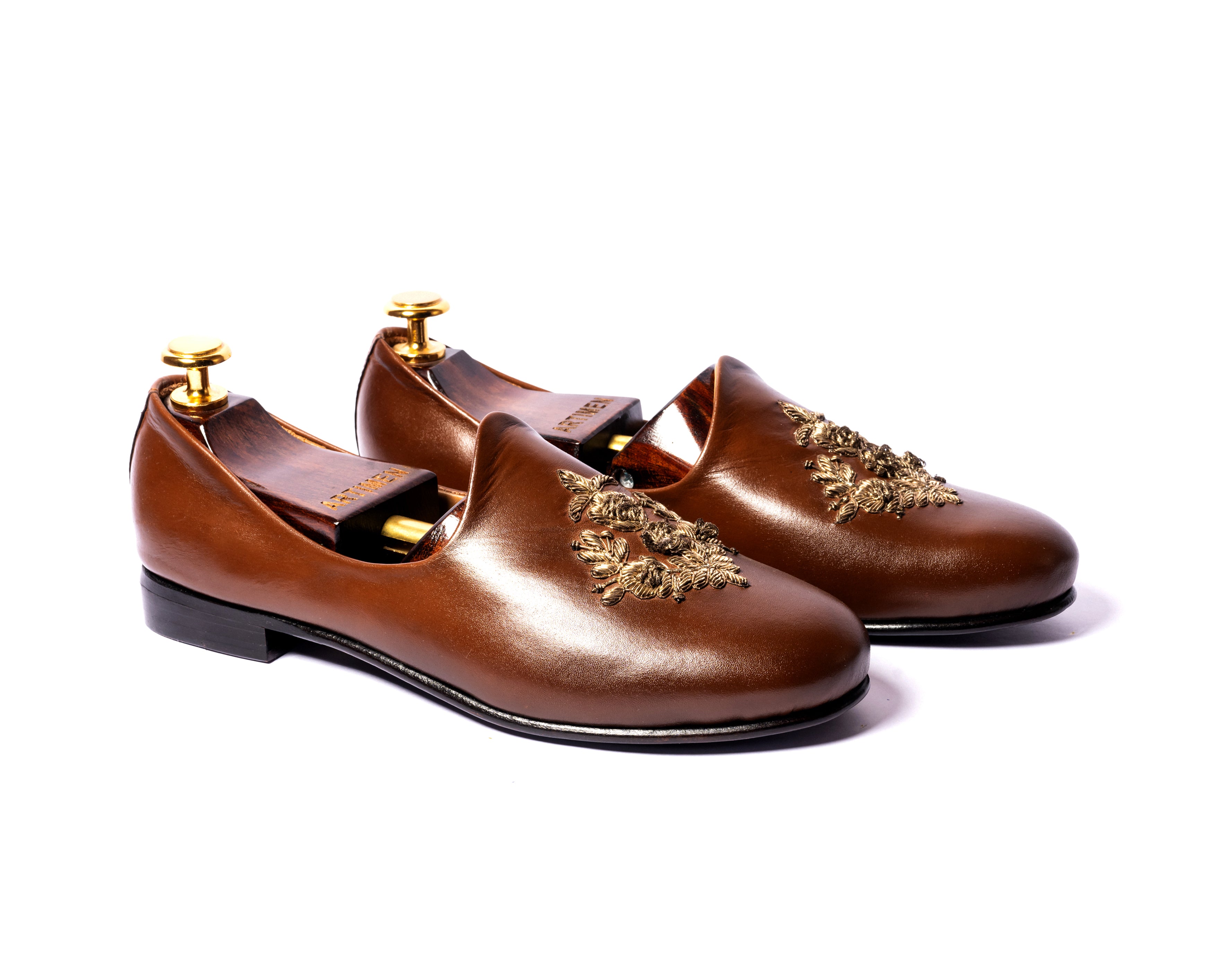 | BALTAN DAB JUTTI One of the hottest selling, most loved and appreciated pair. This Jutti shoe with a HAND EMBROIDERED motif has been a hit for all our clients across the world. Comfort and class at its best. Little away from the old school, this jutti shoe gives you the look and comfort of a loafer. Dabka hand work on these gives it the classy look. |