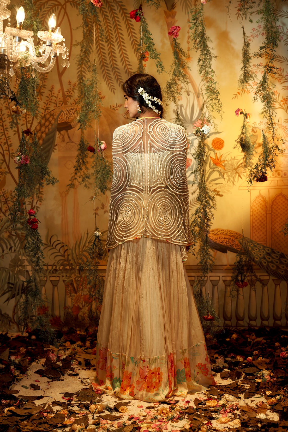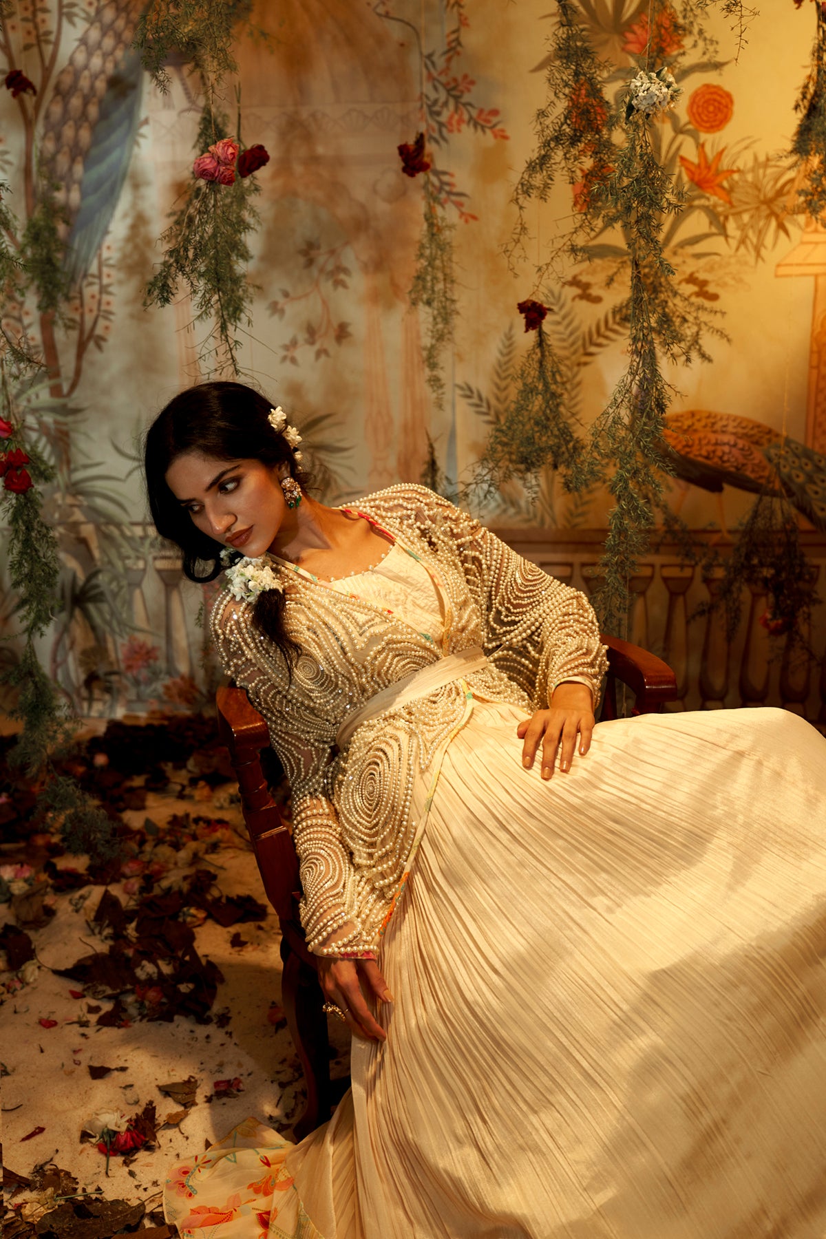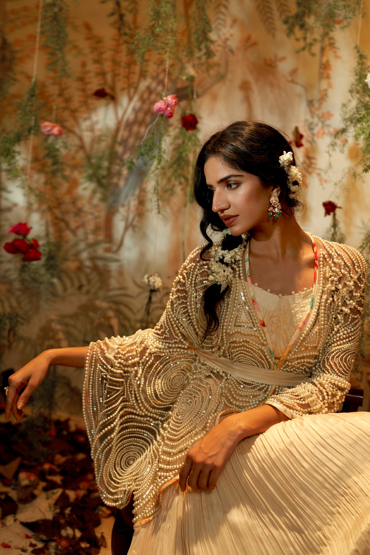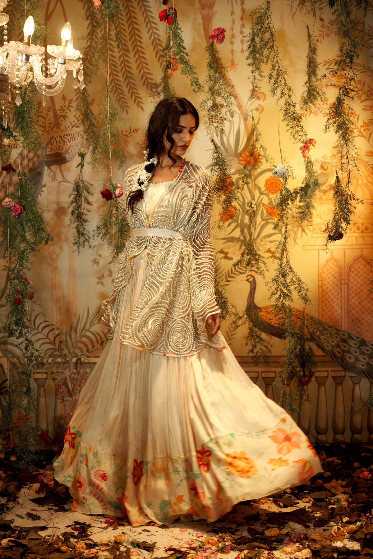 Featuring a ivory georgette lehenga. It is paired with a pure silk blouse & net dupatta.
